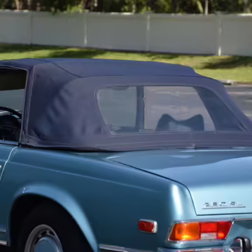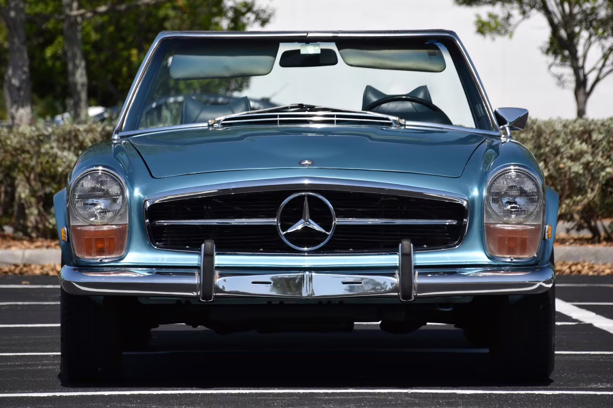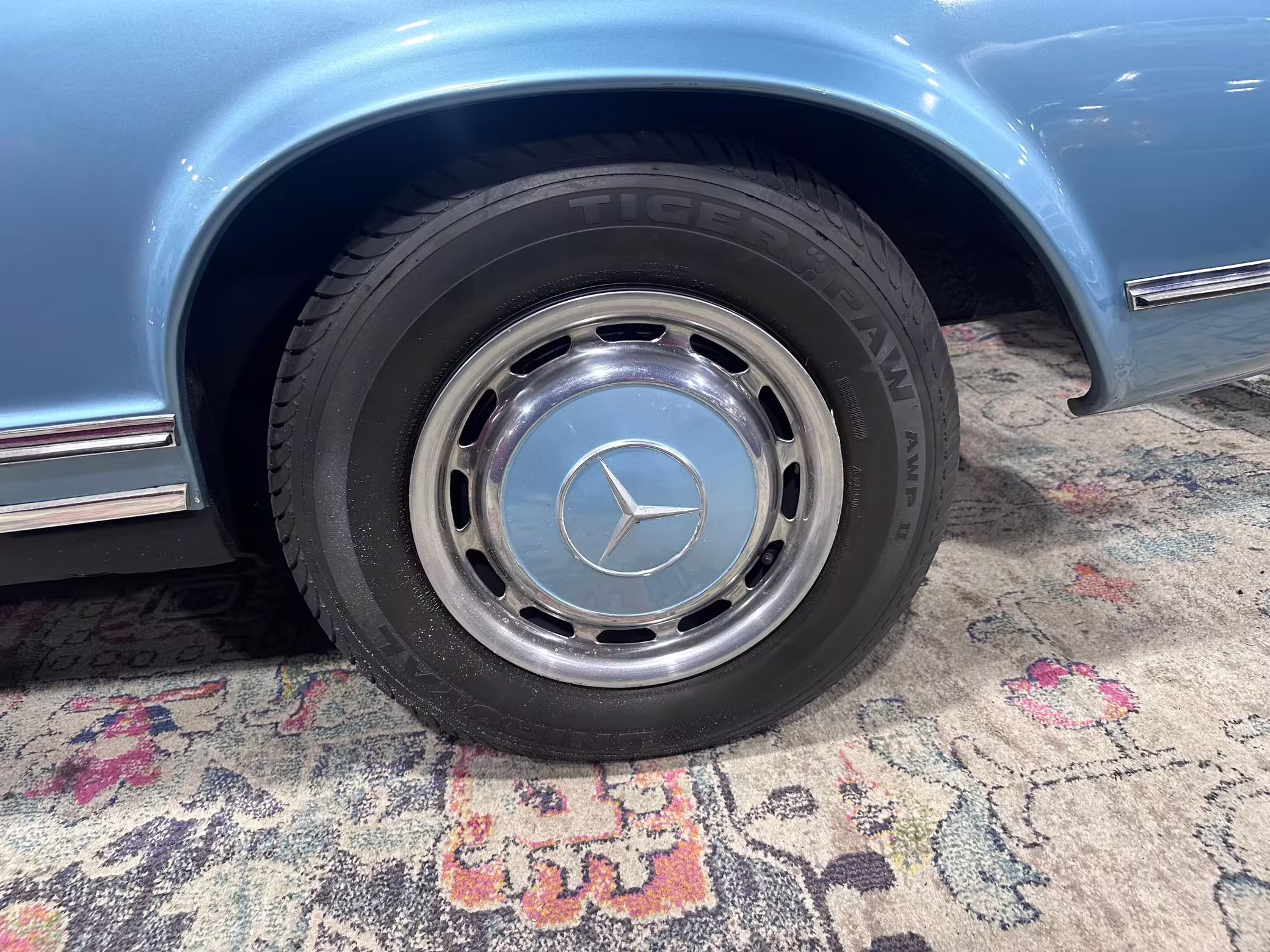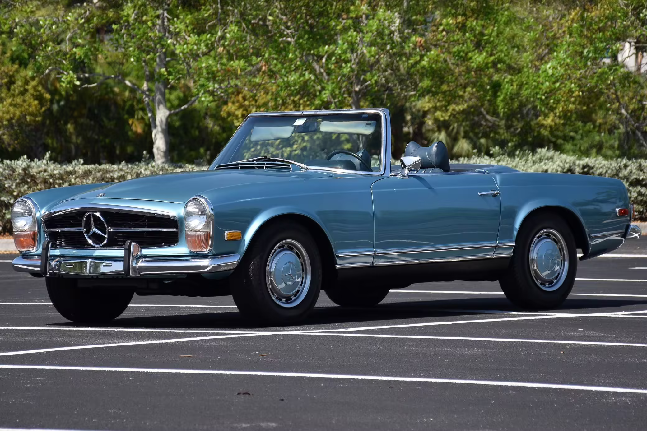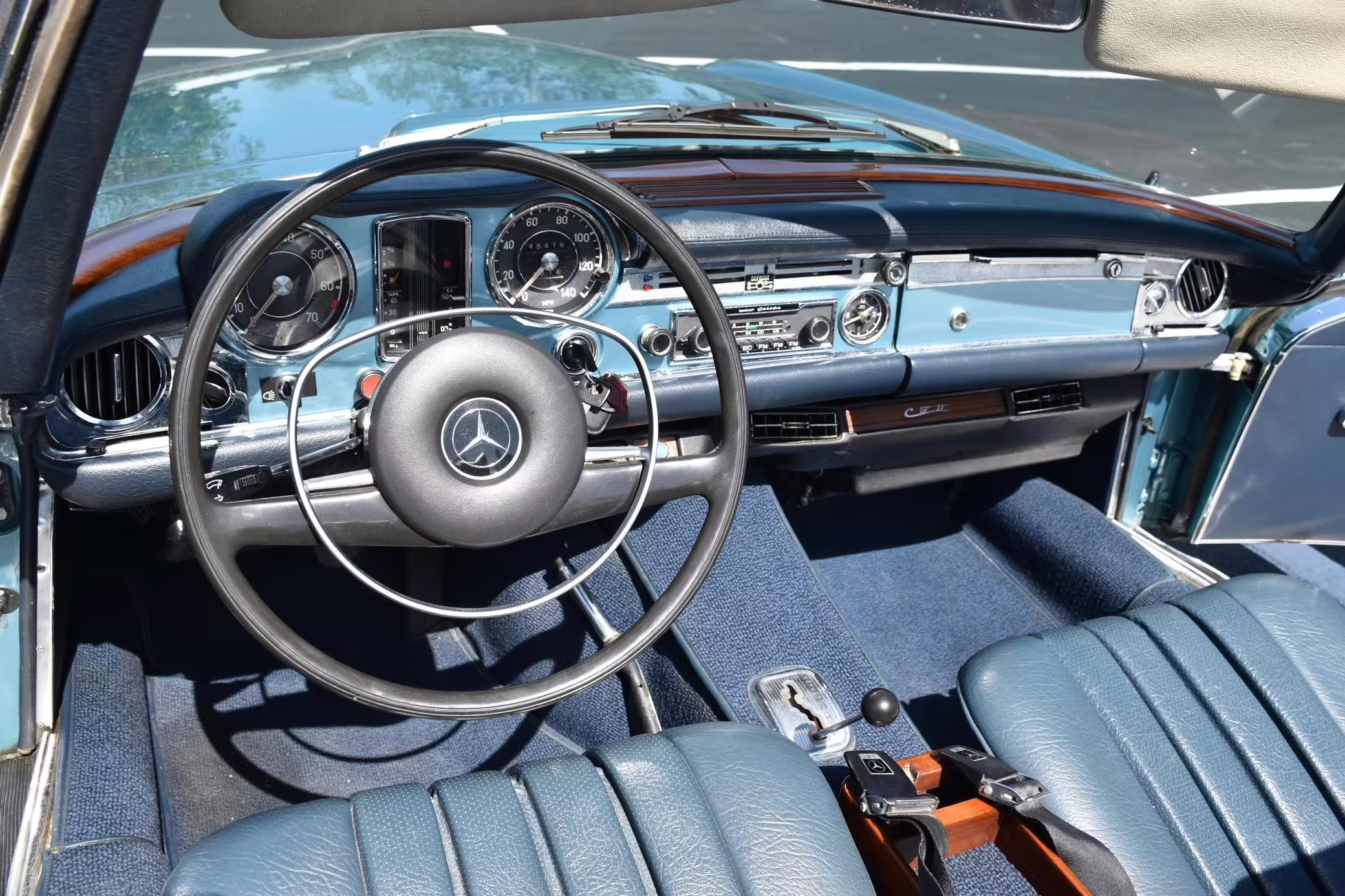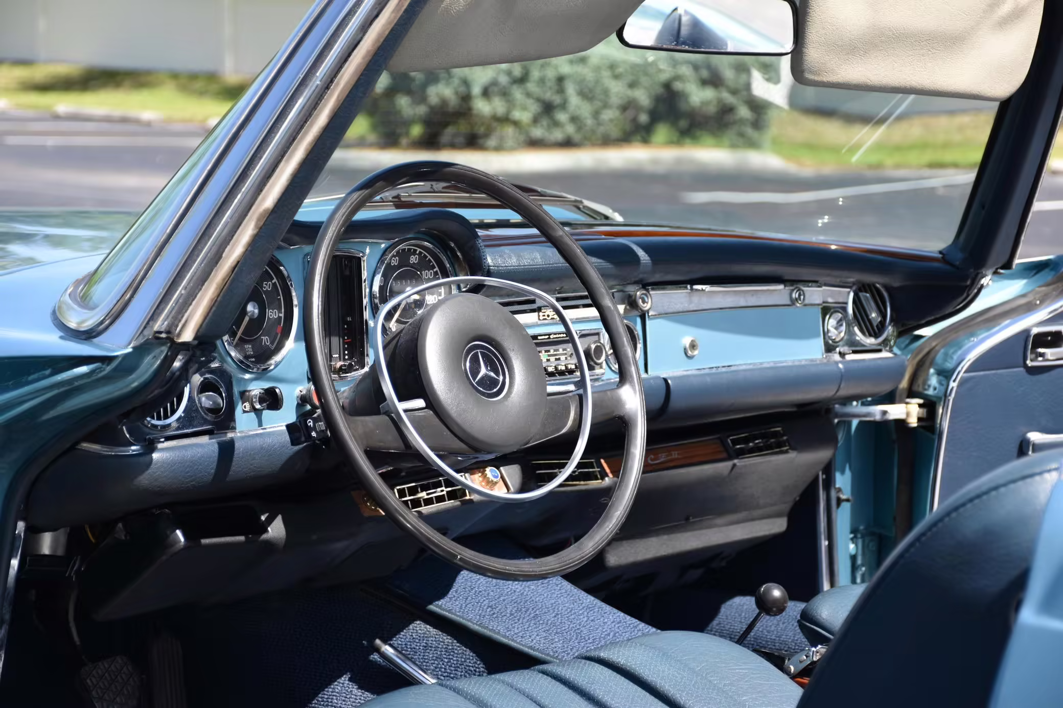 1971 Mercedes-Benz 280SL, finished in Horizon Blue with a body-colored hardtop, a dark blue soft top, and a blue interior.