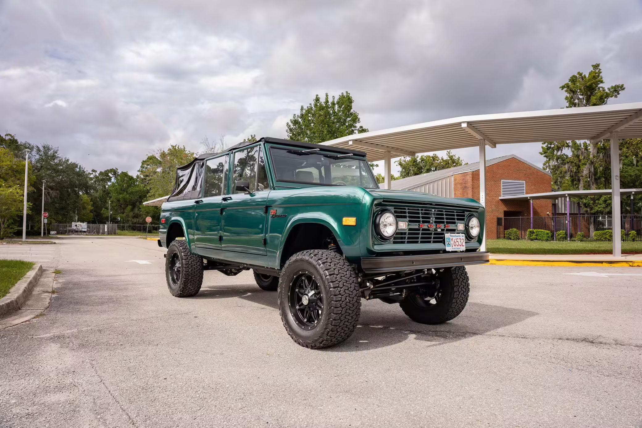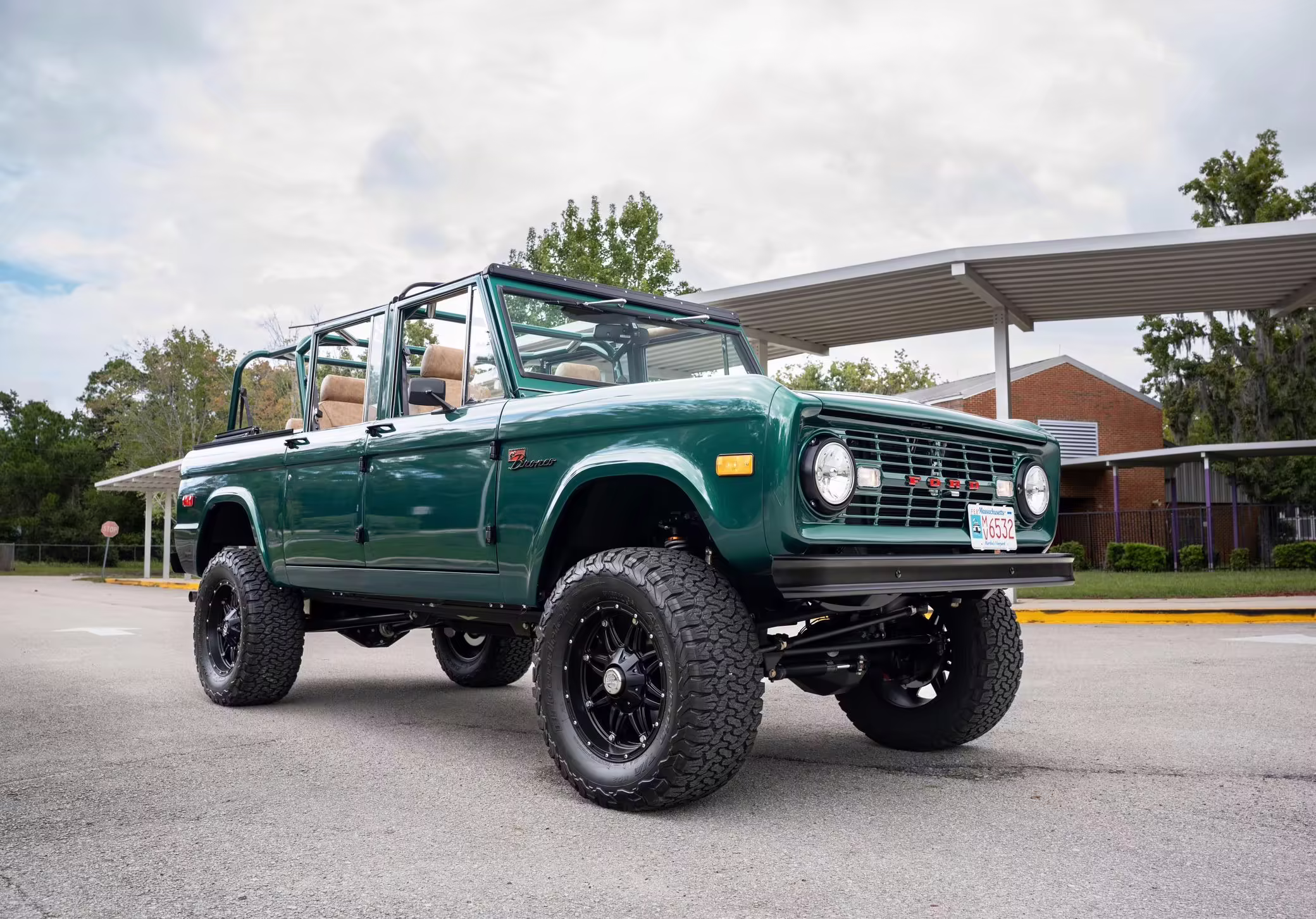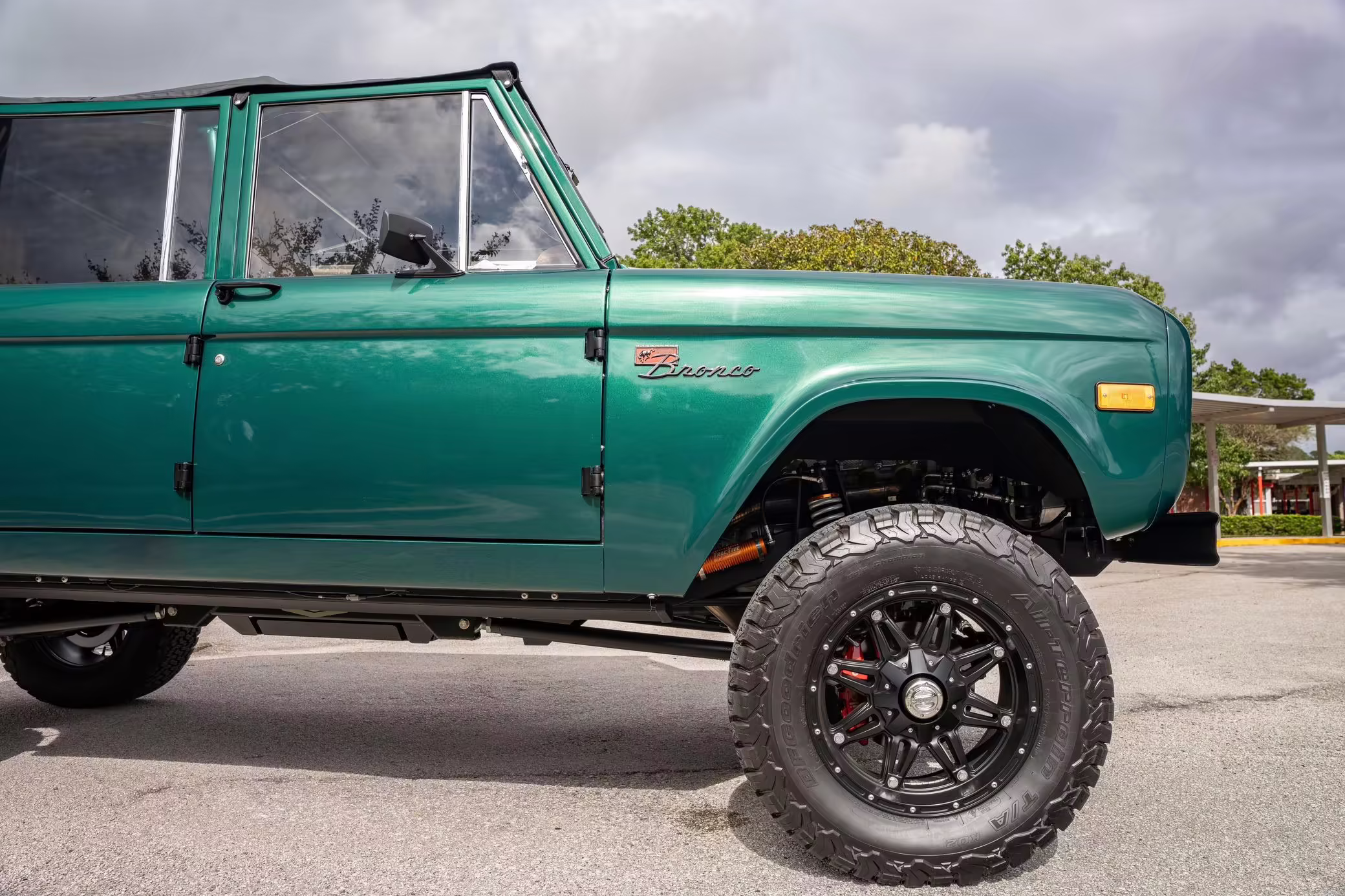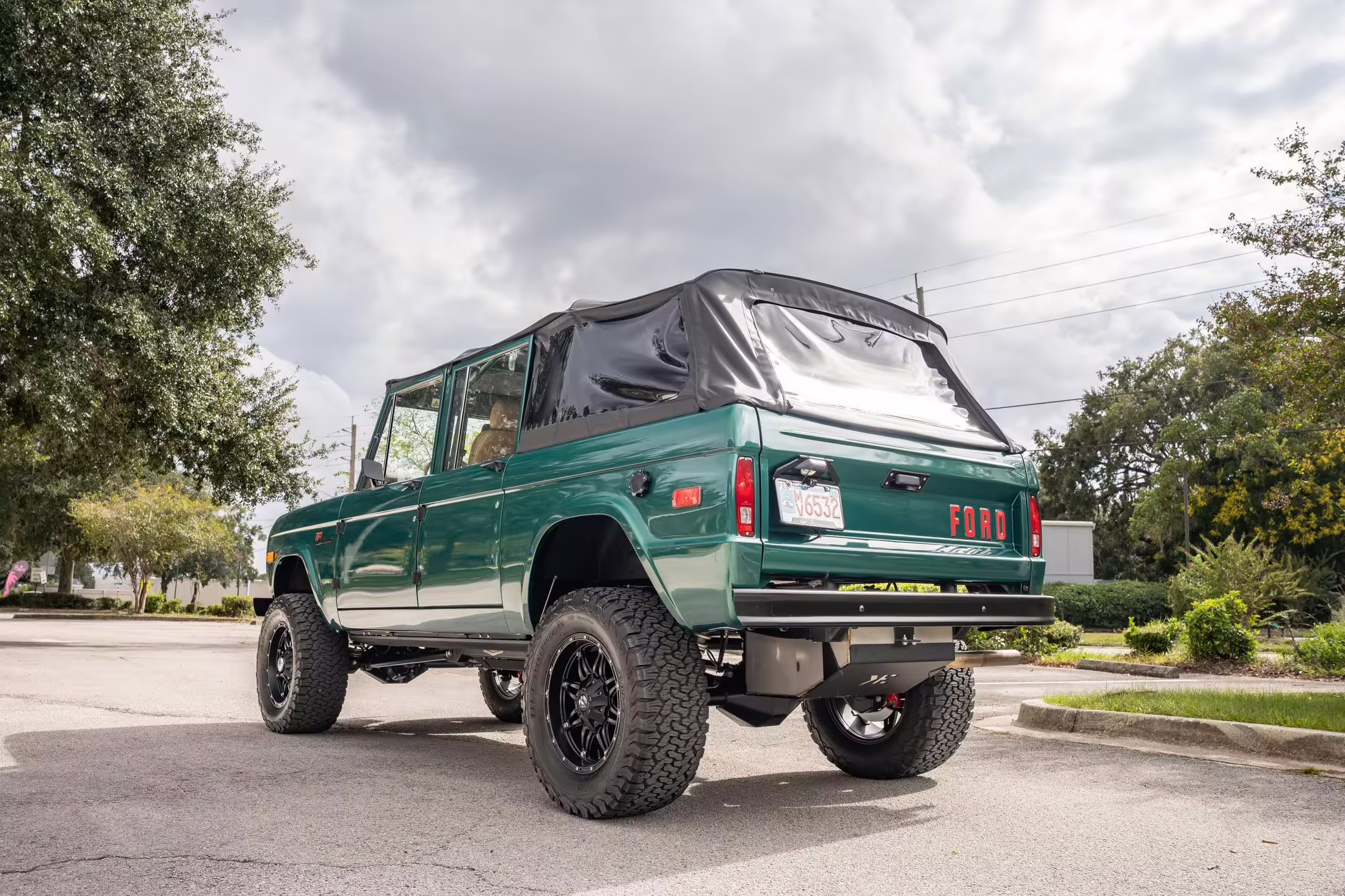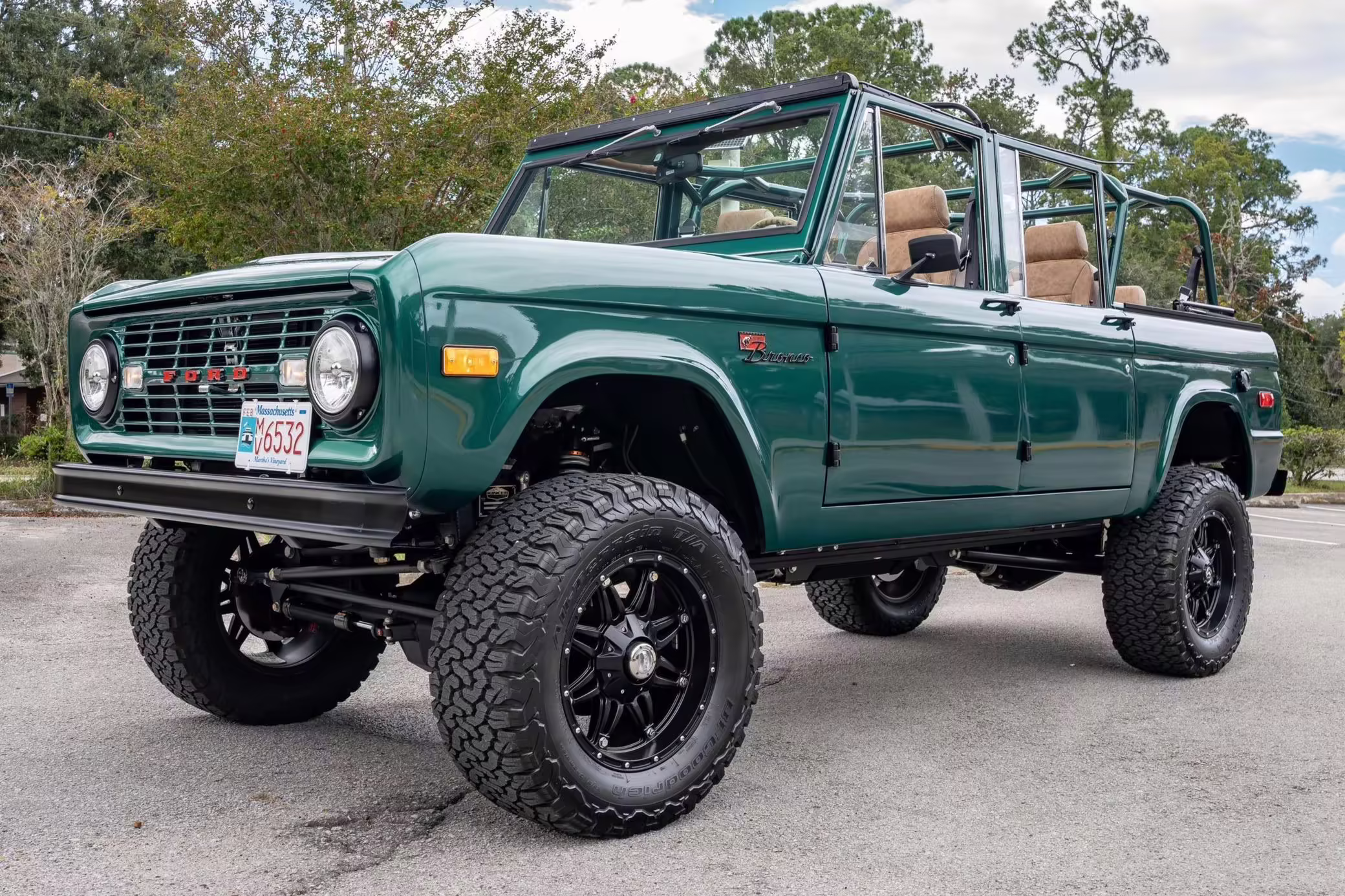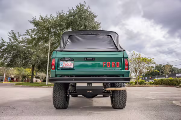 1972 Ford Bronco, finished in Dark Jade Metallic with a black soft top and a brown interior.