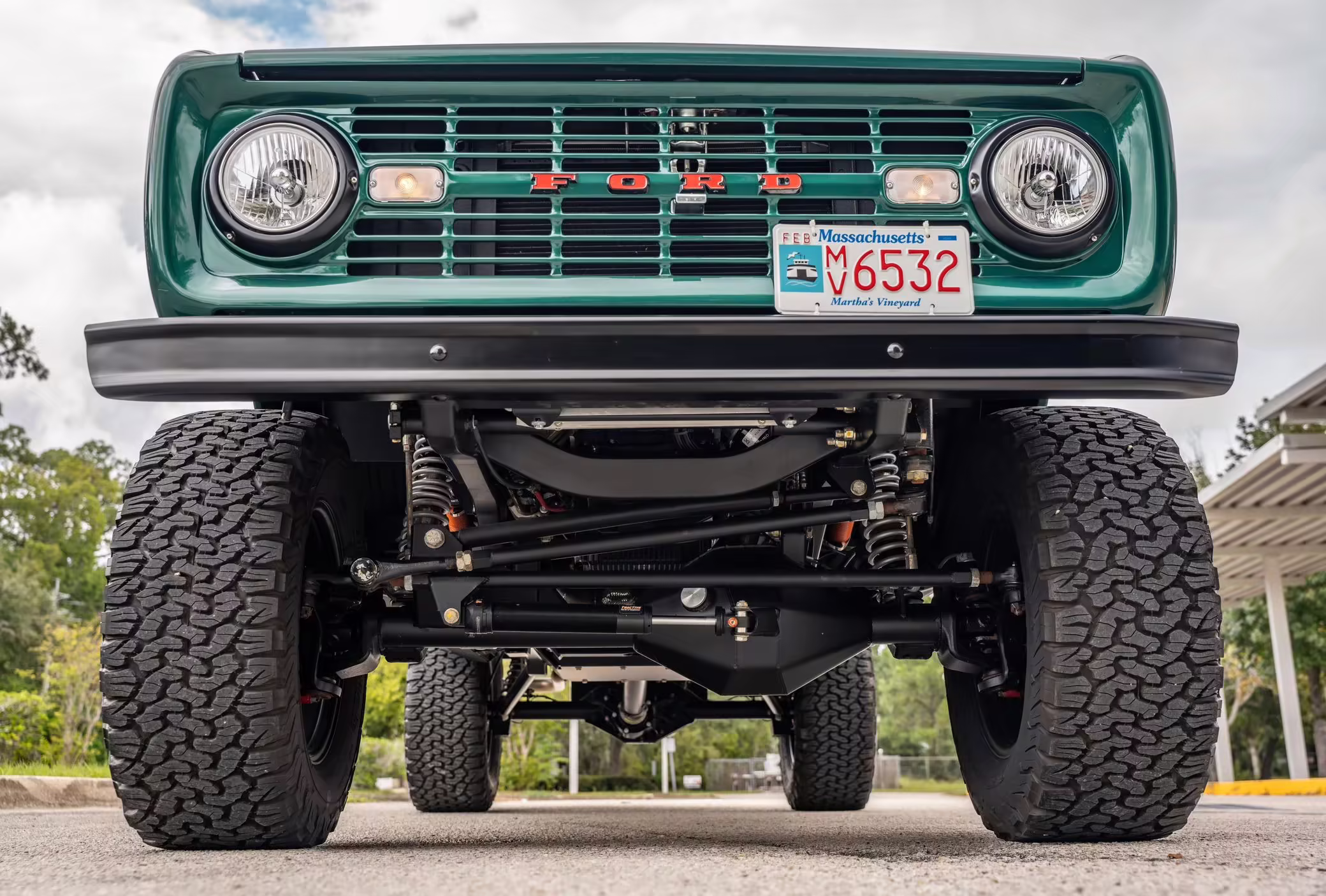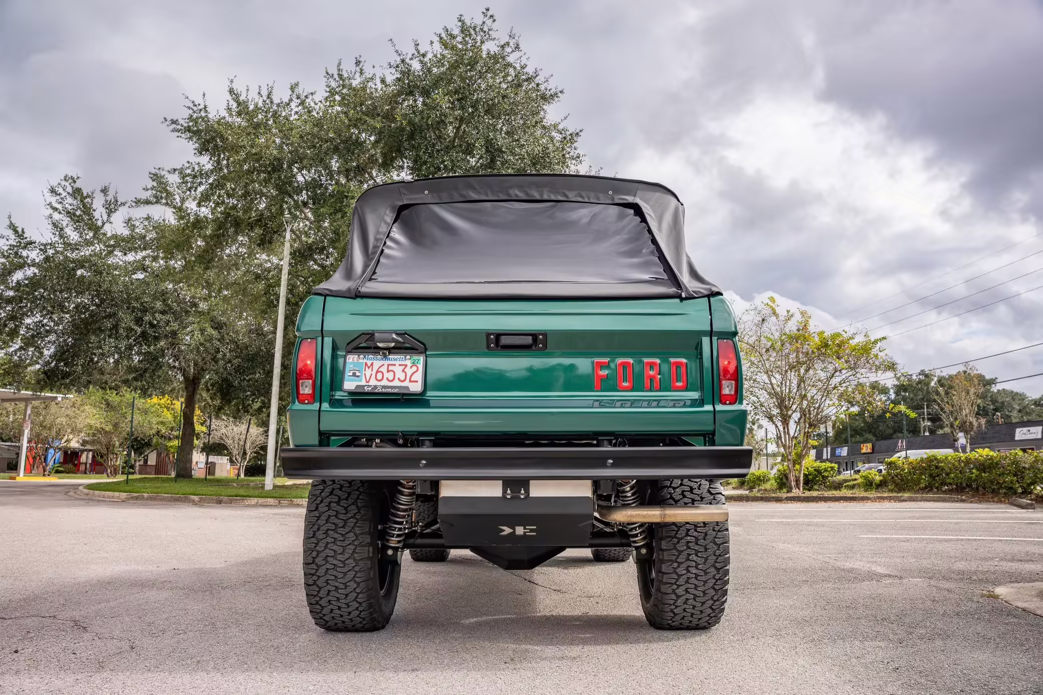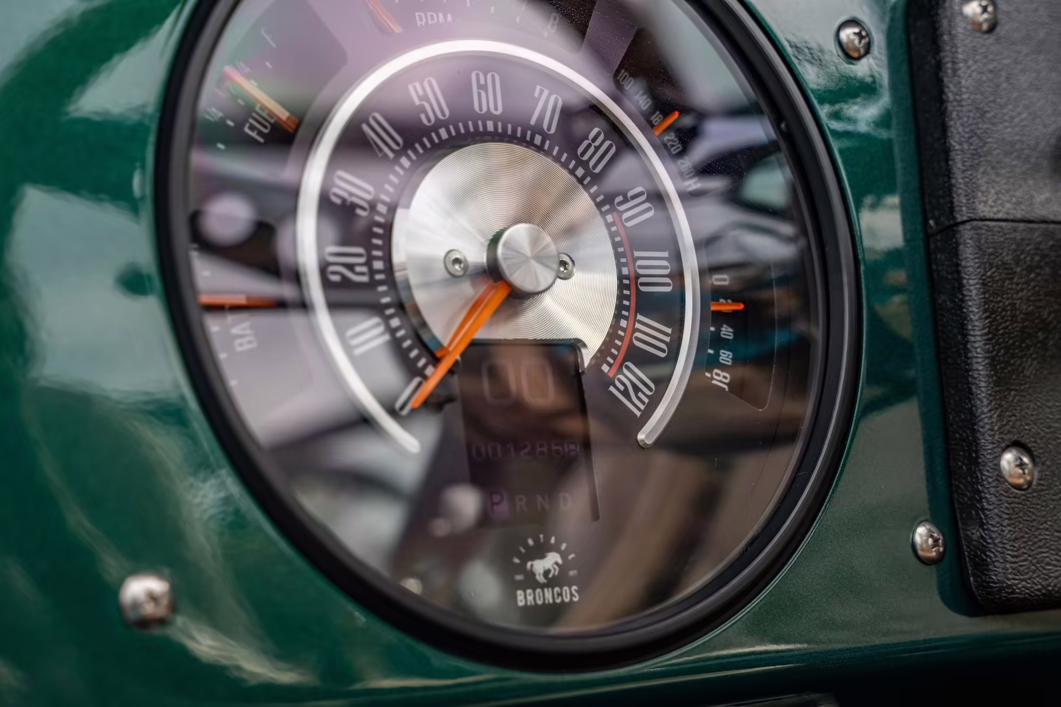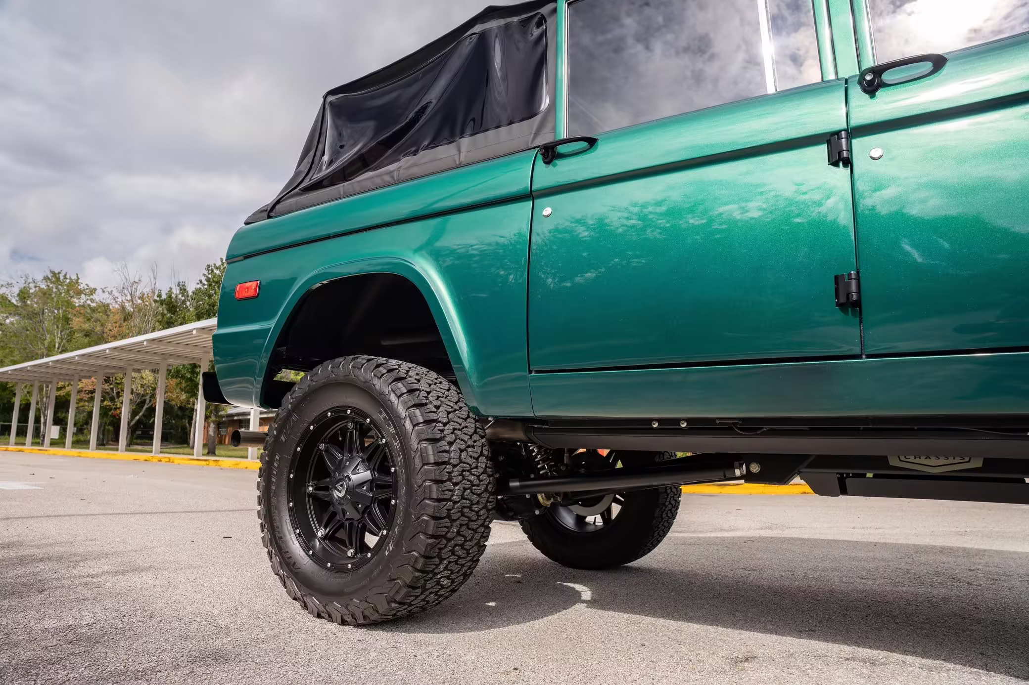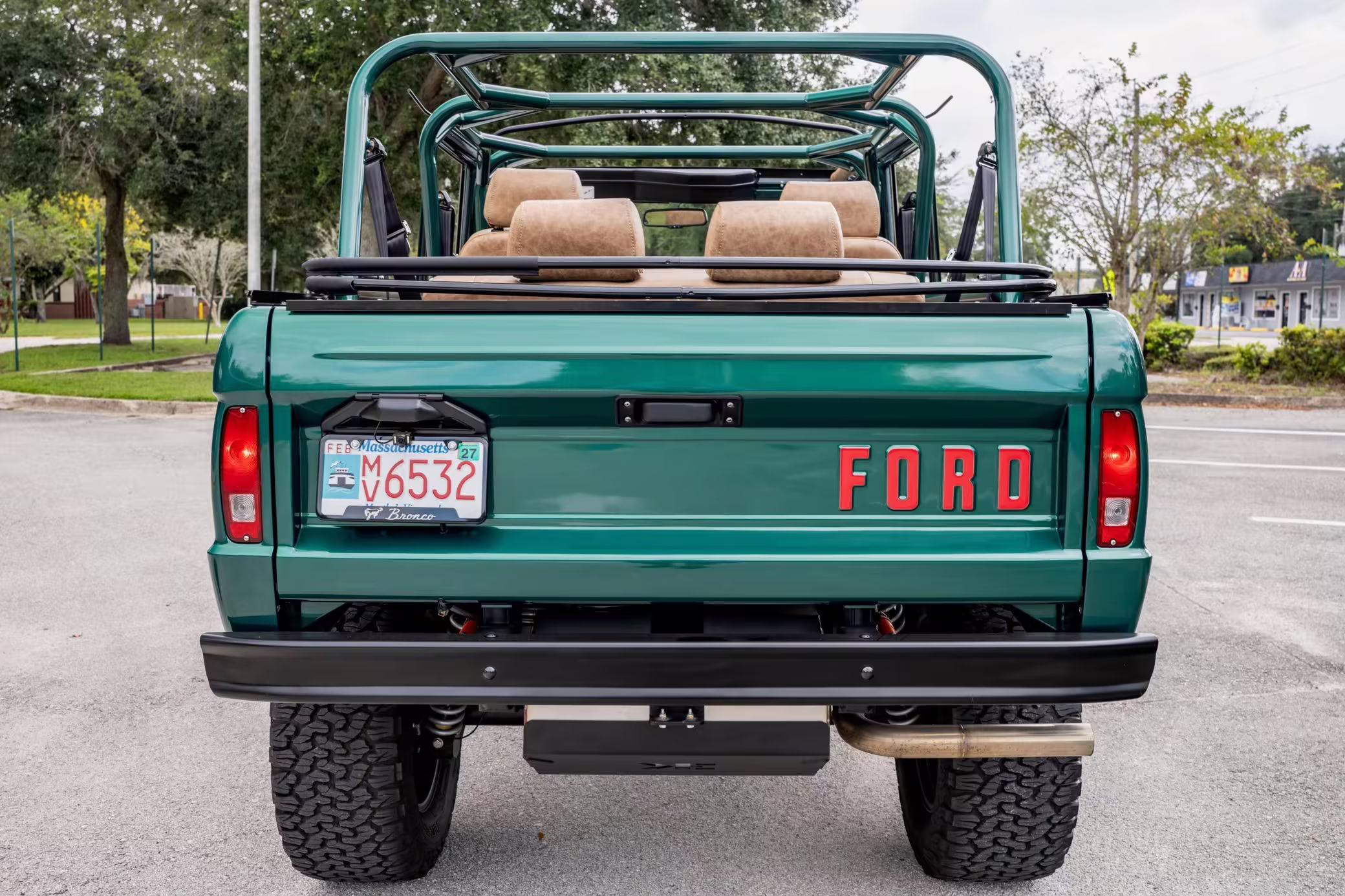 1972 Ford Bronco, finished in Dark Jade Metallic with a black soft top and a brown interior.