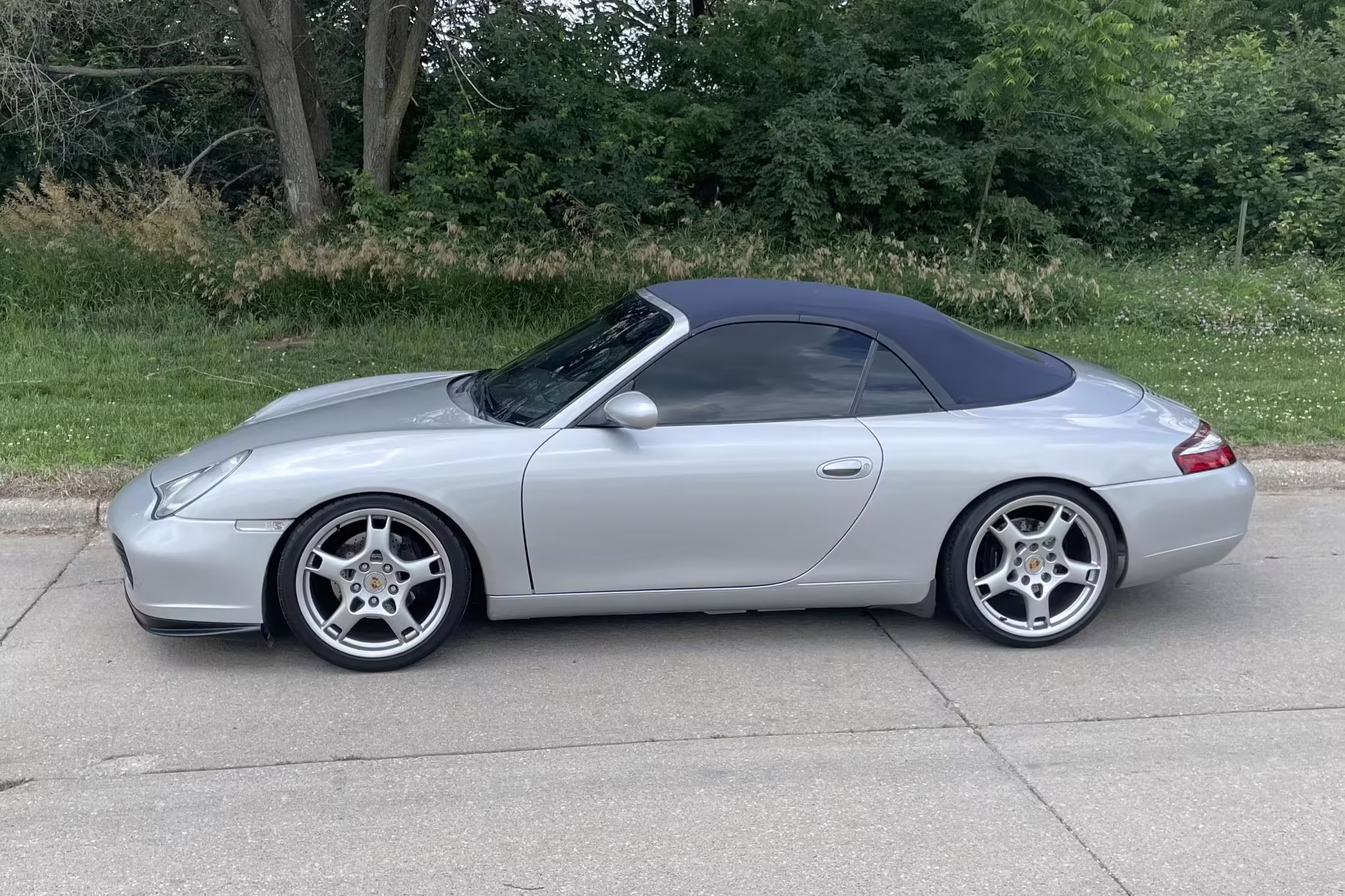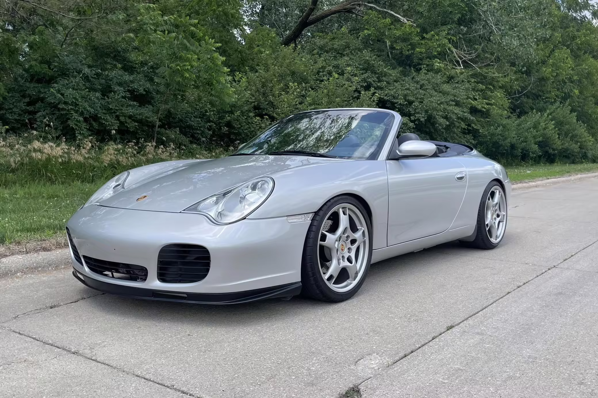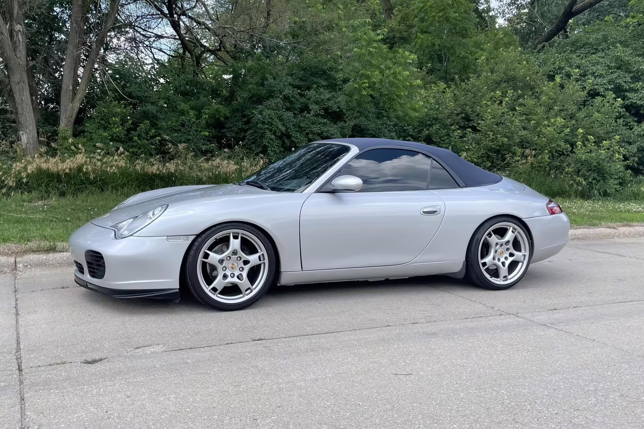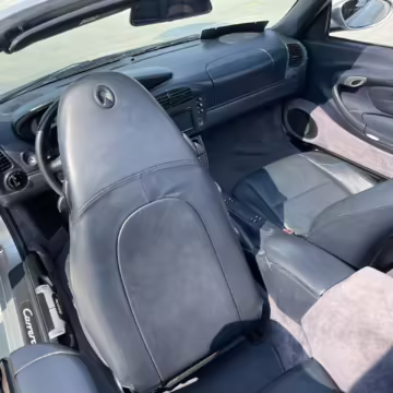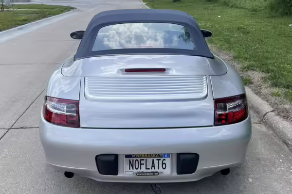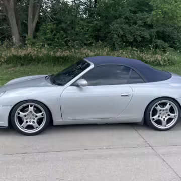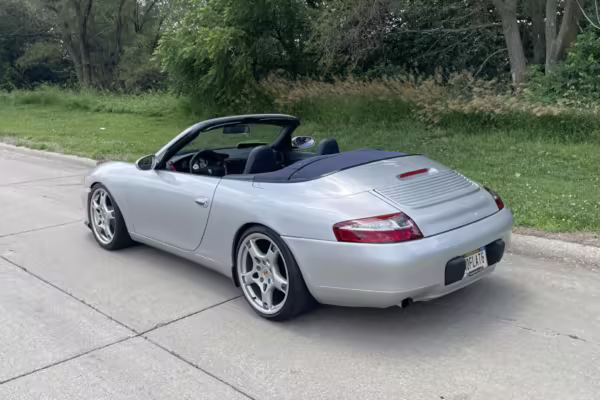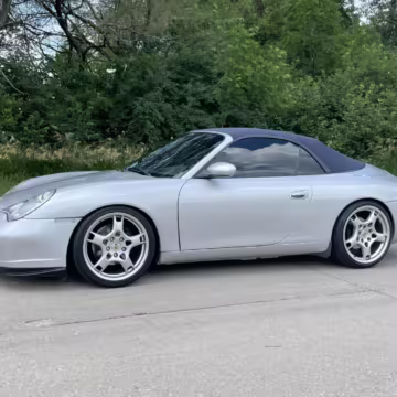 2000 Porsche 911 Carrera Cabriolet, finished in Arctic Silver with a blue soft top and a Metropol Blue interior.