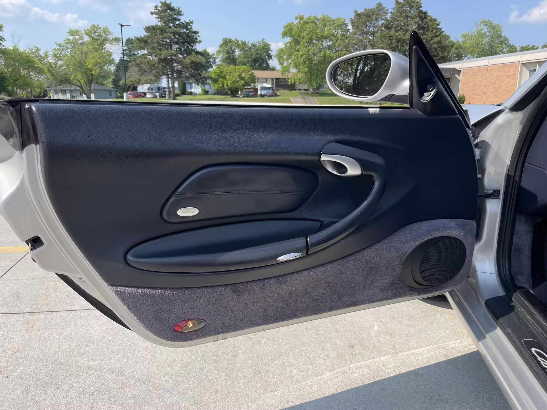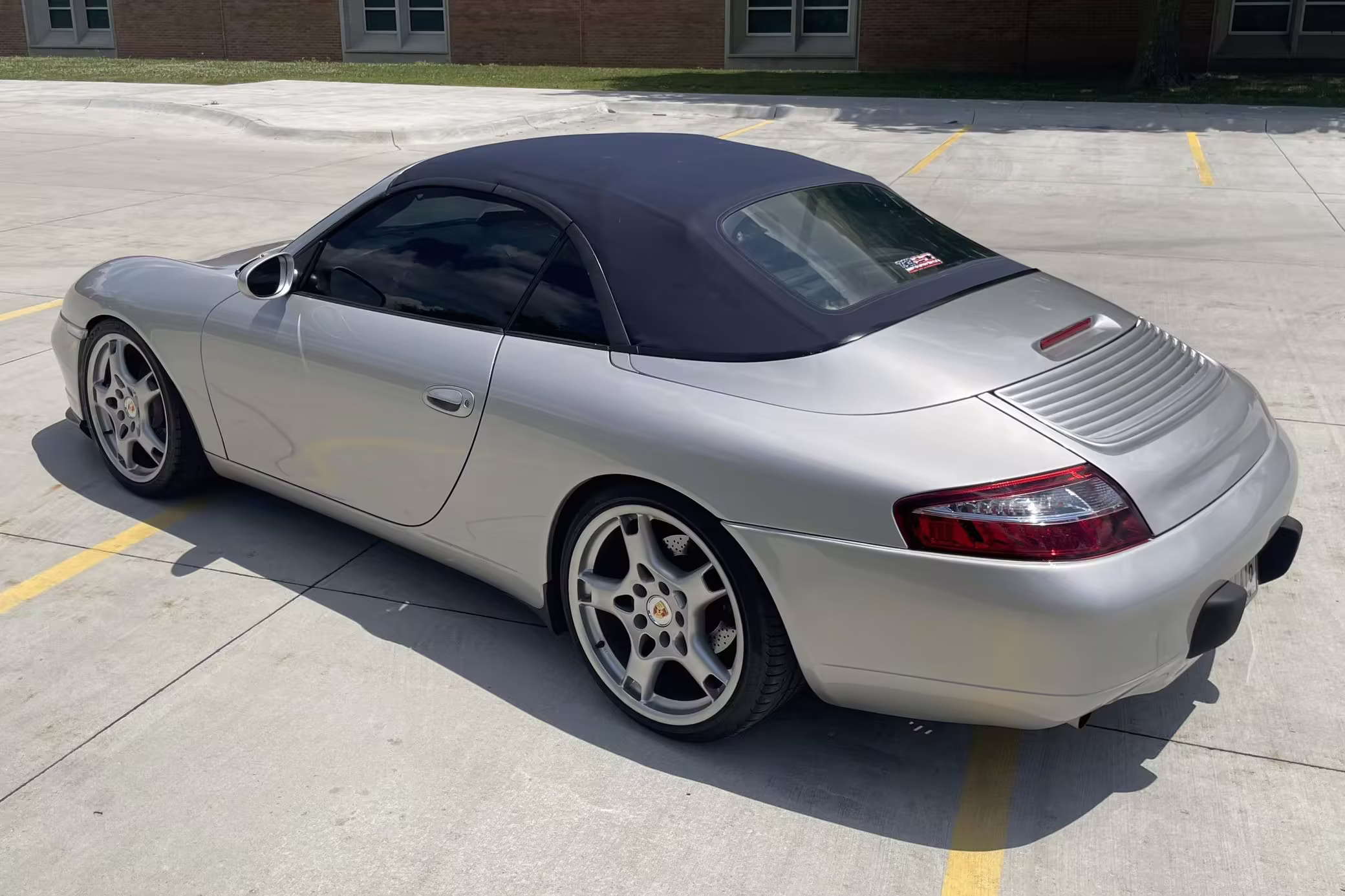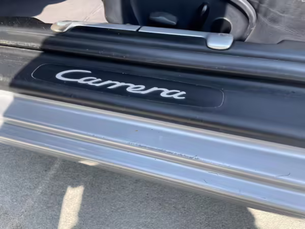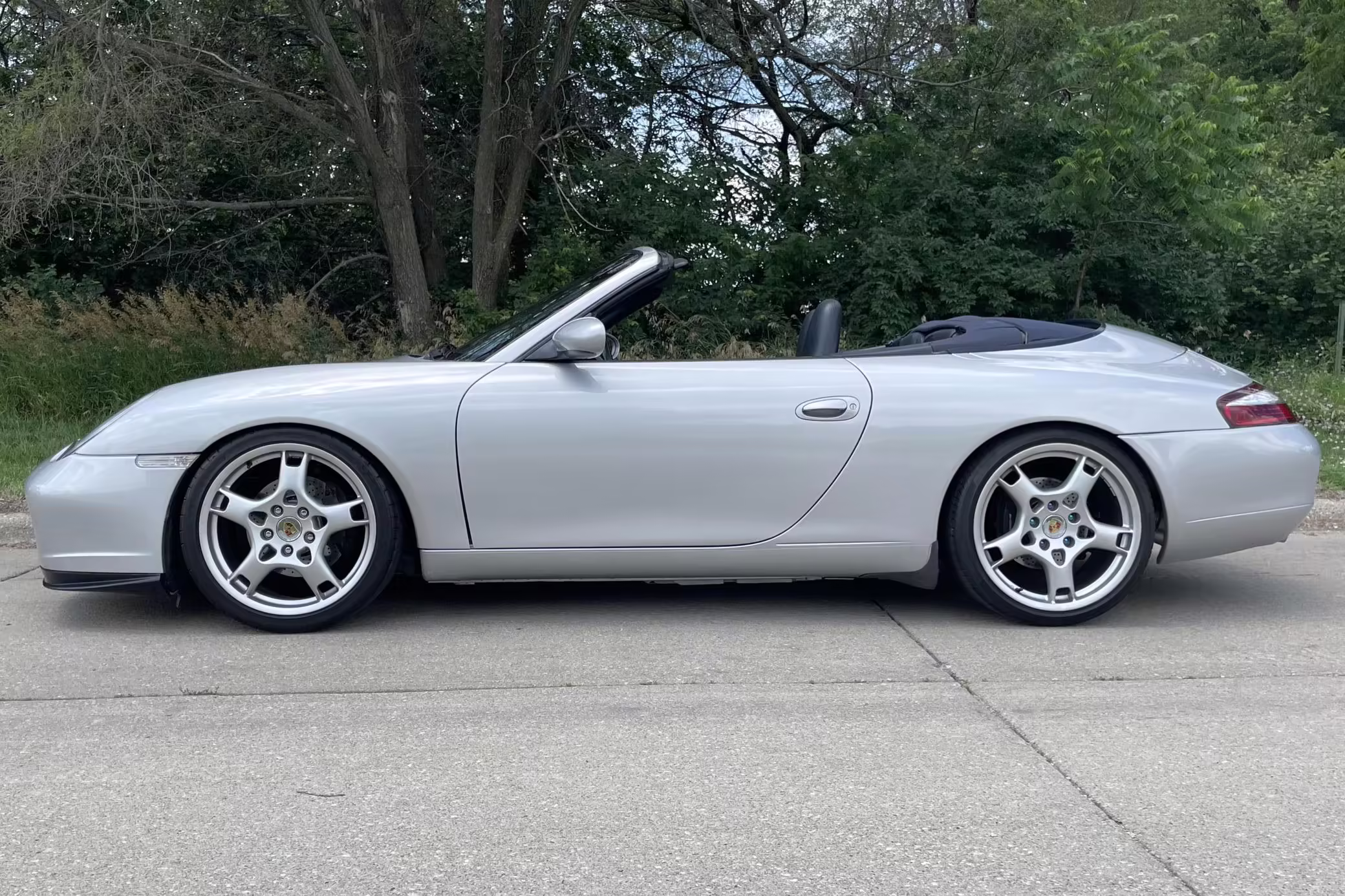 2000 Porsche 911 Carrera Cabriolet, finished in Arctic Silver with a blue soft top and a Metropol Blue interior.