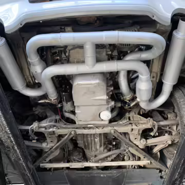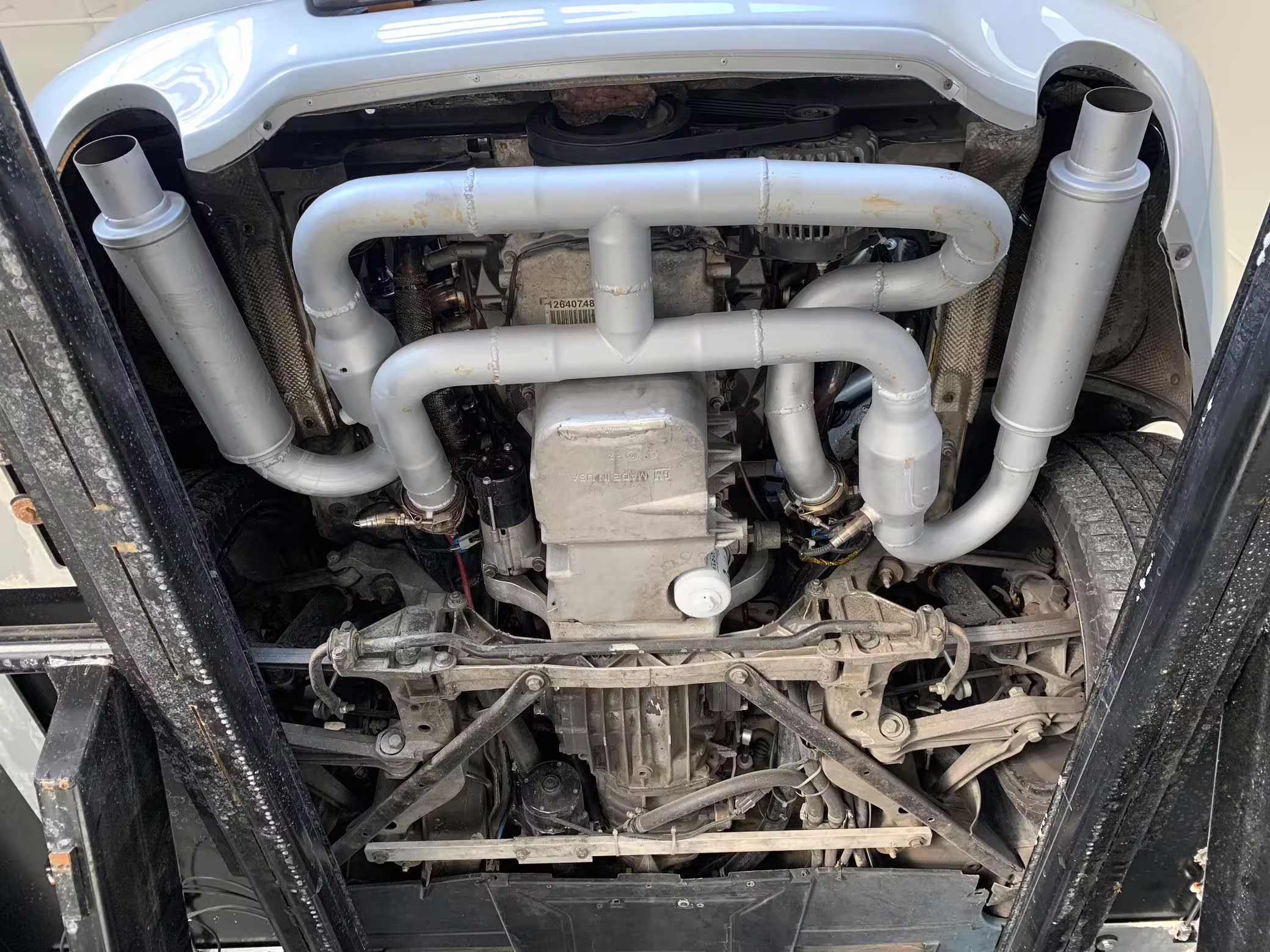 Custom 2.5-inch exhaust with J-pipe, race cats, and Flowmaster FX mufflers