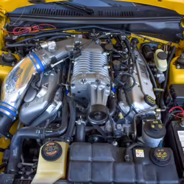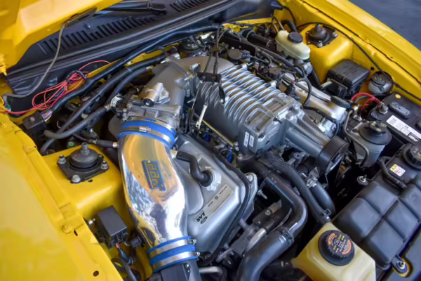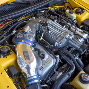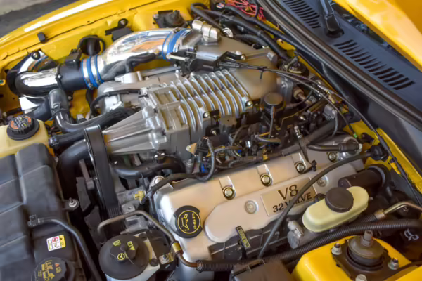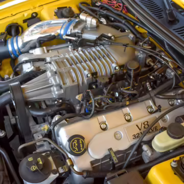 Power comes from a supercharged 4.6-liter V8, which produces 390 horsepower and 390 lb-ft of torque. Output is sent to the rear wheels through a 6-speed manual transmission.