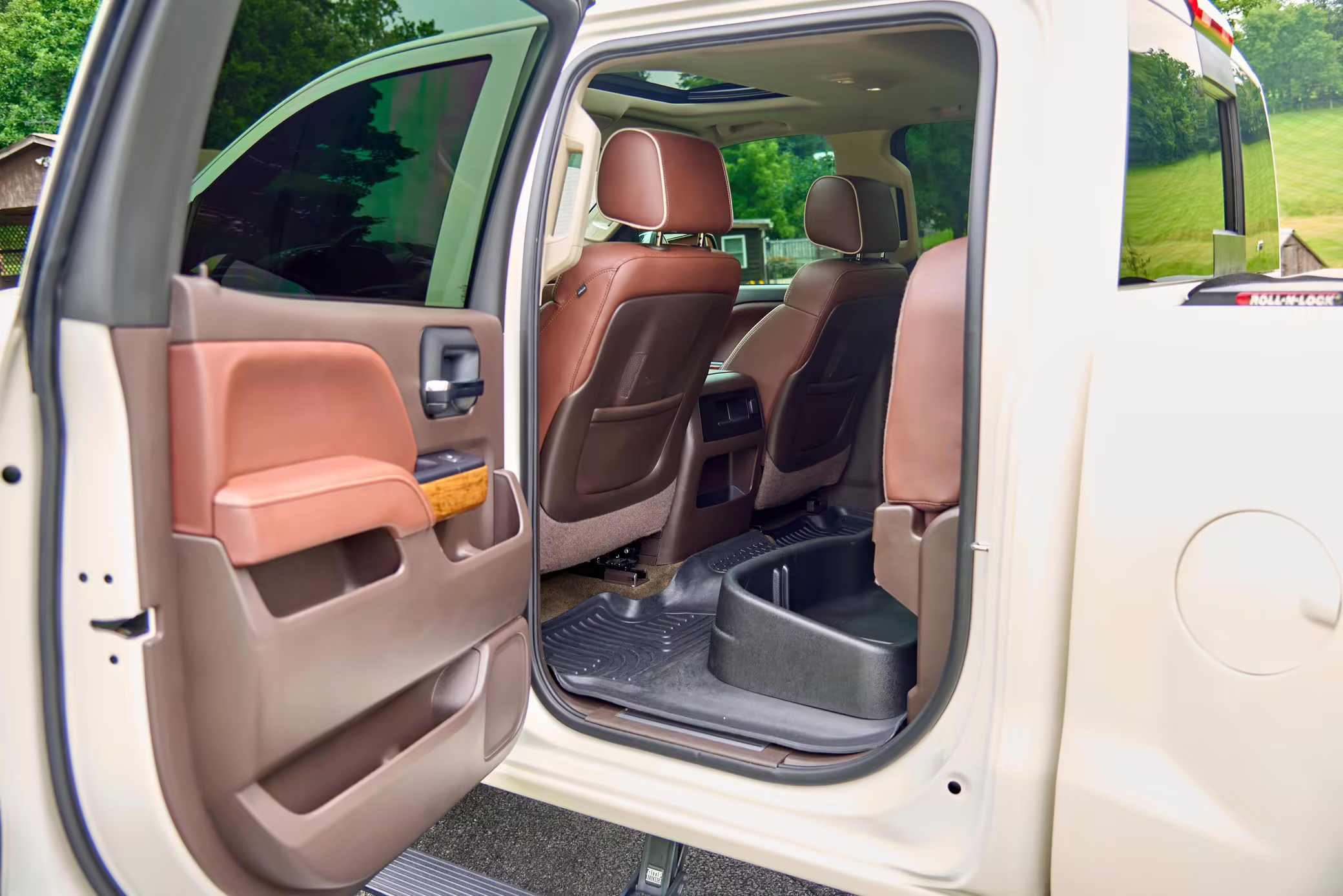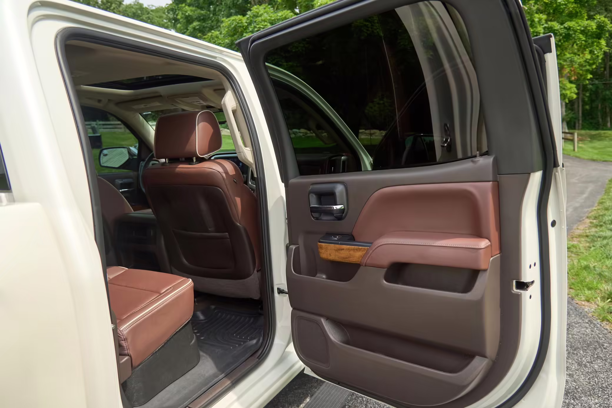 Factory equipment includes the High Country Premium package, a sunroof, leather upholstery, power-adjustable heated and ventilated front seats, a MyLink infotainment system, and a Bose sound system.