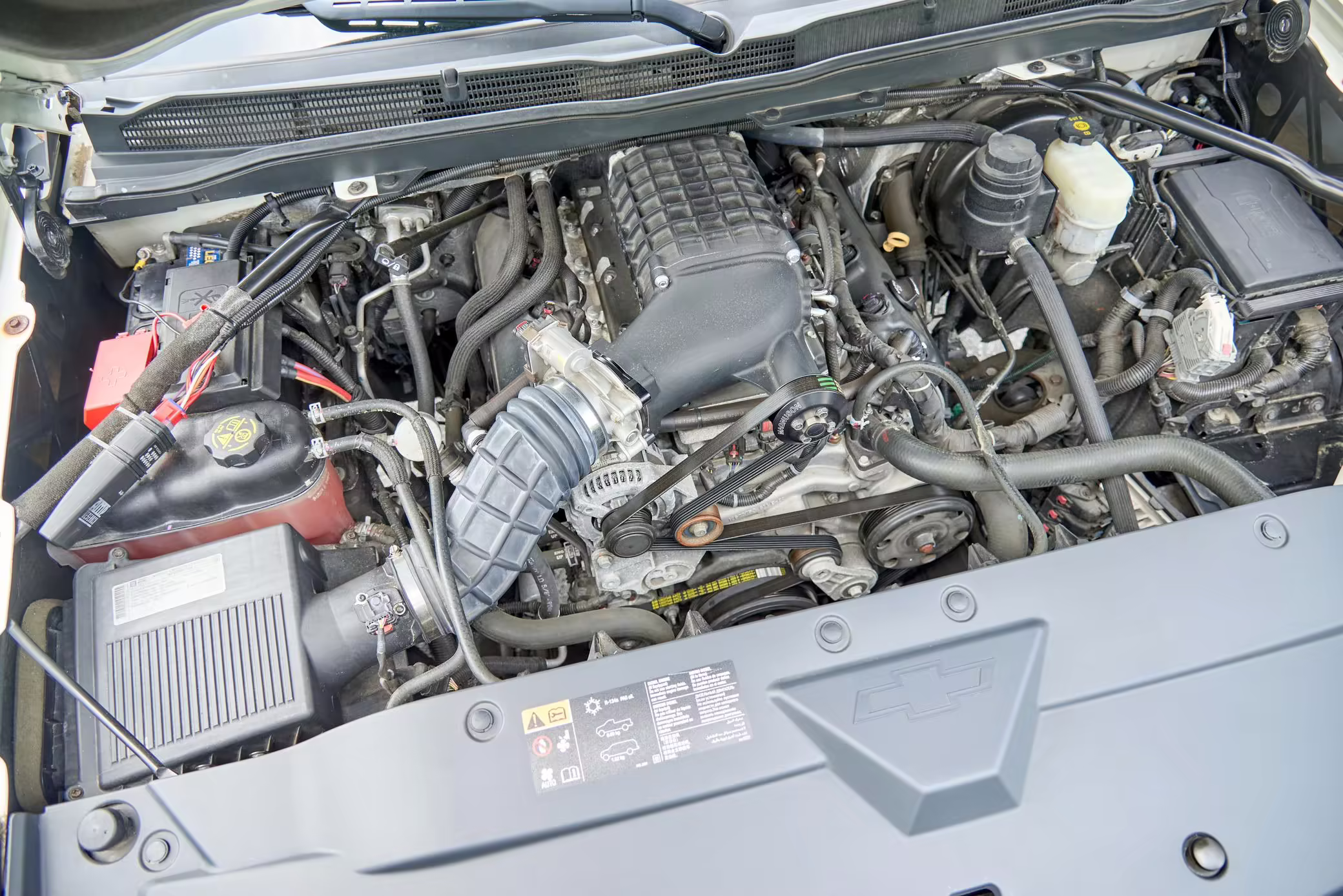 Power comes from a supercharged 6.2-liter V8, rated at 420 horsepower and 460 lb-ft of torque, when left stock and naturally aspirated. The seller states that this Silverado made 480 horsepower at the wheels during a dyno run, but a dyno sheet was not provided to confirm. Output is sent to the rear wheels via a 6-speed automatic transmission.