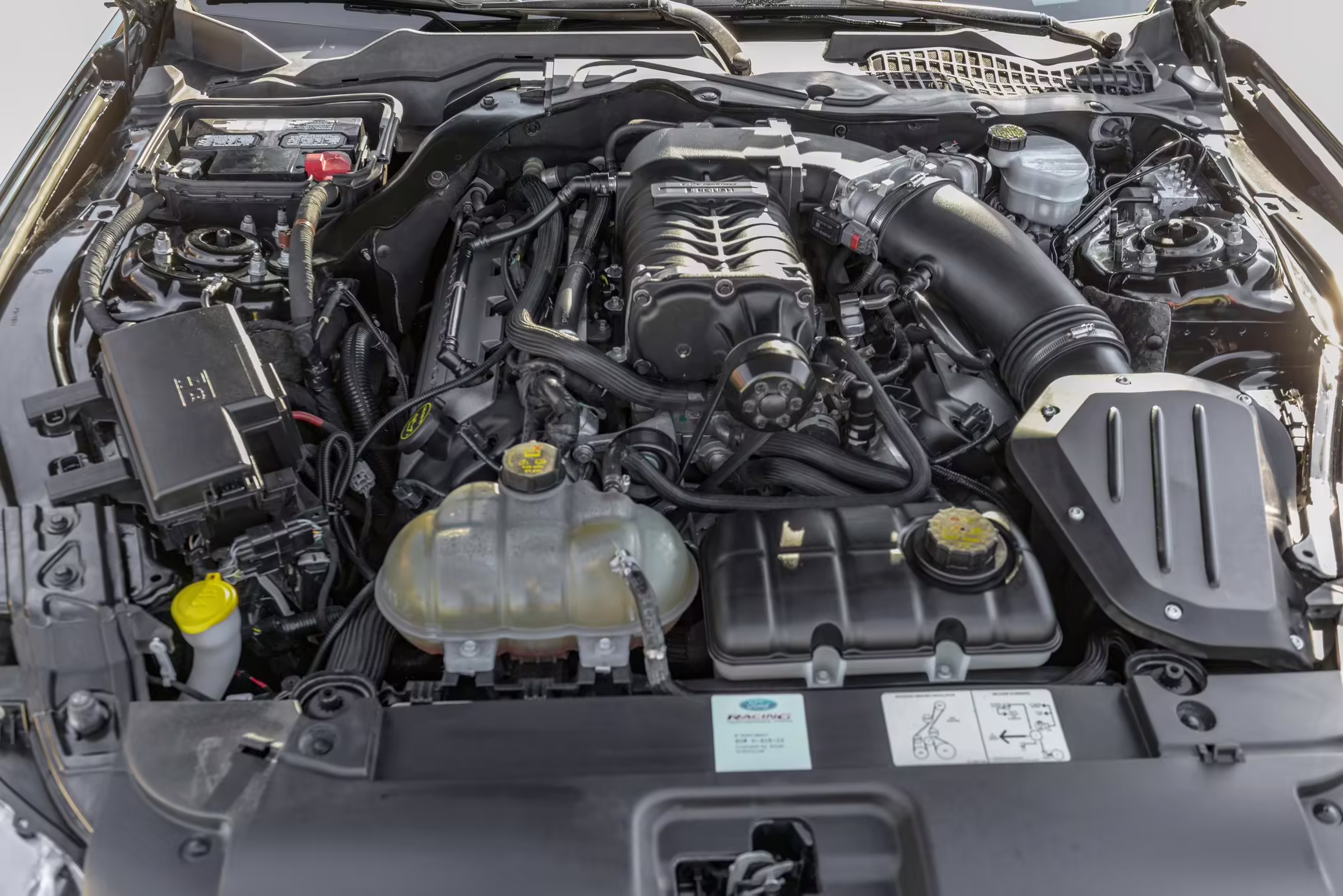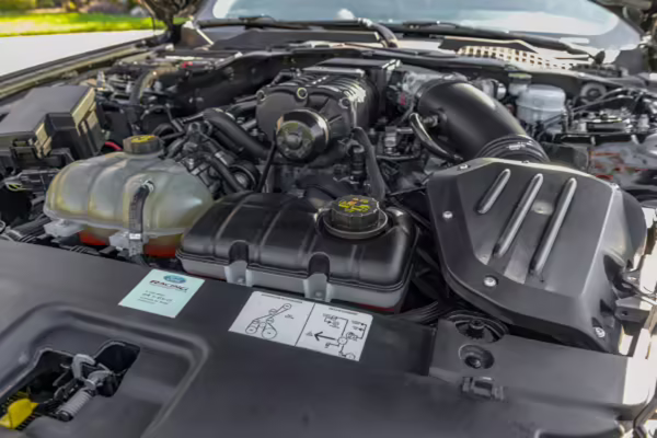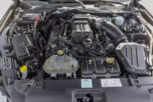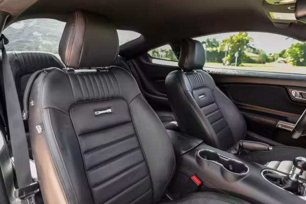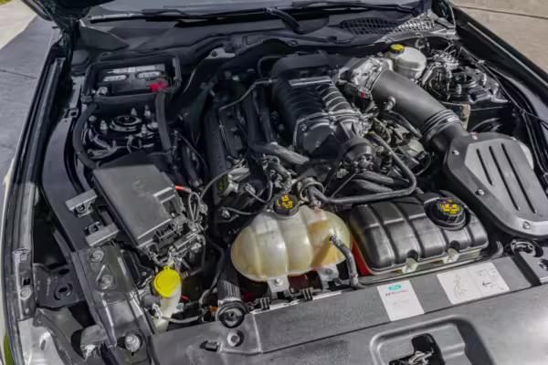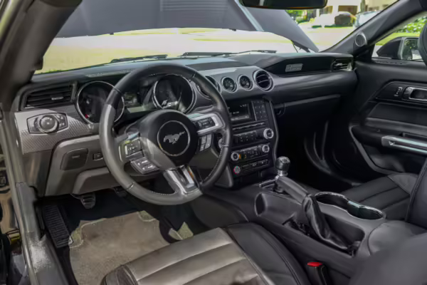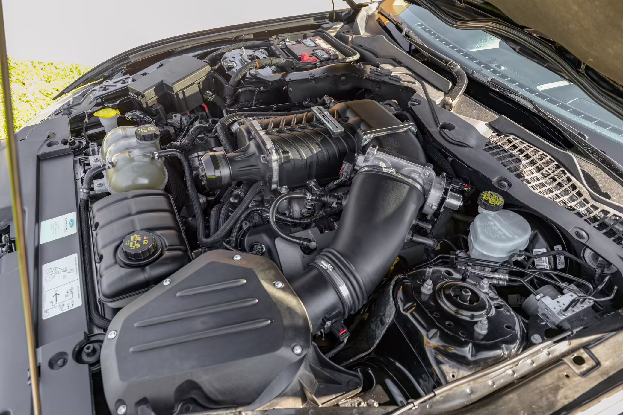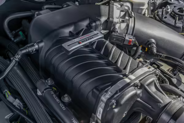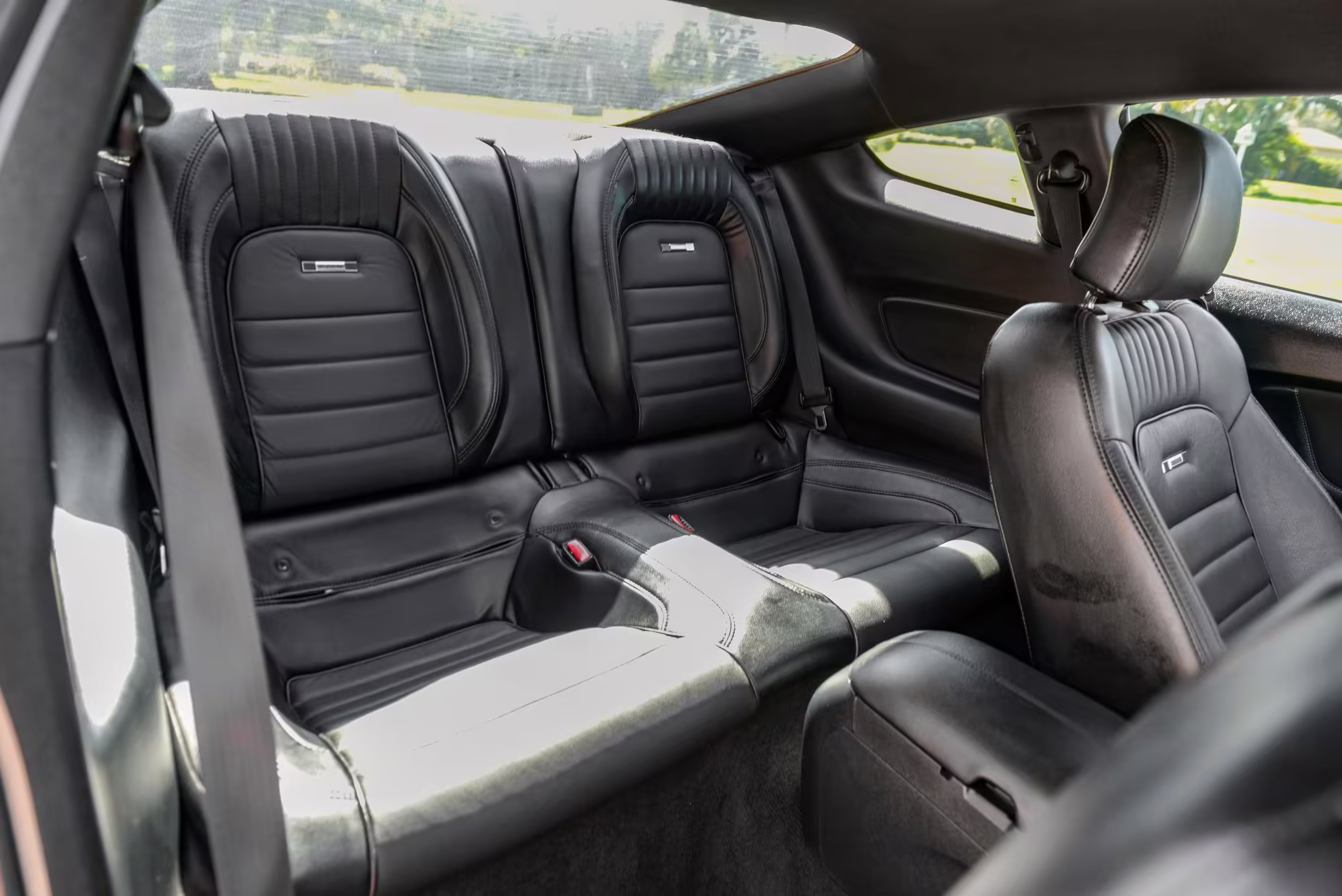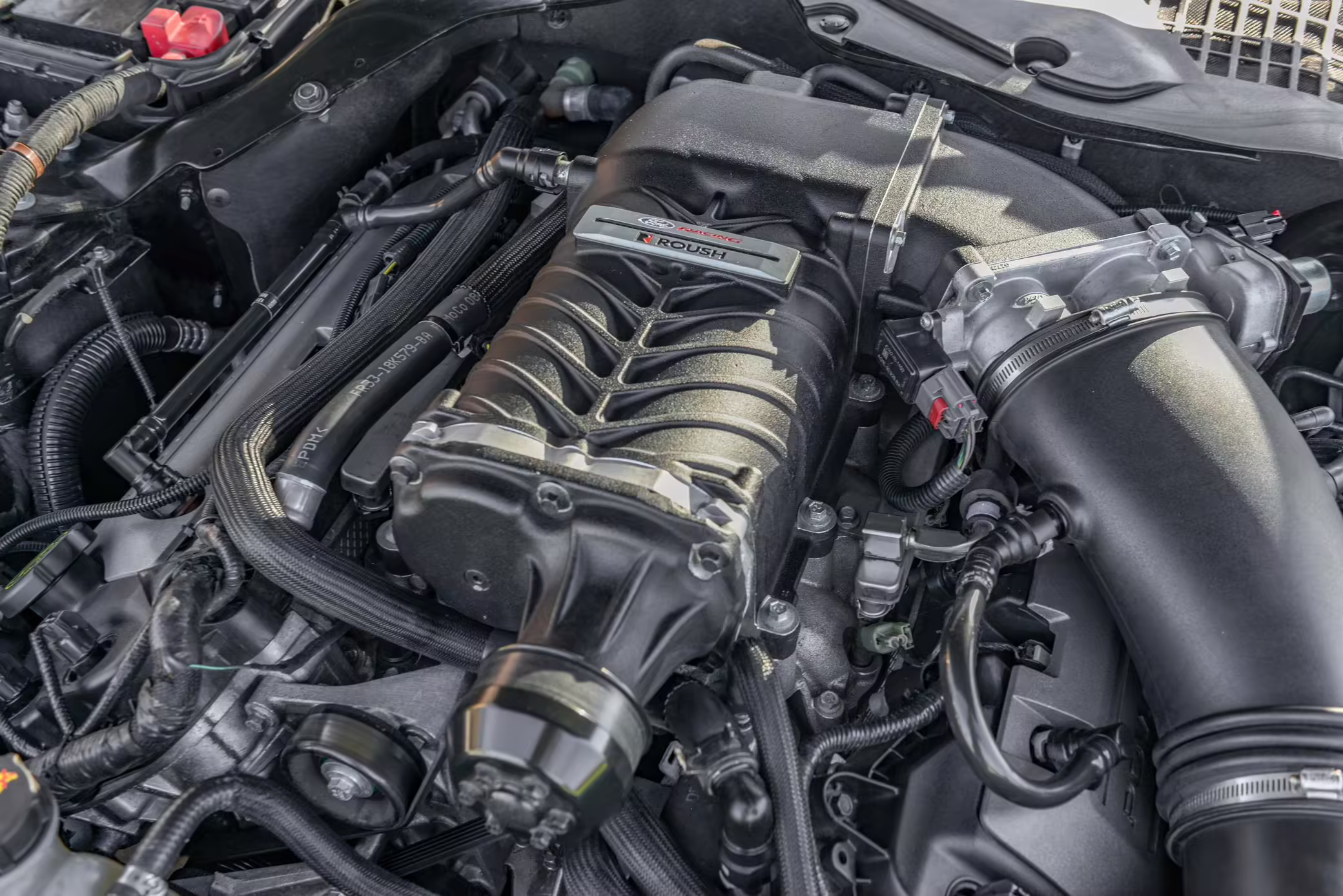 Power comes from a 5.0-liter “Coyote” V8 engine, rated at 435 horsepower and 400 lb-ft of torque when left stock. The Roush Supercharger reportedly increases the power output to 670 horsepower and 545 lb-ft of torque at the rear wheels, though no dyno sheet has been provided to confirm. Output is sent to the rear wheels via a Getrag 6-speed manual transmission.