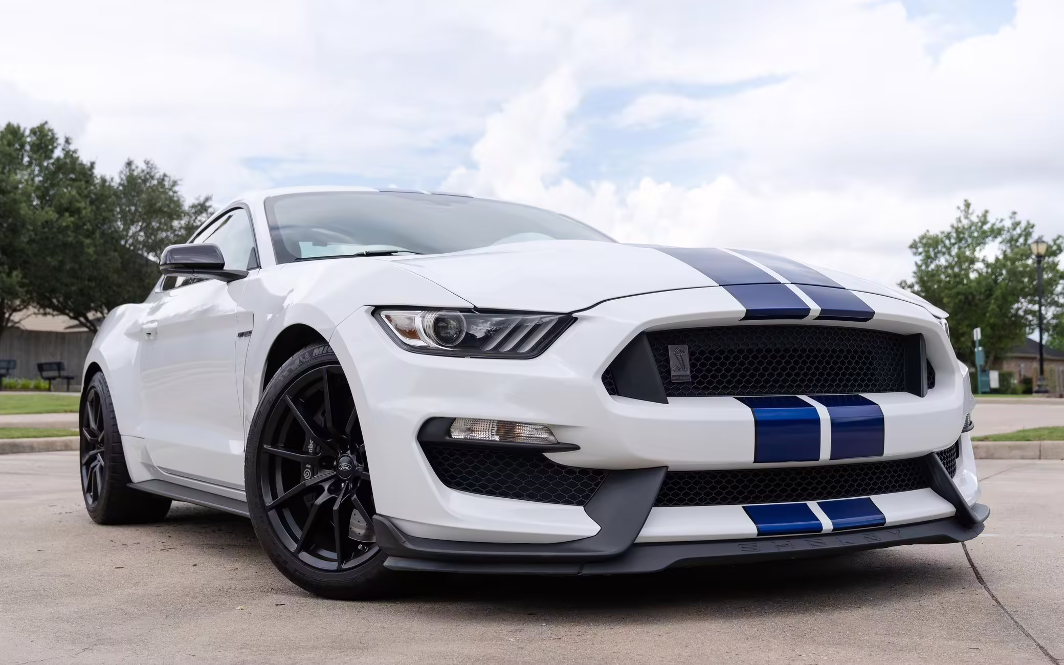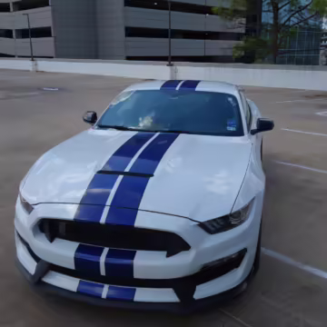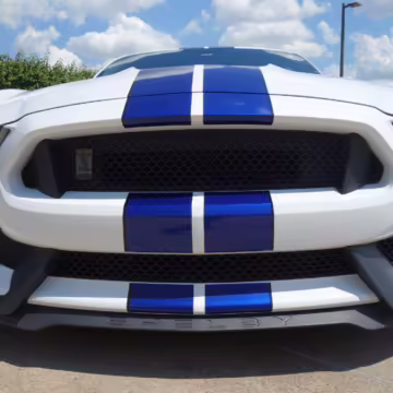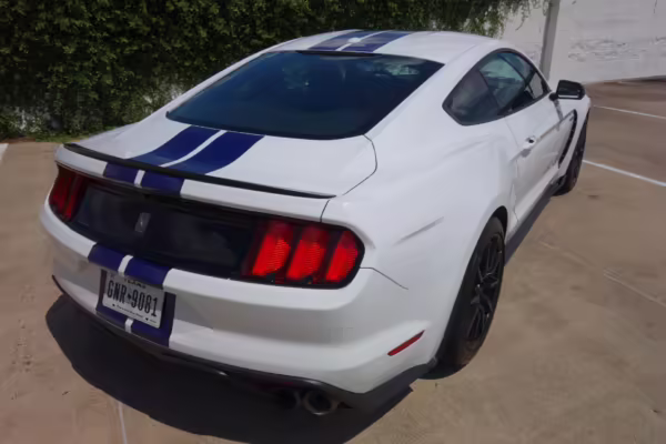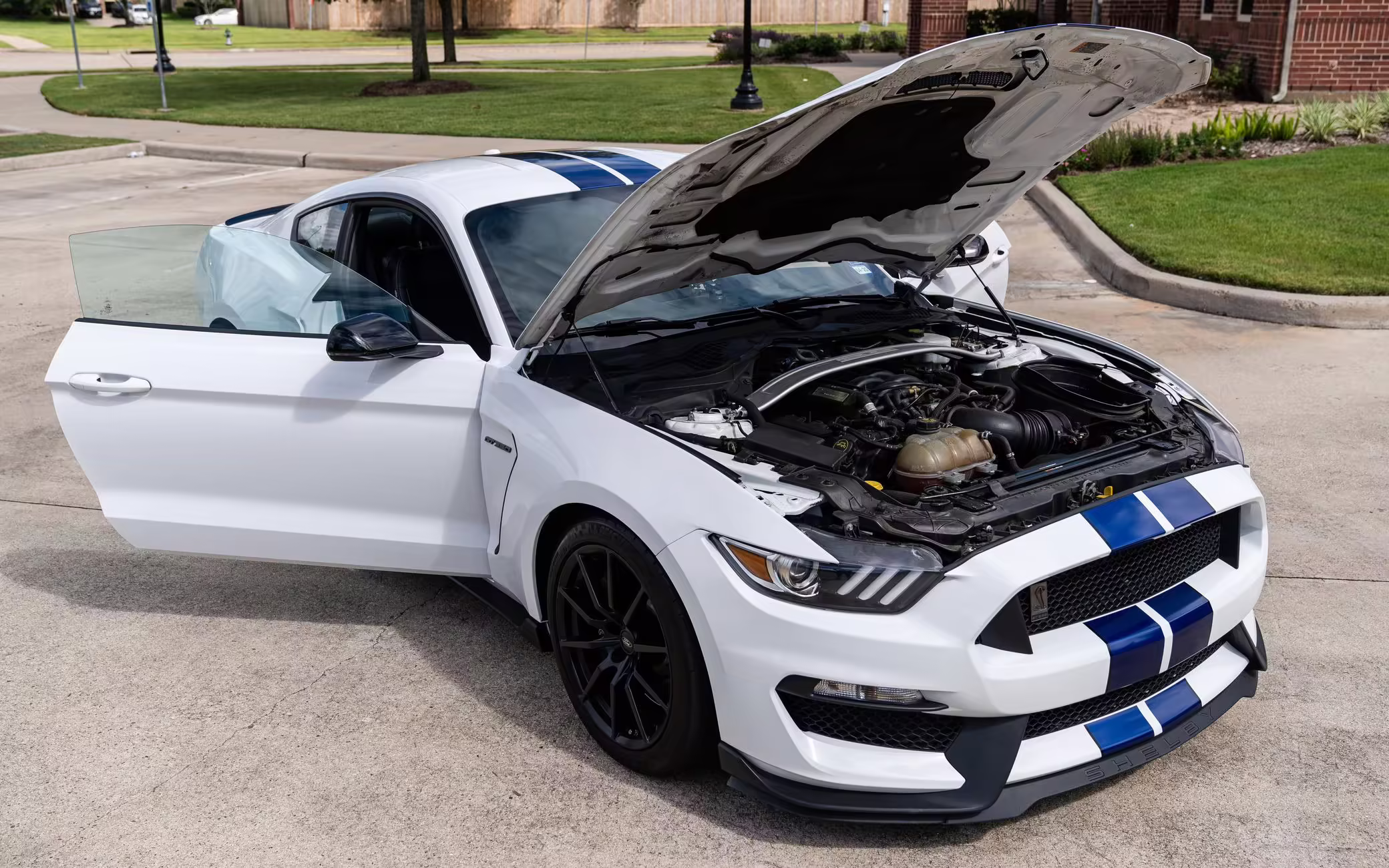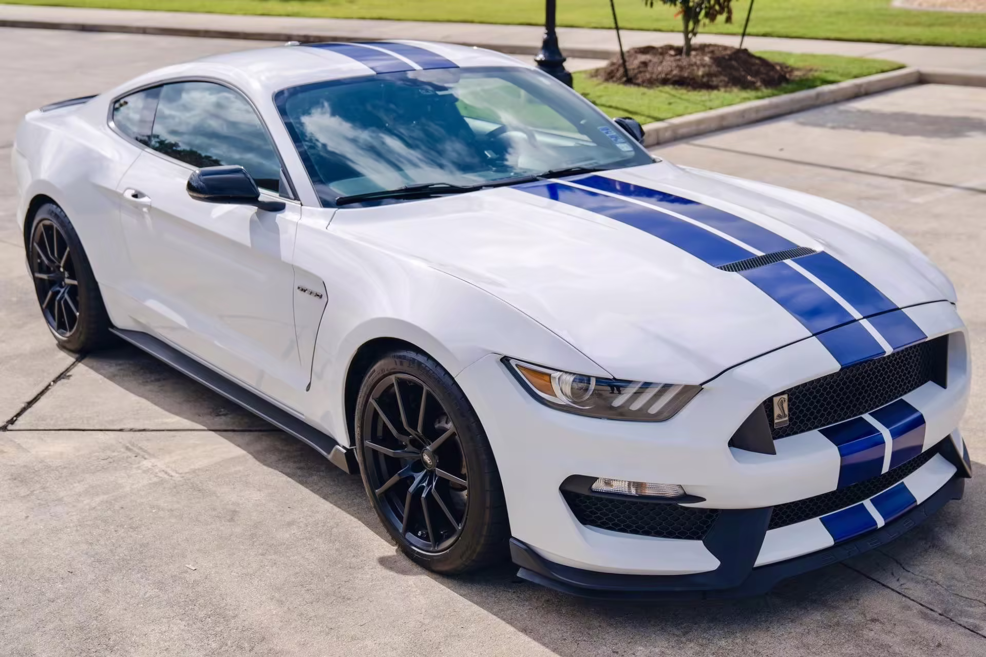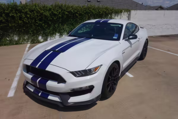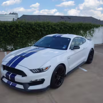 2016 Ford Mustang Shelby GT350, finished in Oxford White with Kona Blue Stripes with a black leather interior.