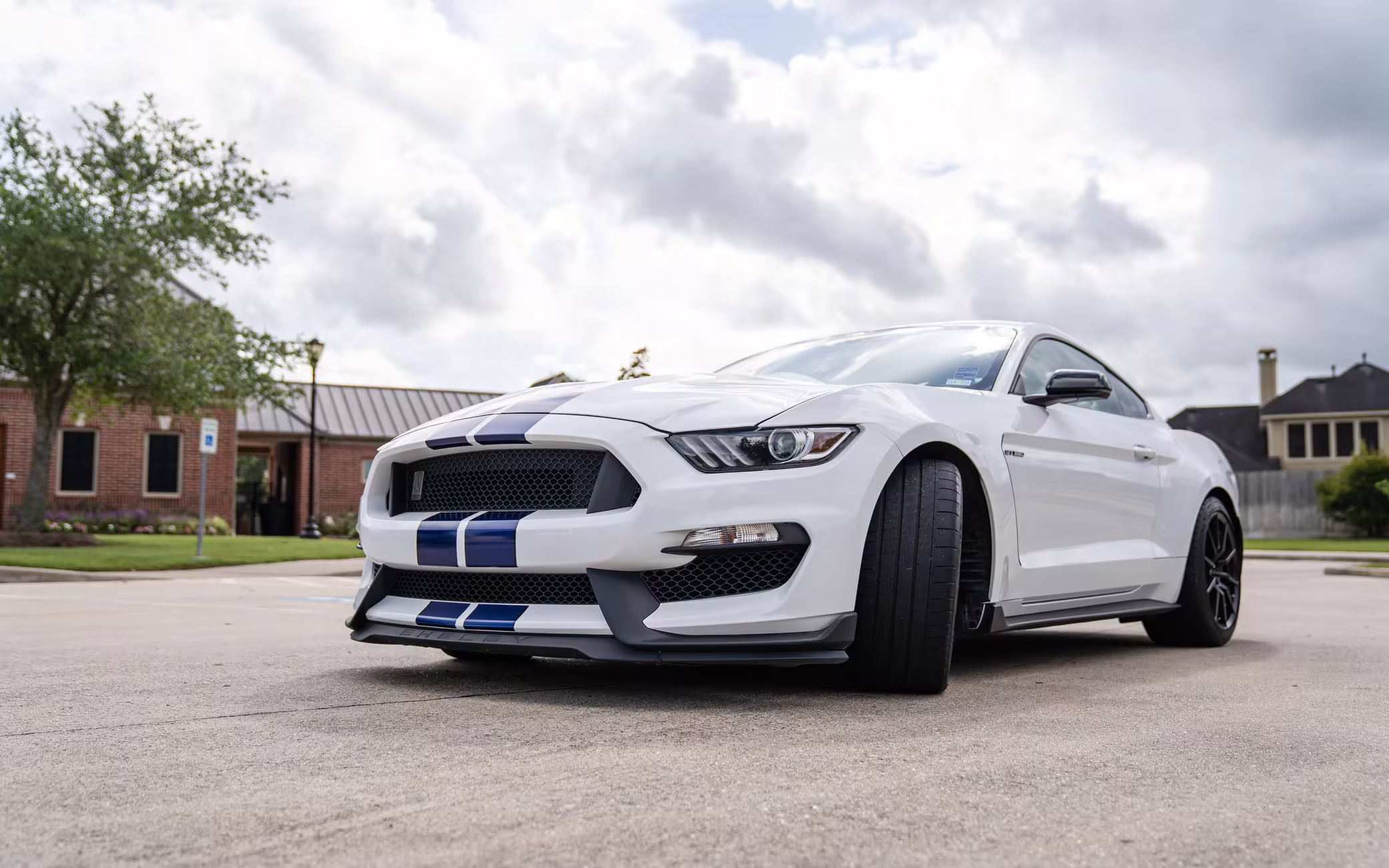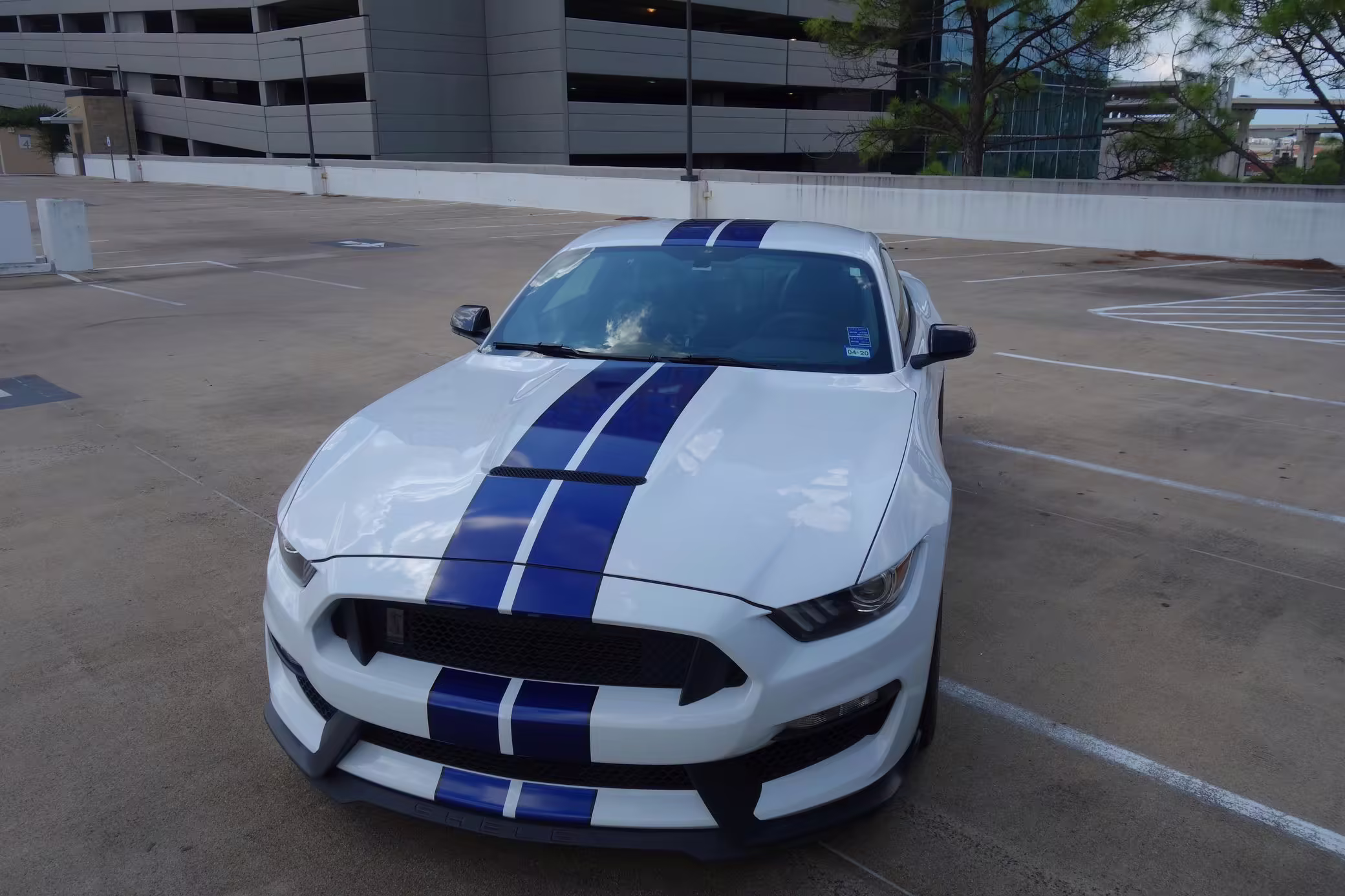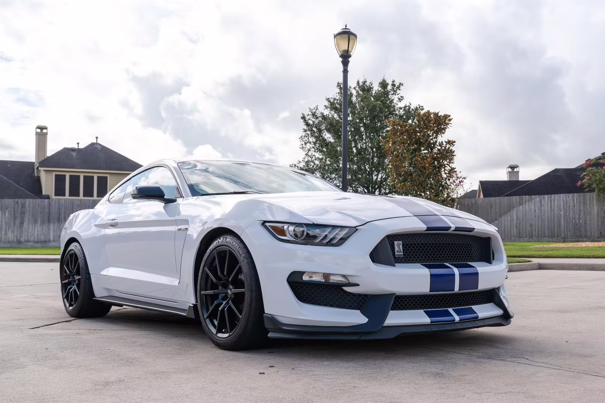 2016 Ford Mustang Shelby GT350, finished in Oxford White with Kona Blue Stripes with a black leather interior.