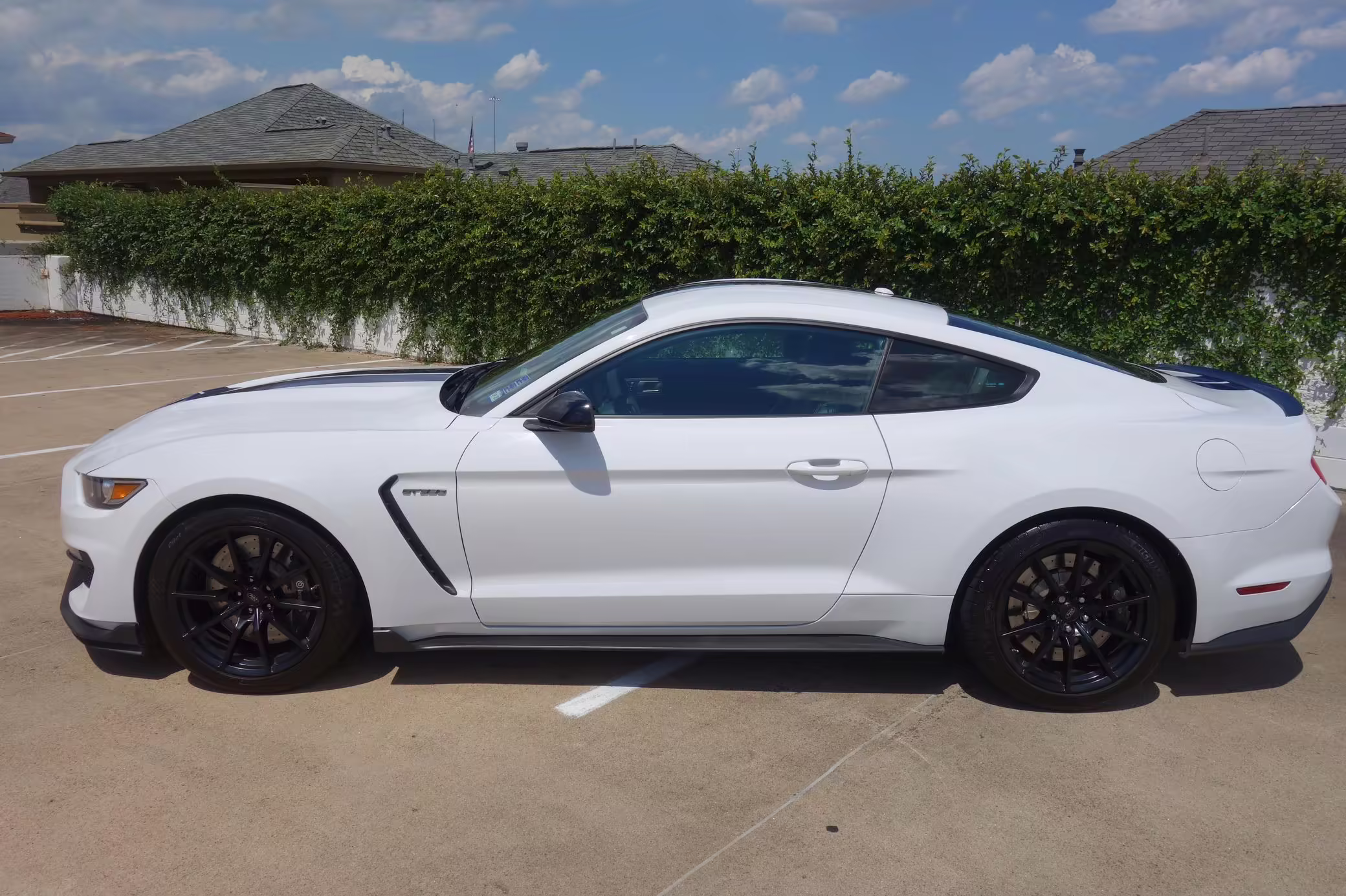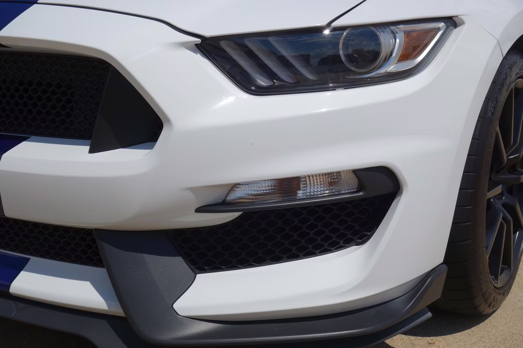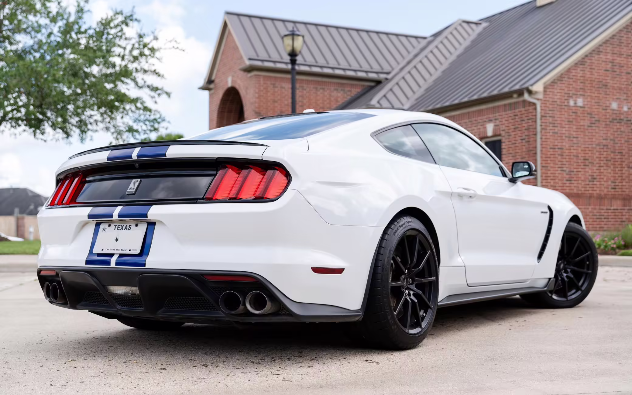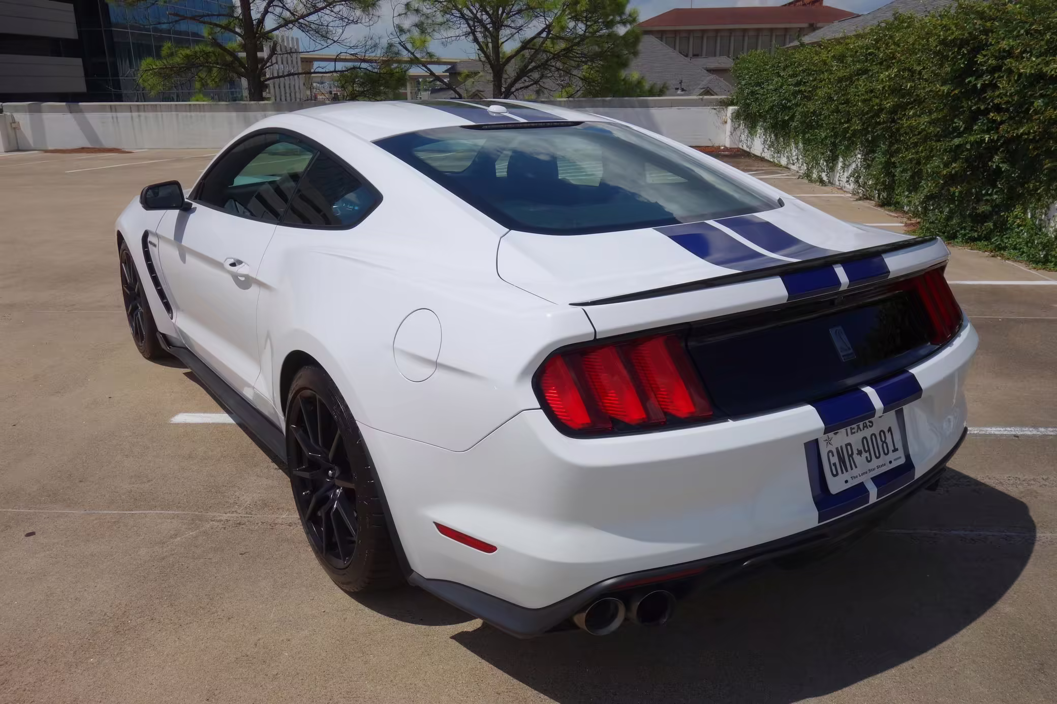2016 Ford Mustang Shelby GT350, finished in Oxford White with Kona Blue Stripes with a black leather interior.