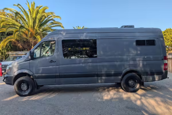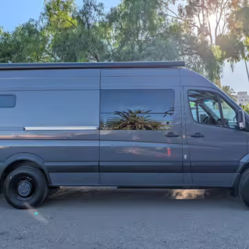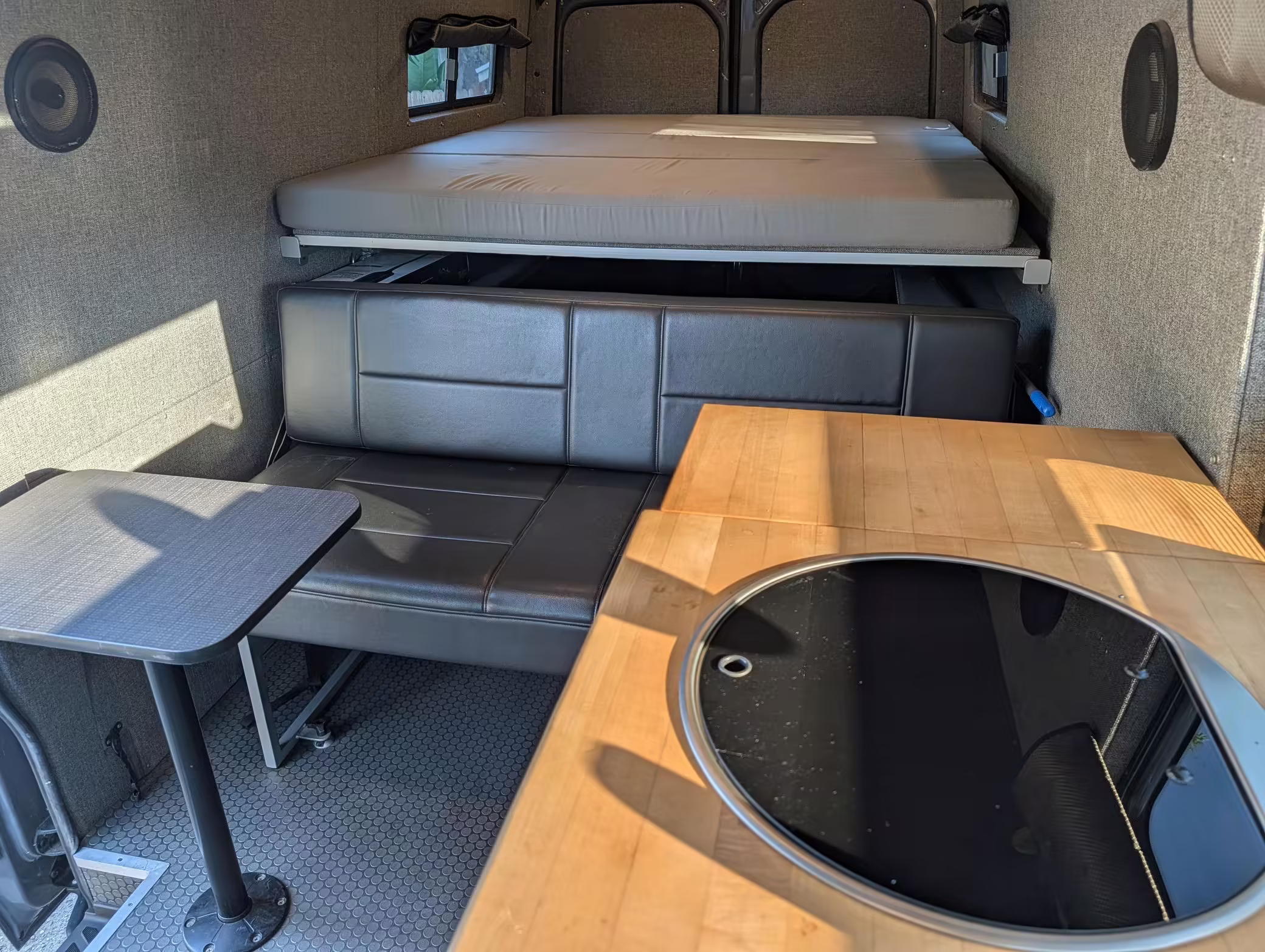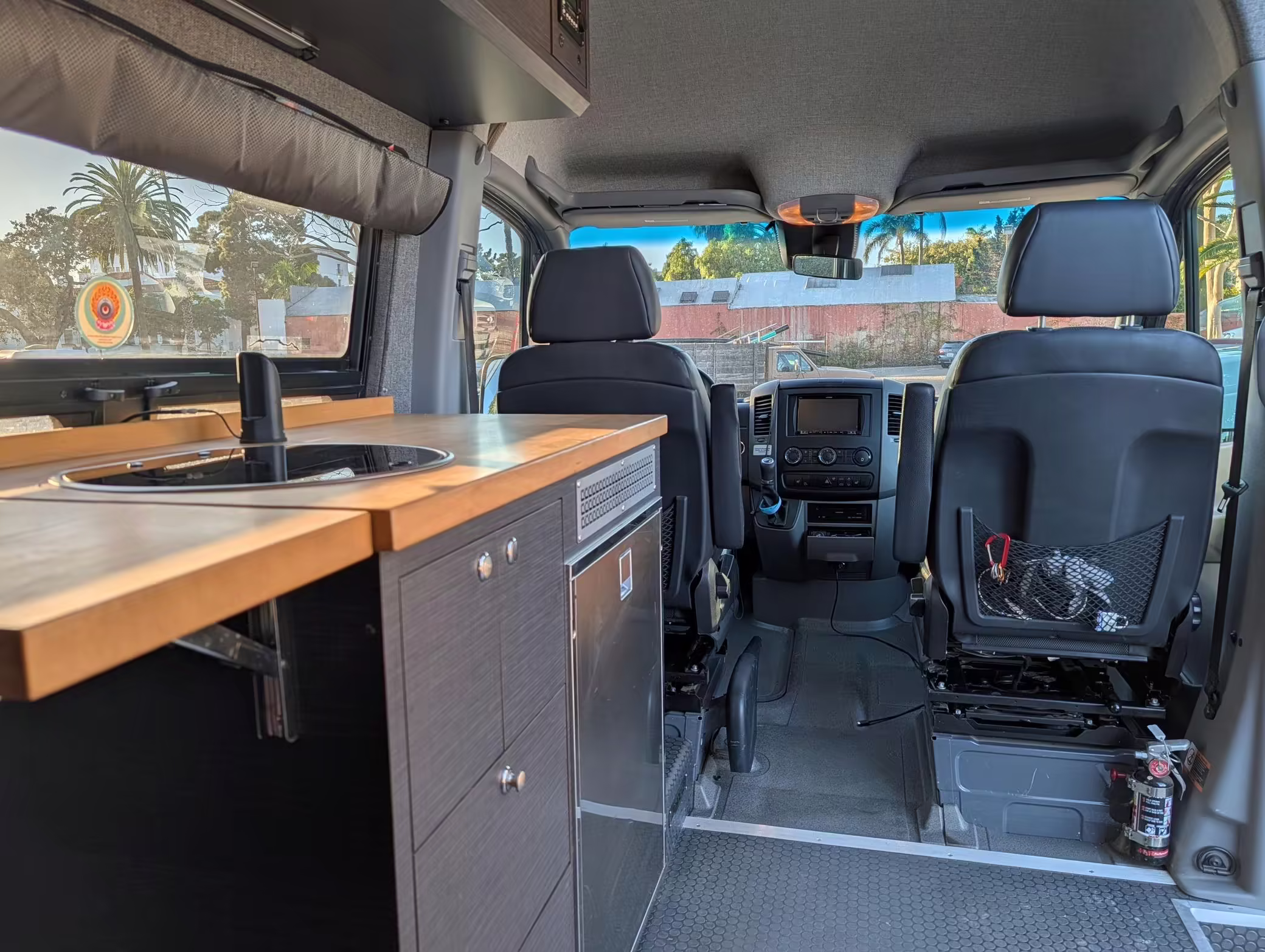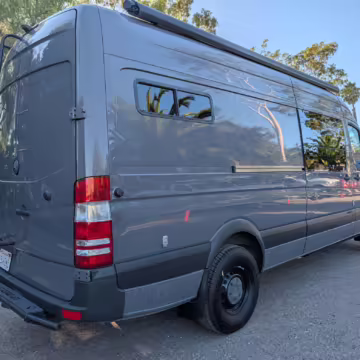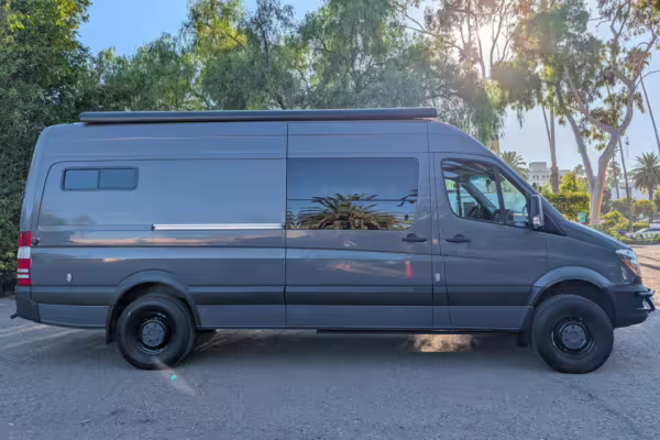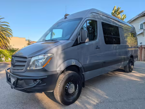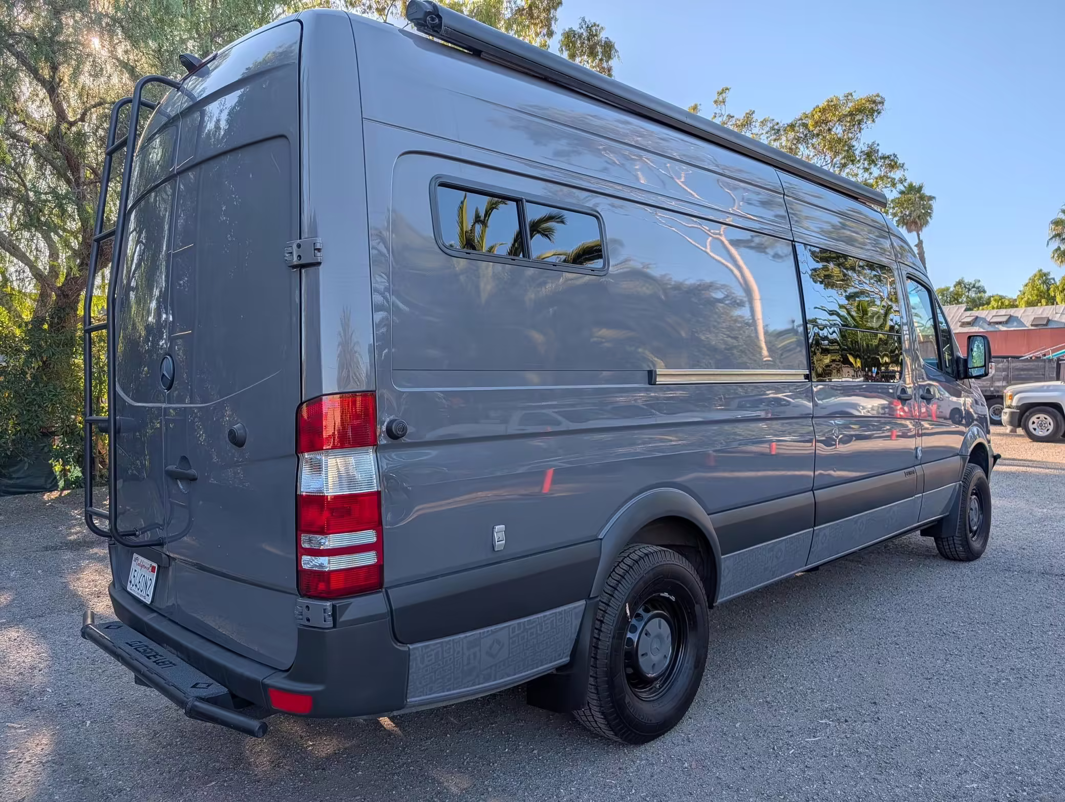 This particular Sprinter 2500 touts a turbodiesel V6 engine paired with 4-wheel drive, and it’s been converted into a camper by Outside Vans. The conversion included the installation of Outside Van bumpers, LED exterior lights, a Fiamma awning, a 3-panel removable bed, a sink, a refrigerator, roof-mounted solar panels, and a 20-gallon fresh water tank.