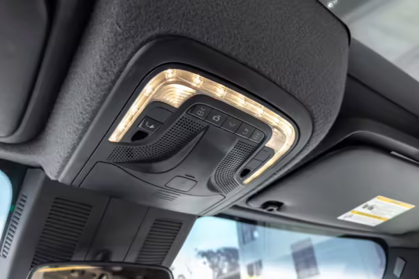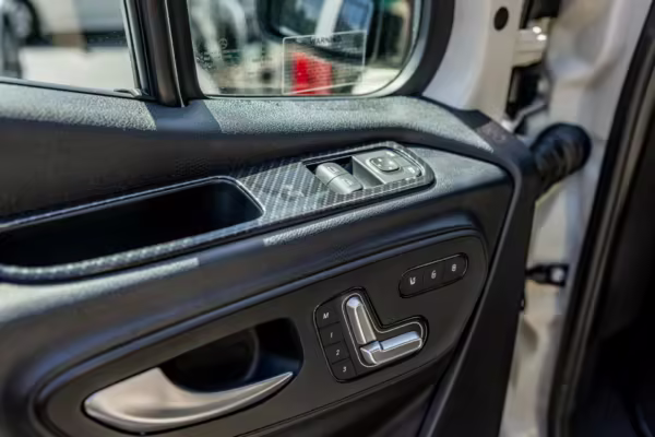 Factory equipment includes LED headlights, a power-operated sliding door, heated, power-adjustable, and swiveling front seats, a wireless device charger, a 10.25-inch touchscreen for the MBUX infotainment system, and crosswind assist, according to a build sheet shown in the gallery.