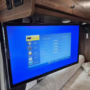 Converted into a camper by Winnebago, this high-roof van is fitted with an awning, a rear-mounted ladder, twin folding beds, a Nova Kool fridge, a High Pointe microwave, a single-burner induction cooktop, a stainless-steel sink, a shower, a toilet, LED interior lighting, a Coleman air conditioning system, a television, a KING OmniGo antenna, and roof-mounted solar panels, among other features.