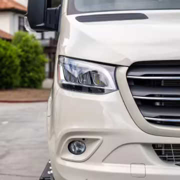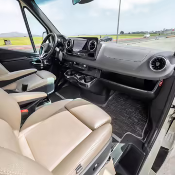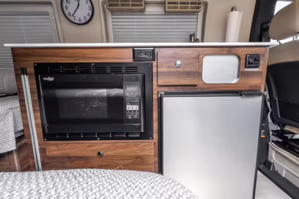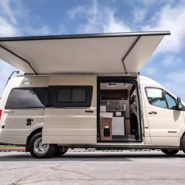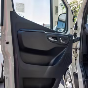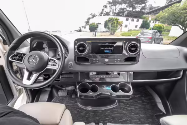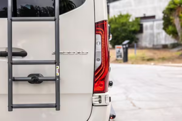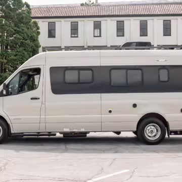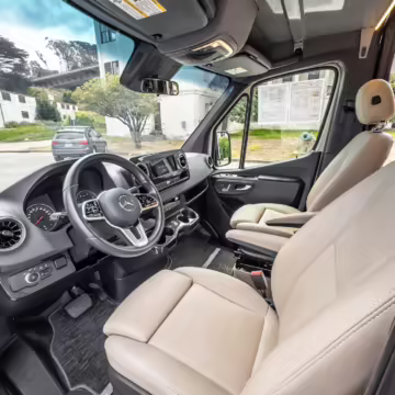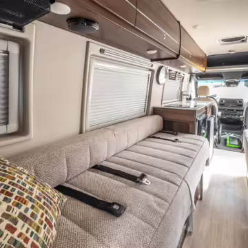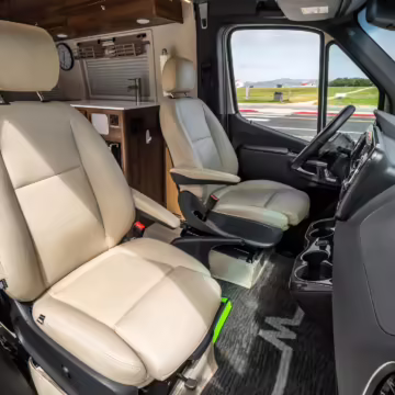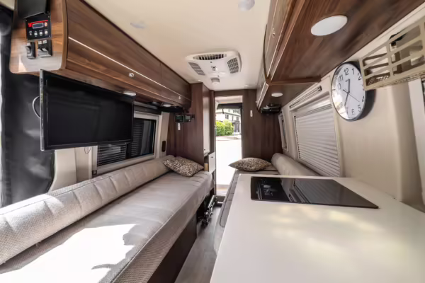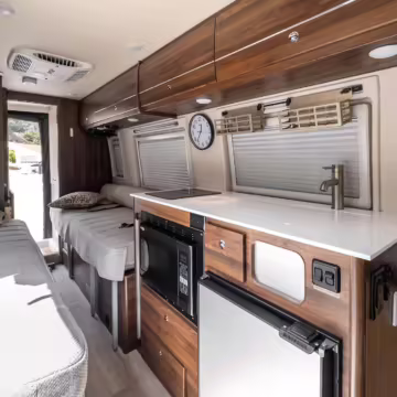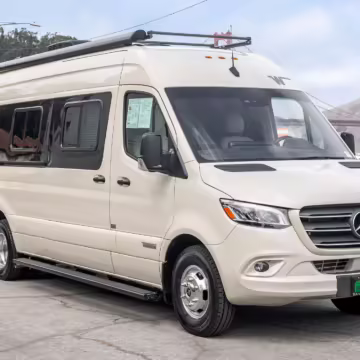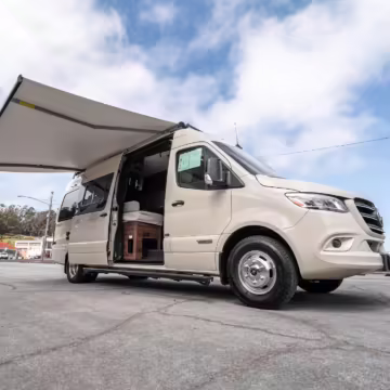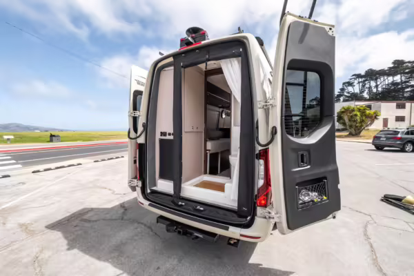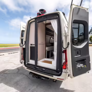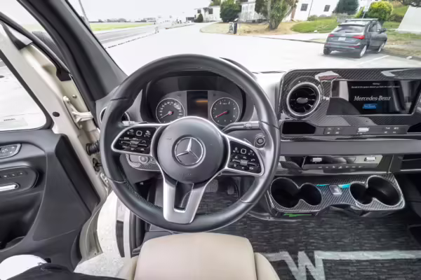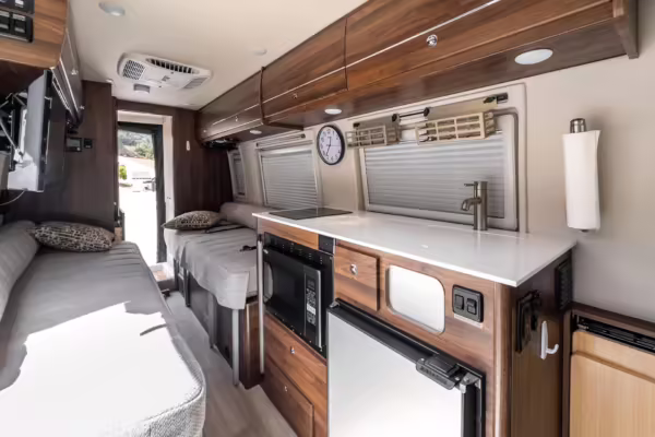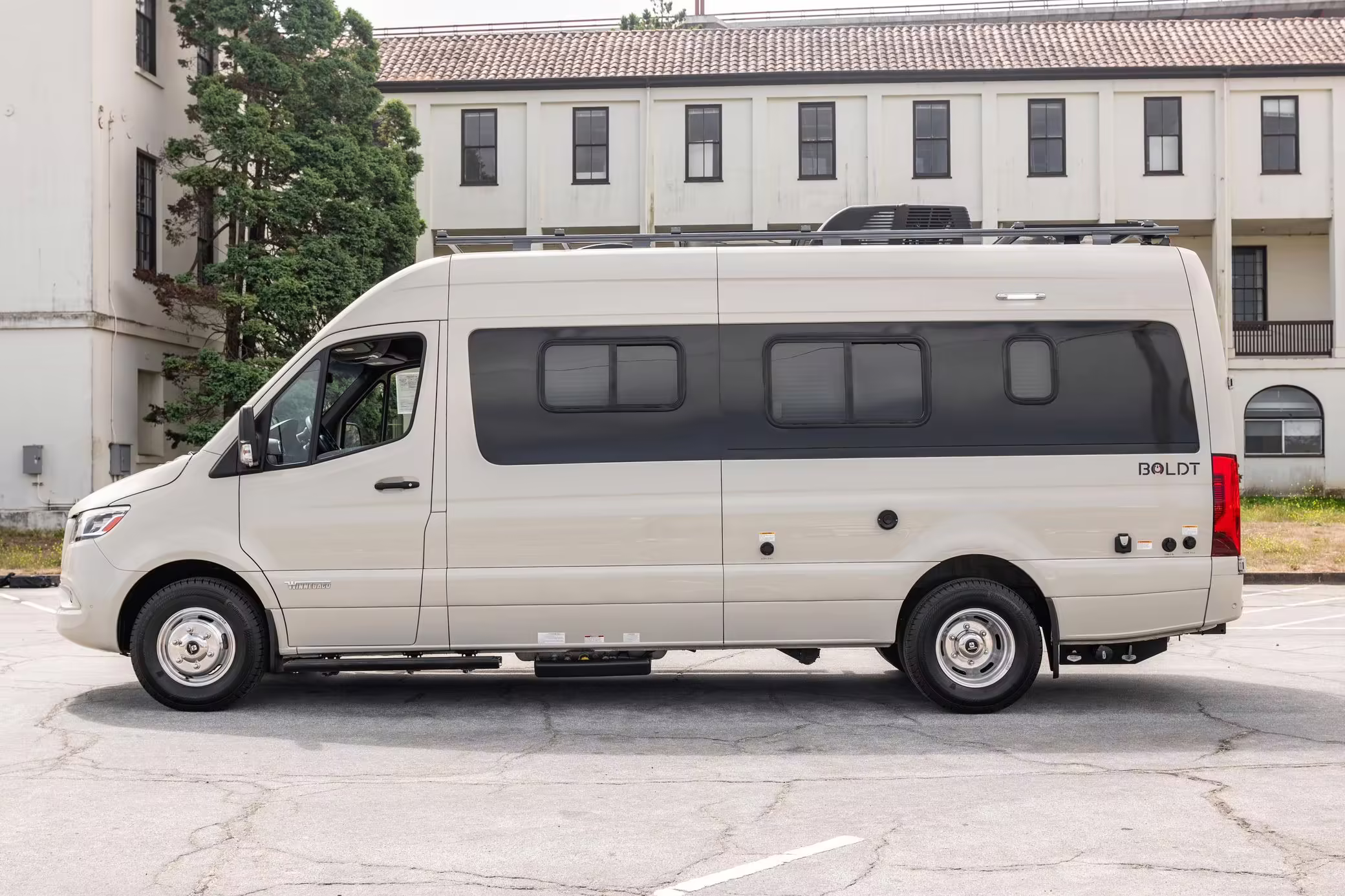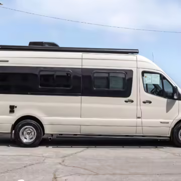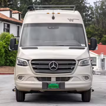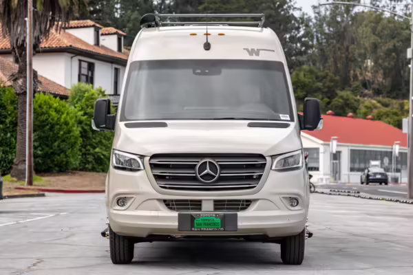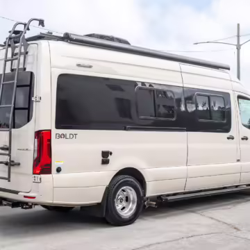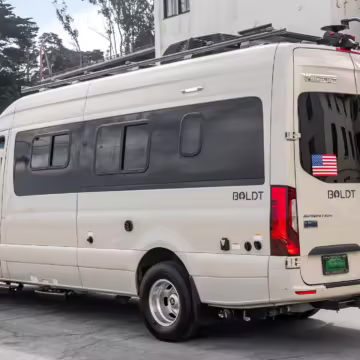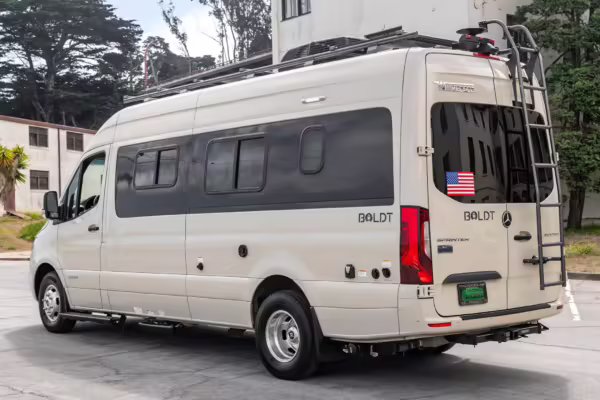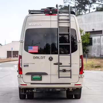 Winnebago Boldt RV conversion (includes side steps, sliding side windows, awning, trailer hitch, rear-mounted ladder, roof rack, 16-inch wheels, Katzkin leather upholstery, twin folding beds, countertop, folding table, Nova Kool fridge, High Pointe microwave, single-burner induction cooktop, stainless-steel sink, shower, toilet, storage cabinets, wardrobe with adjustable and removable shelves, vinyl flooring, window shades, door screens, LED interior lighting, roof-mounted vent, Coleman air conditioning system, Truma Combi Eco Plus heater, electrical outlets, USB charging ports, television, KING OmniGo antenna, roof-mounted solar panels, inverter, AC/DC load center/converter, and systems monitoring panel)
