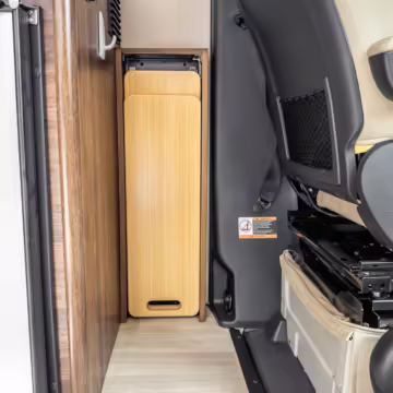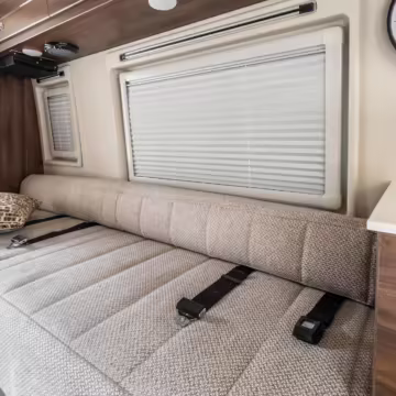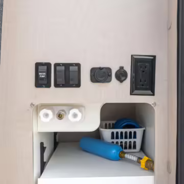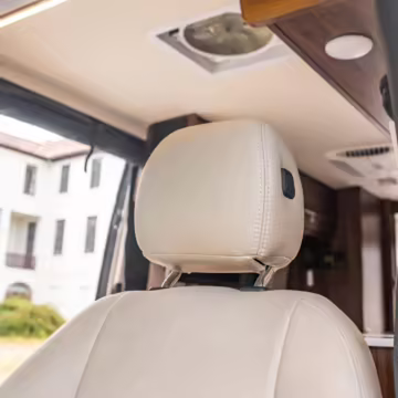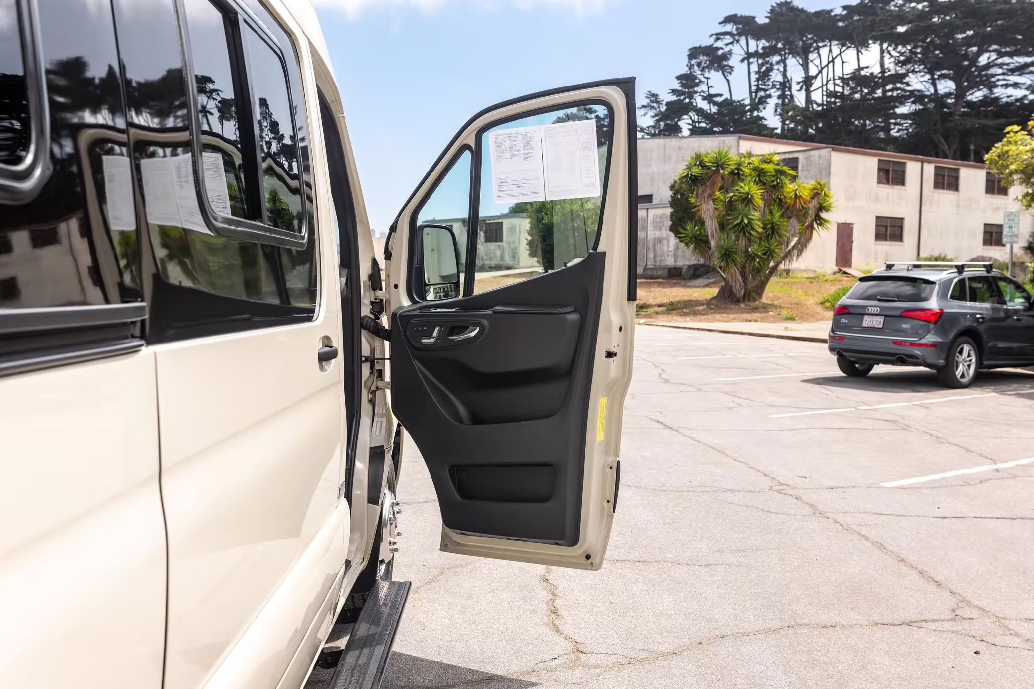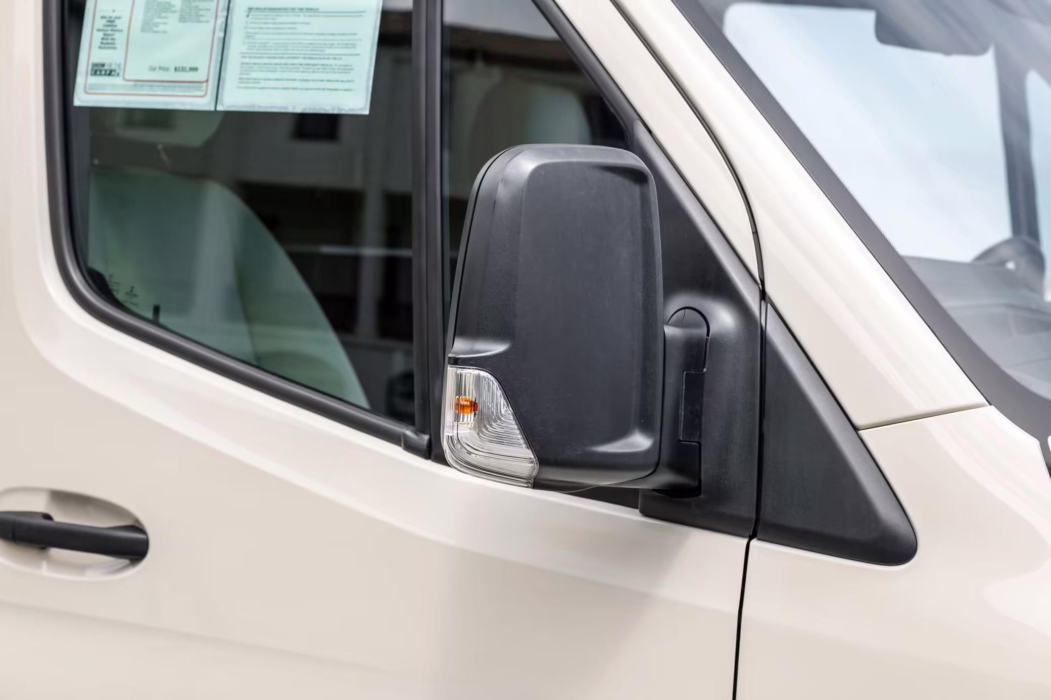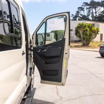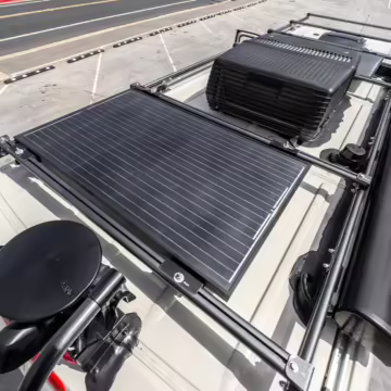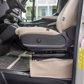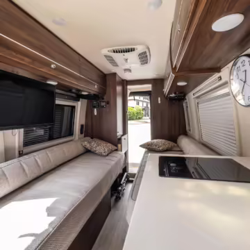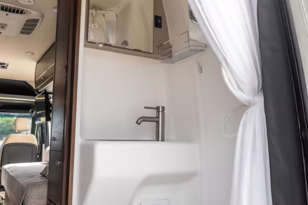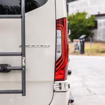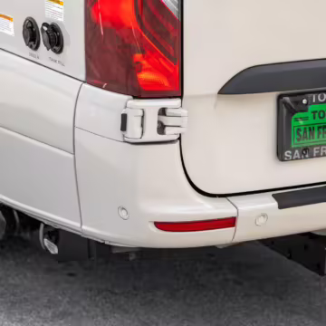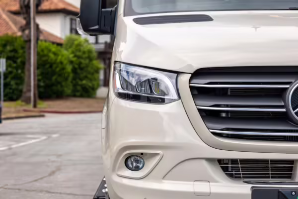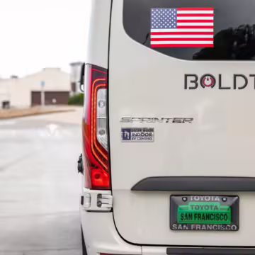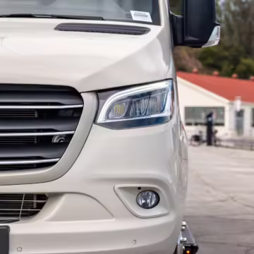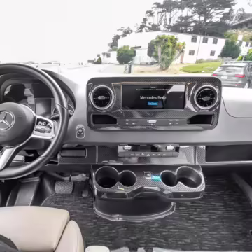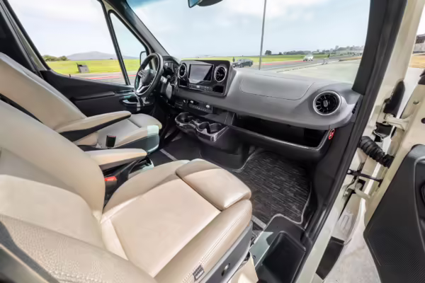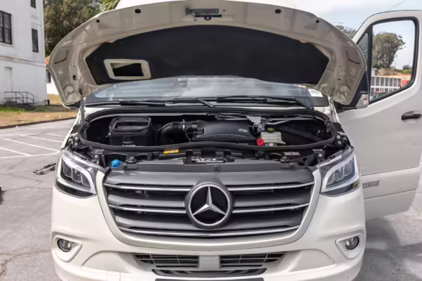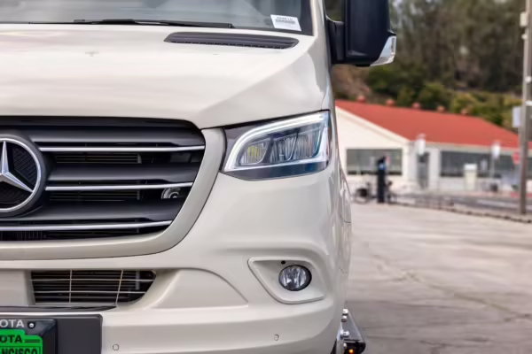 Winnebago Boldt RV conversion (includes side steps, sliding side windows, awning, trailer hitch, rear-mounted ladder, roof rack, 16-inch wheels, Katzkin leather upholstery, twin folding beds, countertop, folding table, Nova Kool fridge, High Pointe microwave, single-burner induction cooktop, stainless-steel sink, shower, toilet, storage cabinets, wardrobe with adjustable and removable shelves, vinyl flooring, window shades, door screens, LED interior lighting, roof-mounted vent, Coleman air conditioning system, Truma Combi Eco Plus heater, electrical outlets, USB charging ports, television, KING OmniGo antenna, roof-mounted solar panels, inverter, AC/DC load center/converter, and systems monitoring panel)