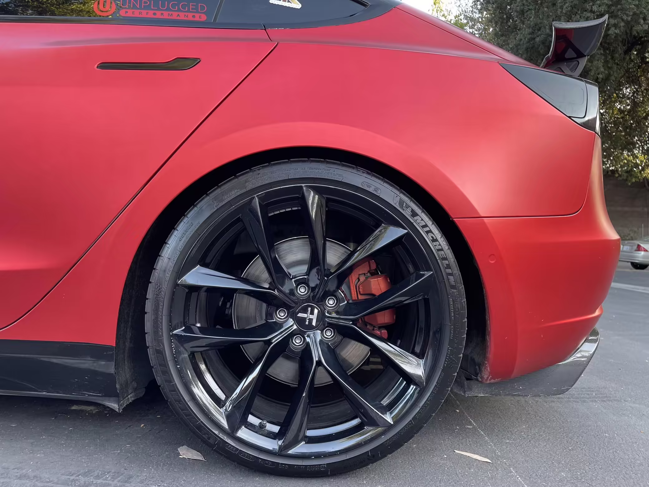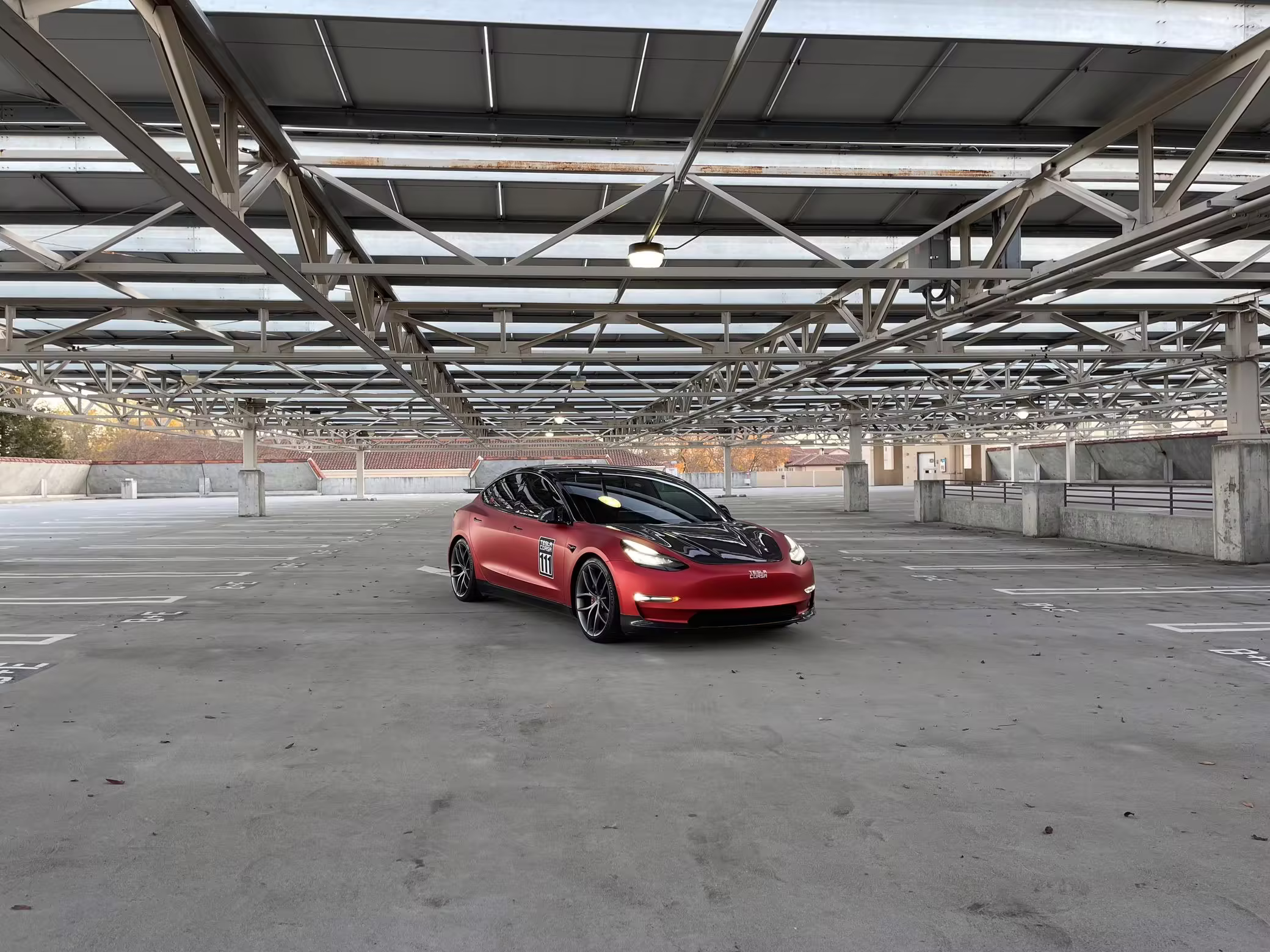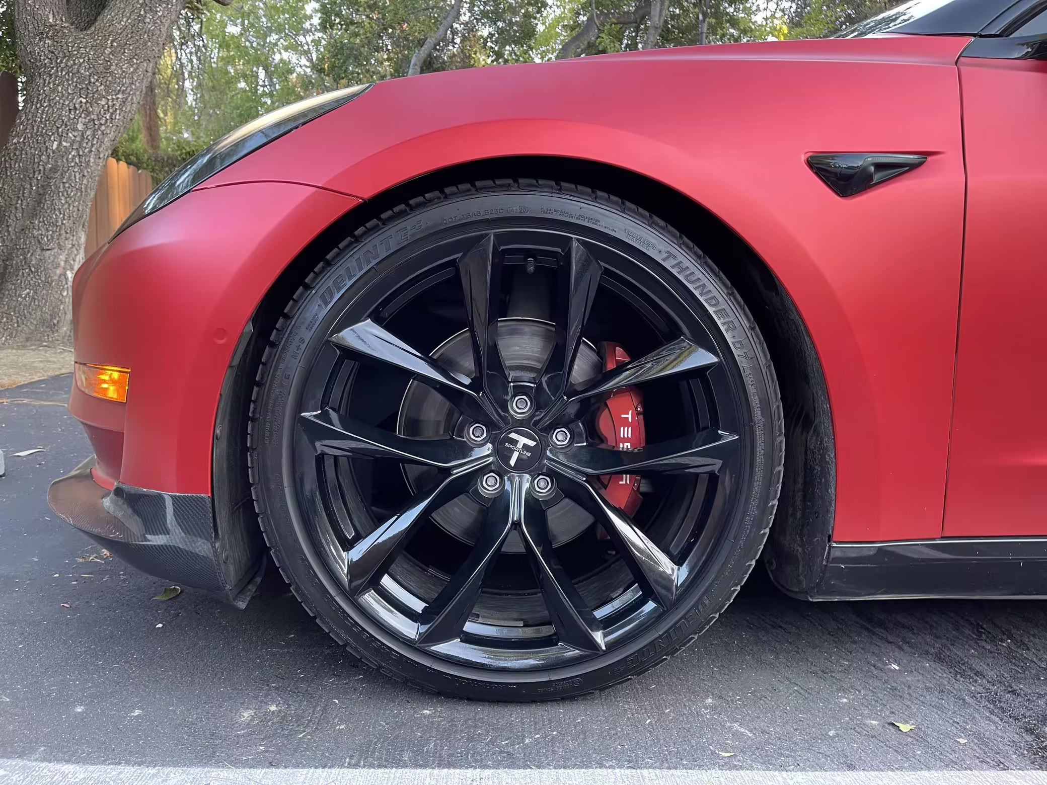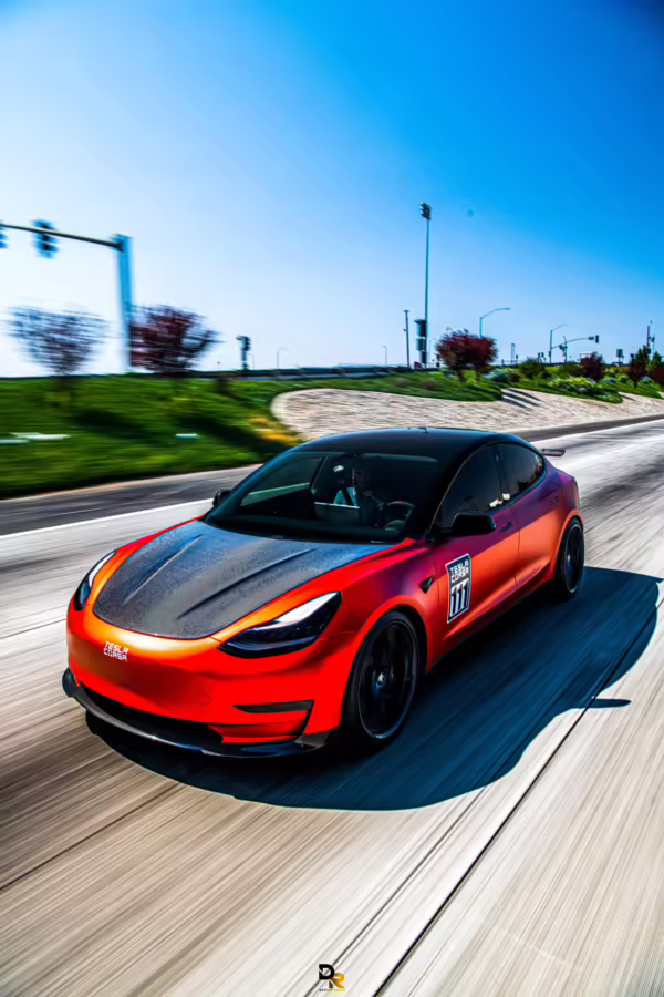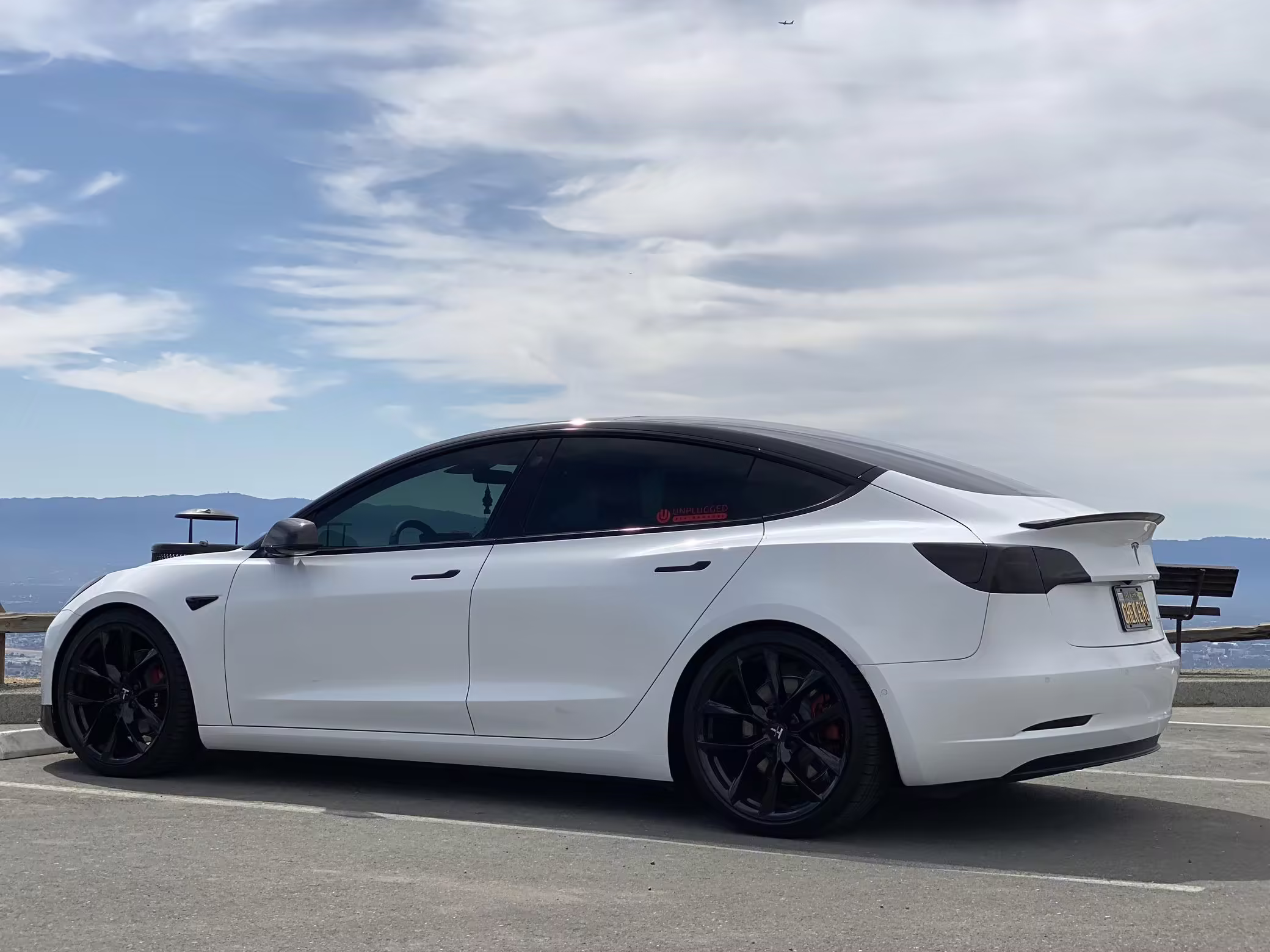 This Model 3 is powered by dual electric motors, which draw electricity from a lithium-ion battery pack to power the wheels with approximately 450 horsepower and 471 lb-ft of torque.