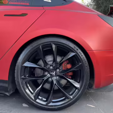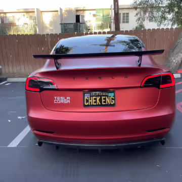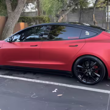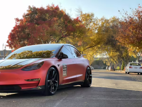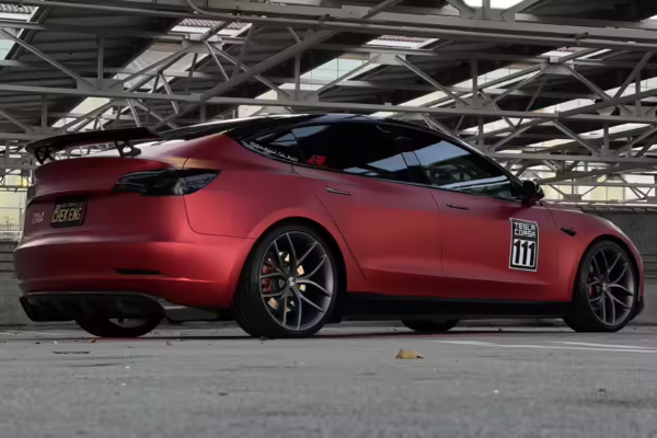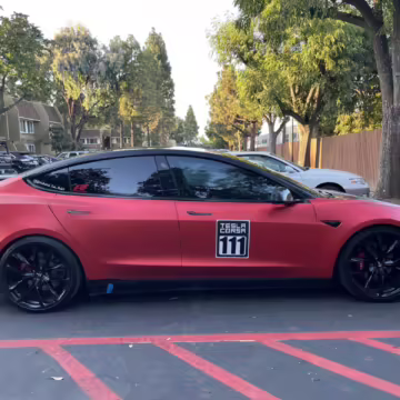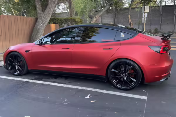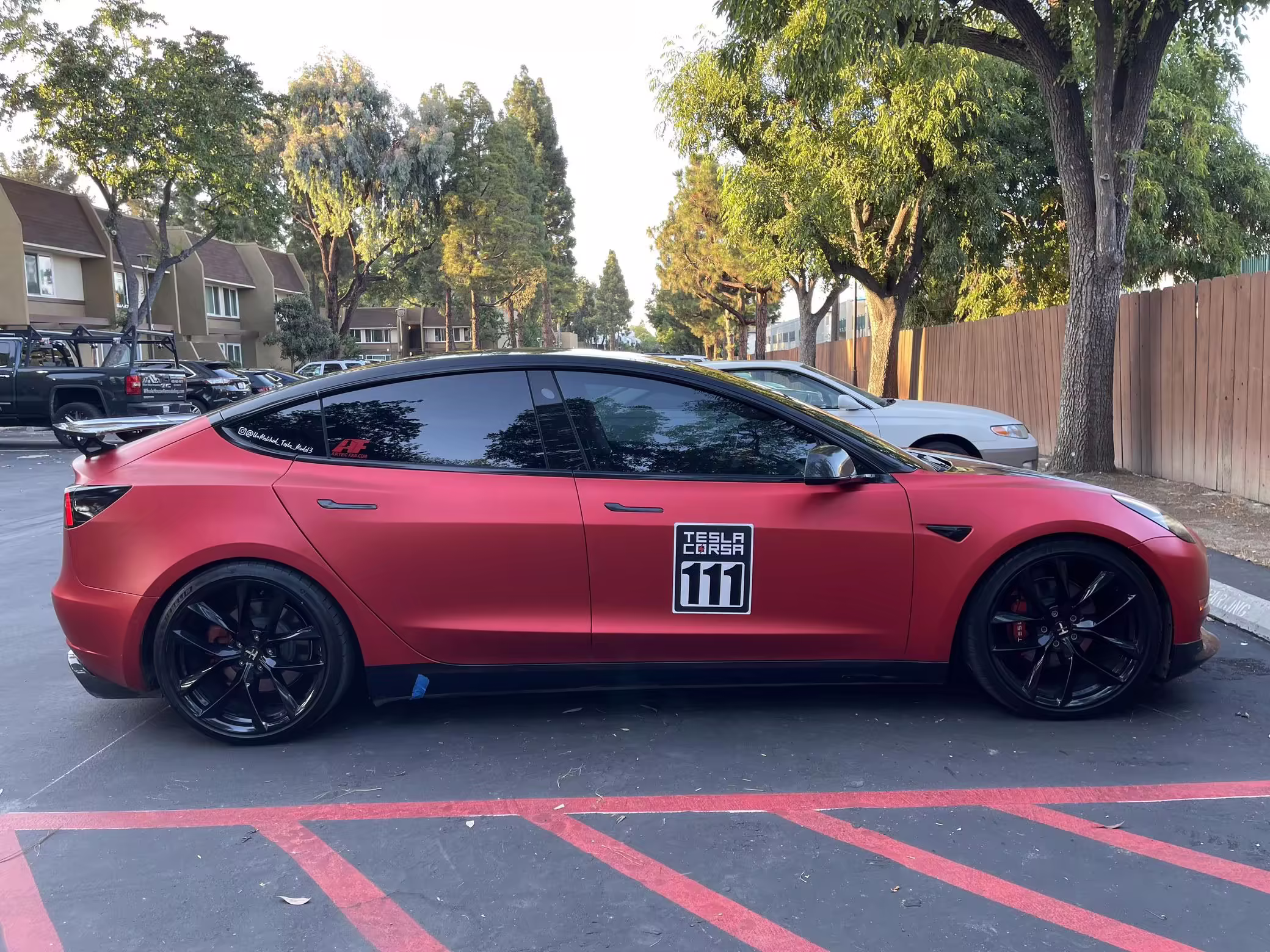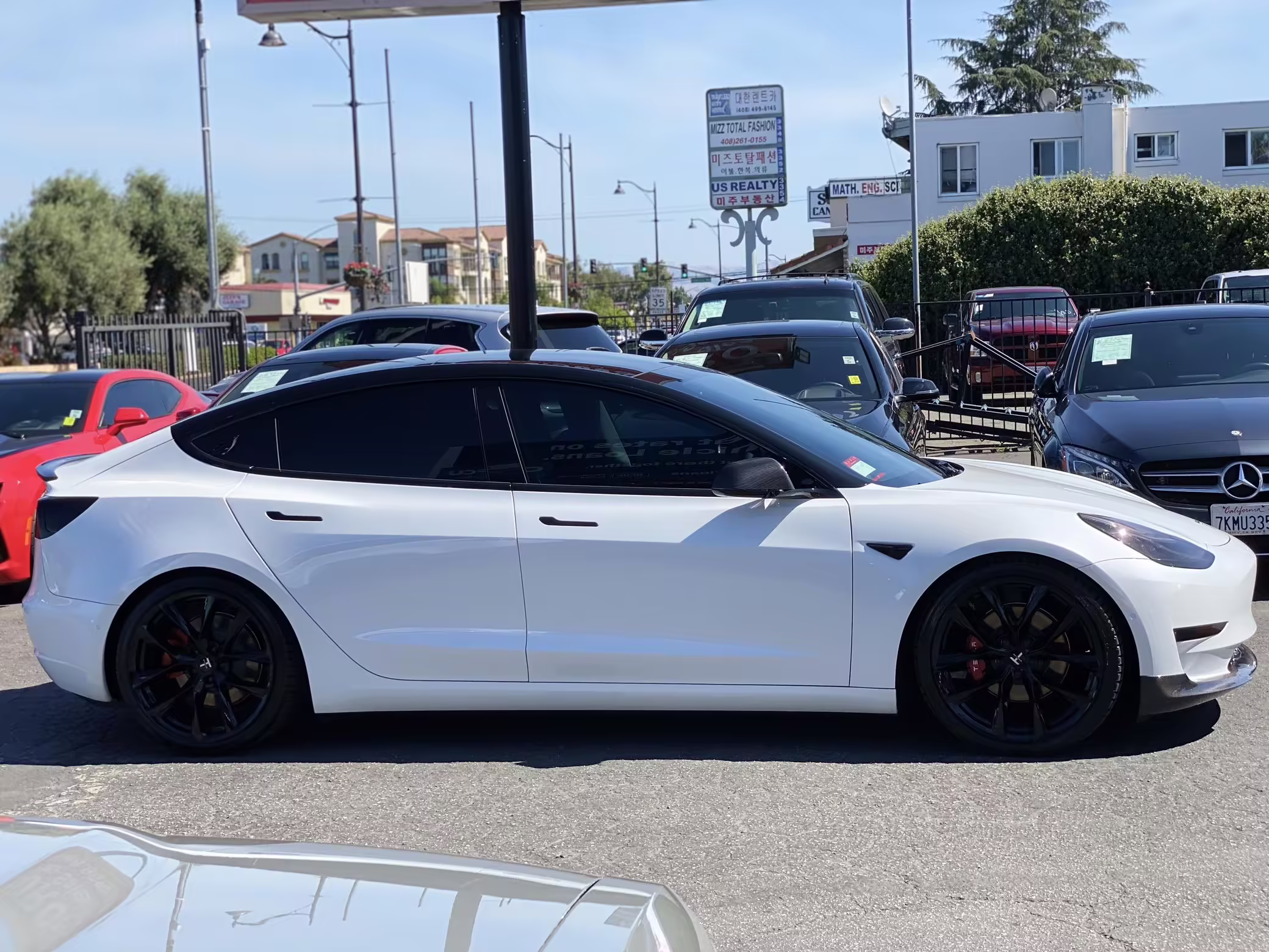 2019 Tesla Model 3 Performance, finished in white with a red body wrap and a black interior.