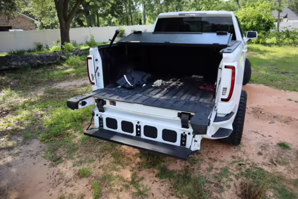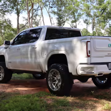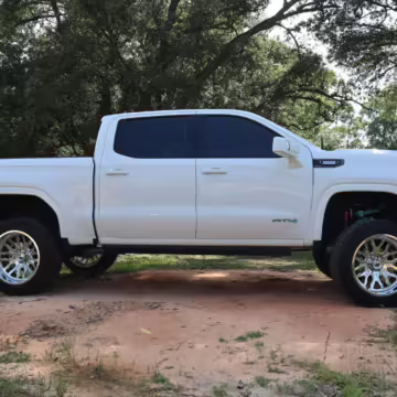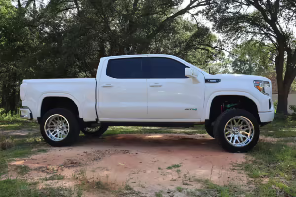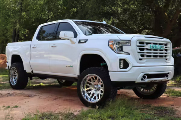 The newest generation of the GMC Sierra is a cool rig that sets itself apart from its Chevrolet sibling with tough looks – and the “AT4” model is the off-road variant that boasts a 2-inch lift, skid plates, a terrain-selectable traction control system, and a locking rear differential. This particular AT4 is equipped with the desirable 3.0-liter Duramax turbodiesel engine, and it’s been modified with a 6-inch lift, larger wheels and tires, Fox shocks, color-matched body trim, power-retractable side steps, a custom speaker system, and more.