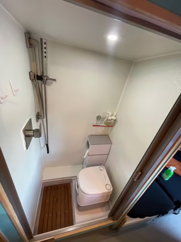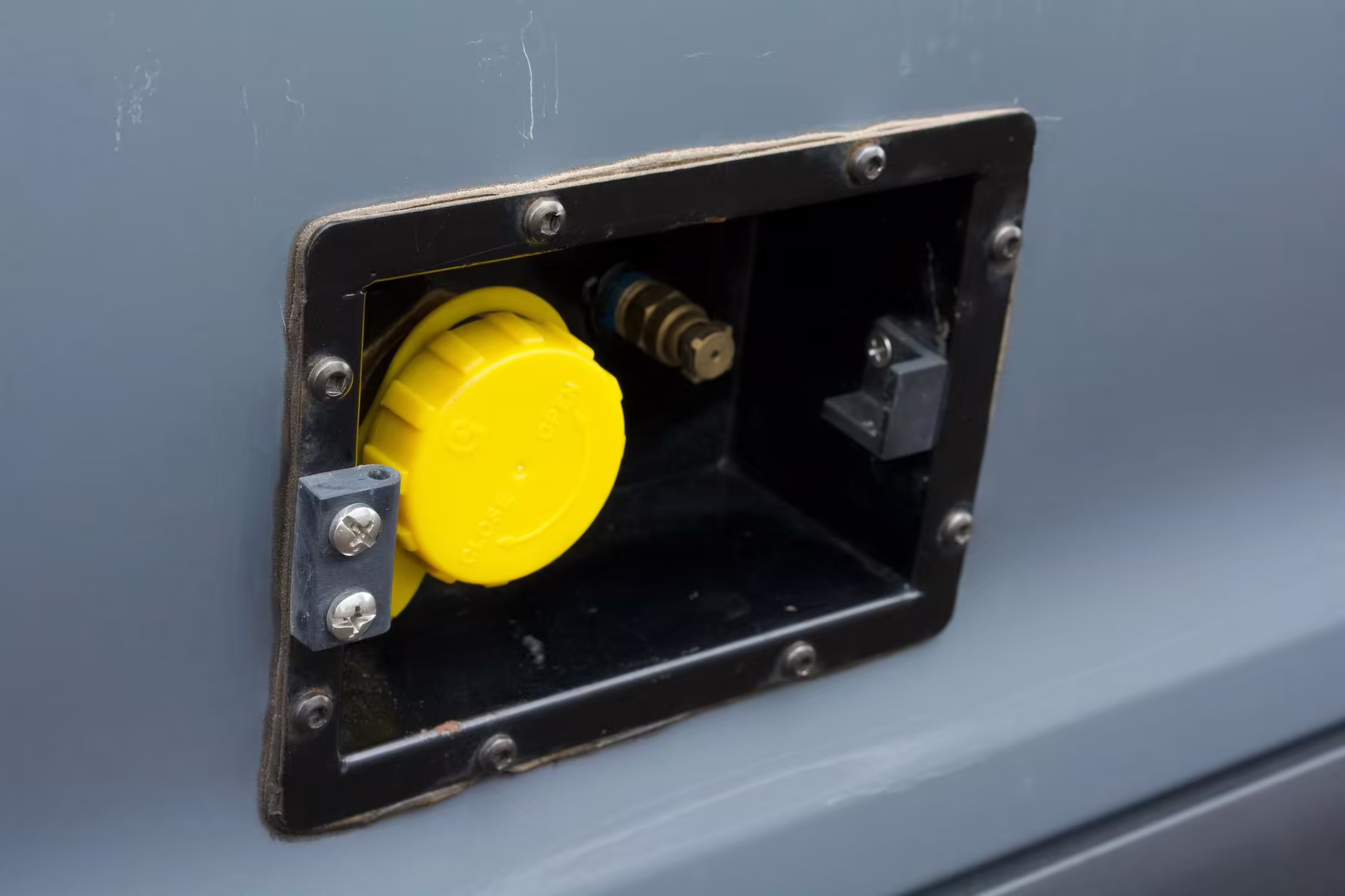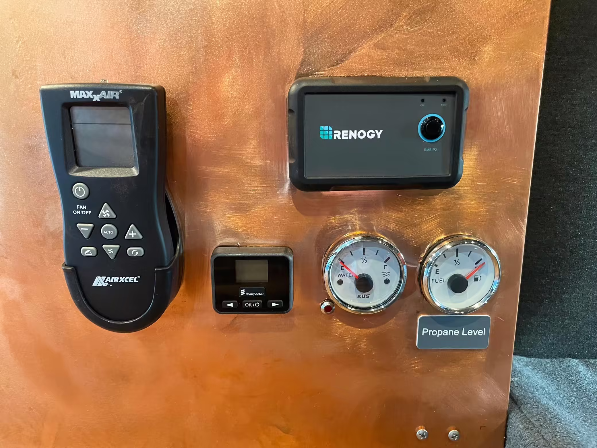 Command center with gauges for fresh water and propane levels, gray water 80% capacity warning light