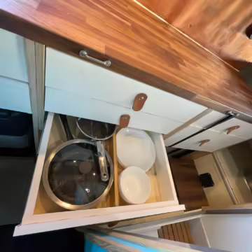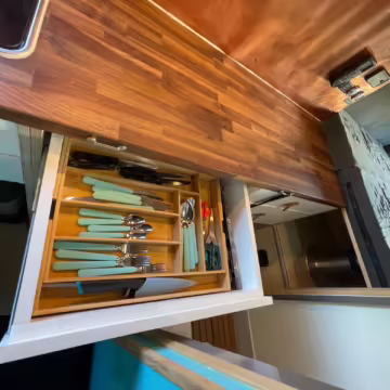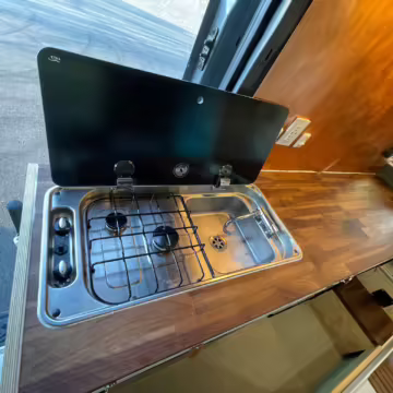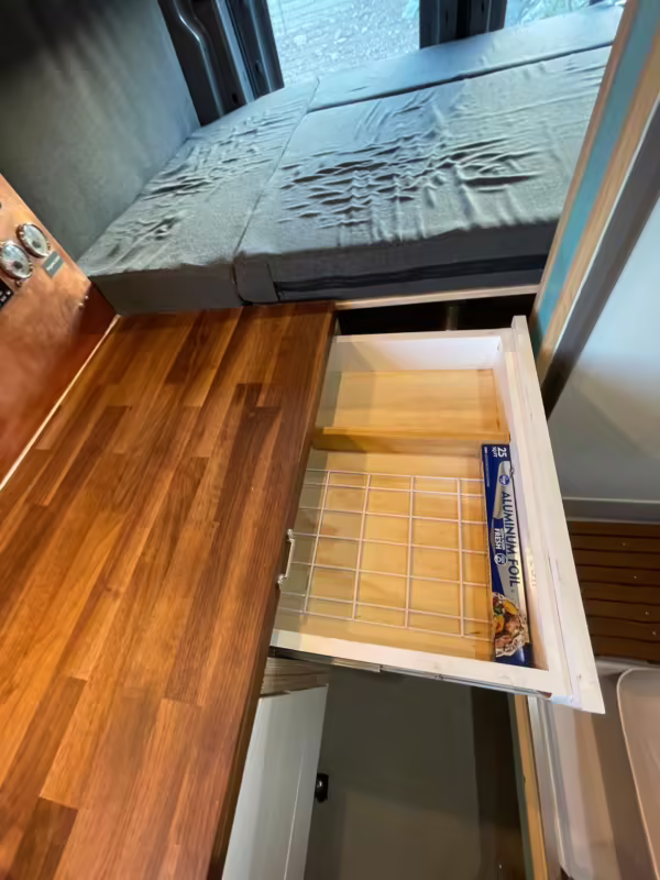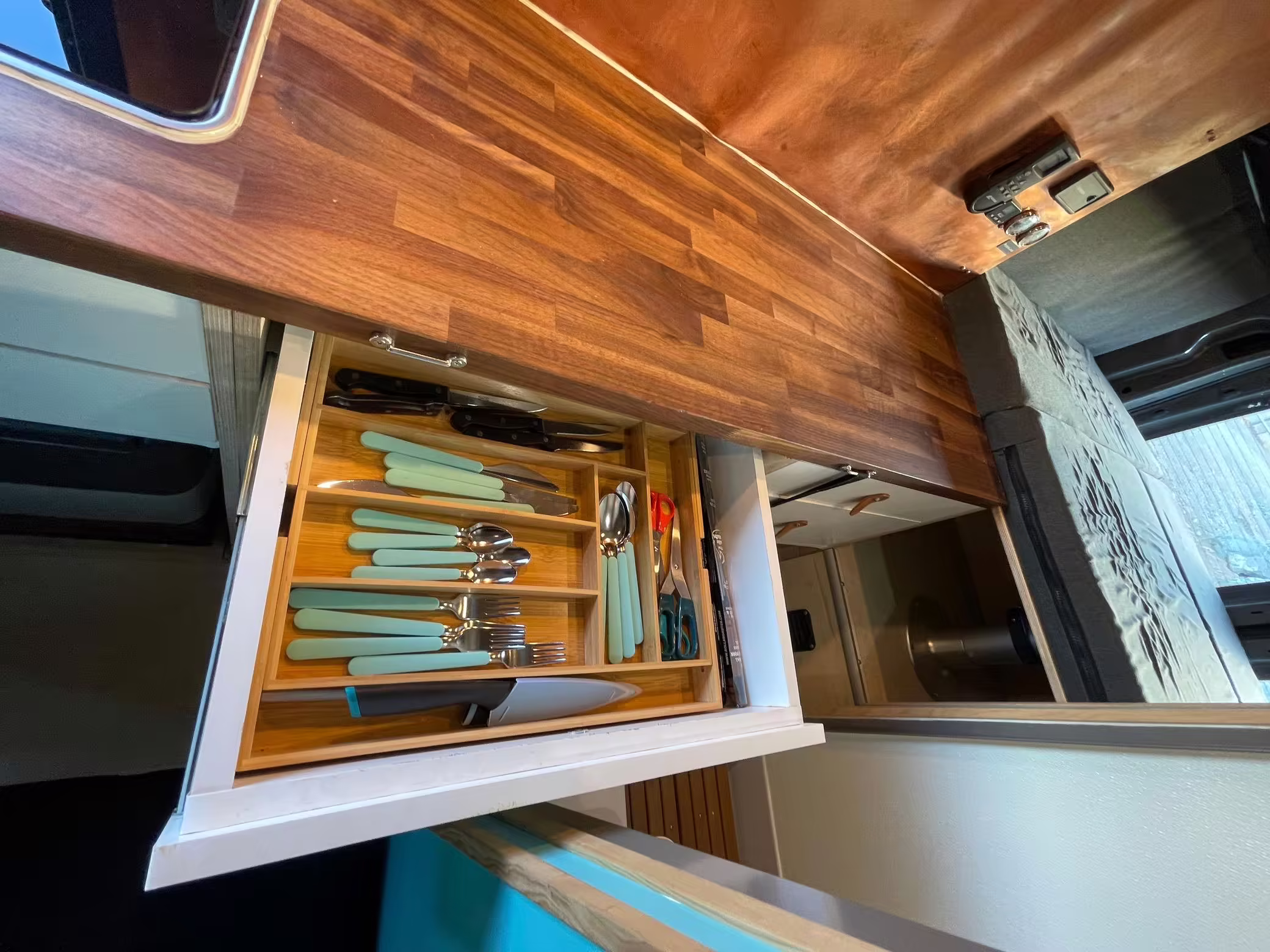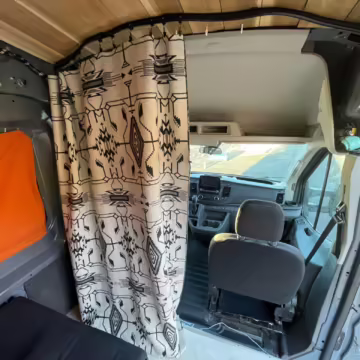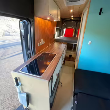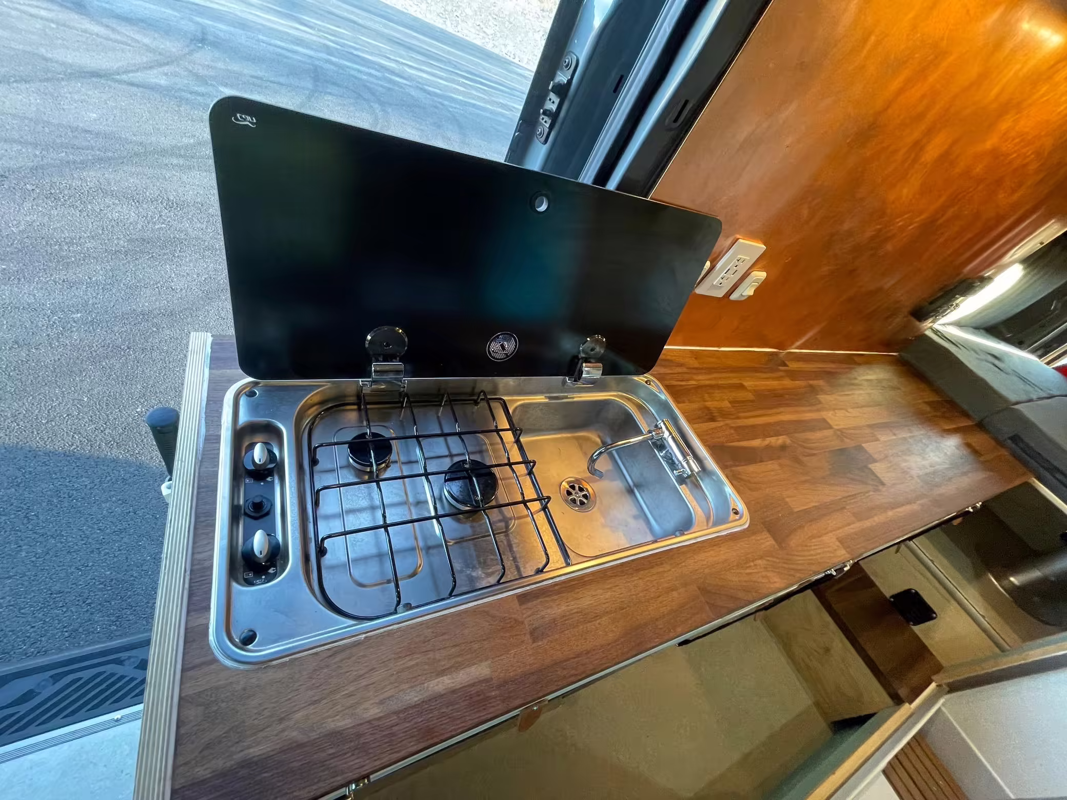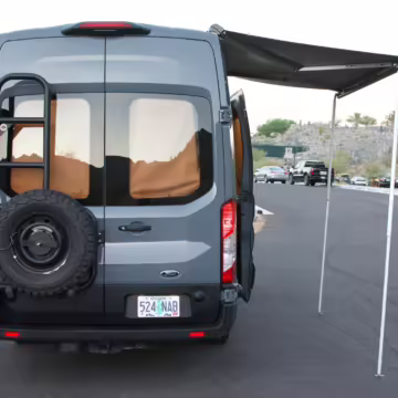 This Transit has been converted to a custom camper van. Modifications reported by the seller include 2 100-watt solar panels, a 12.5-foot wide and 7-foot extending Fiamma F80s awning, a rear sleeping and dining area with convertible 6-foot queen-size bed, a 6-drawer kitchen galley with hold-down straps, a CAN Campervan two-burner propane cooktop with sink, and more as detailed below.