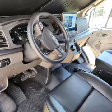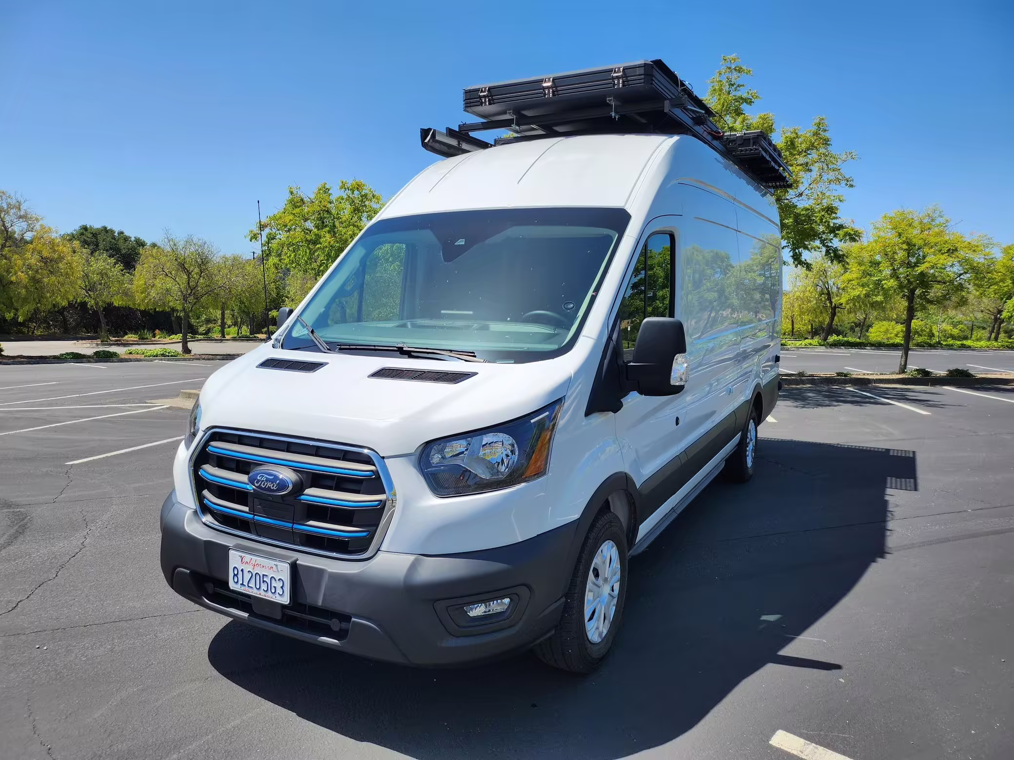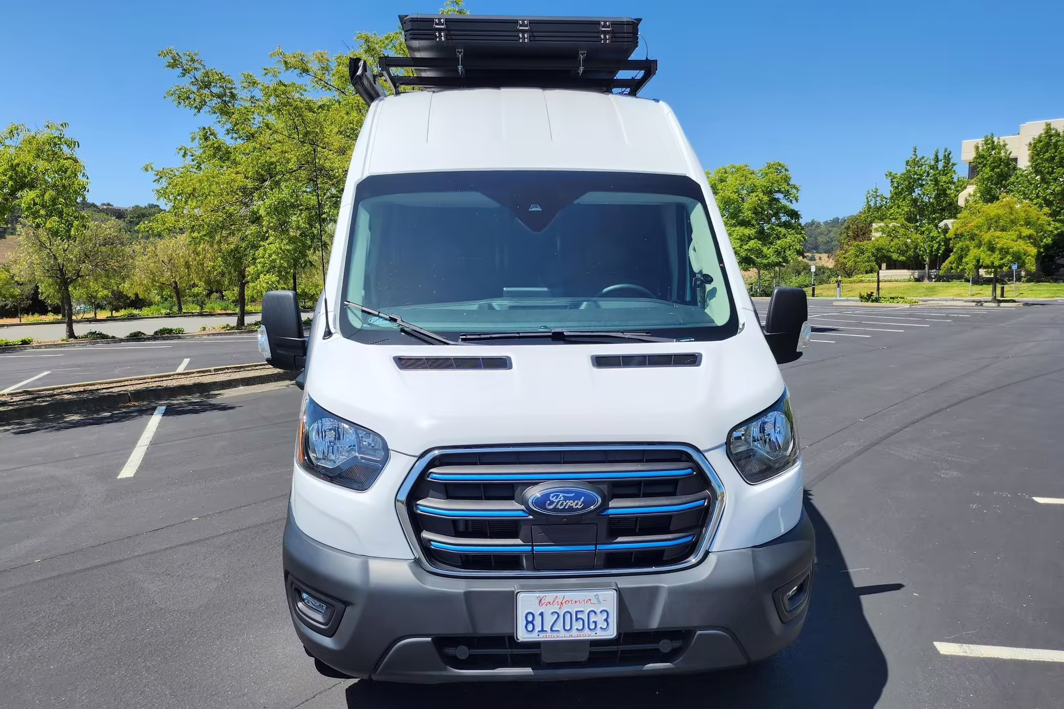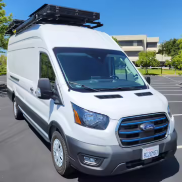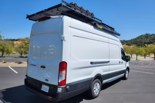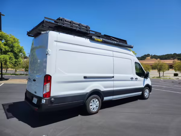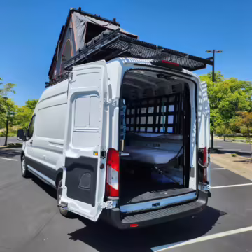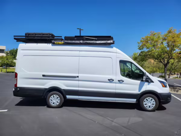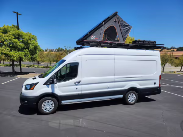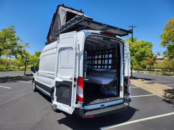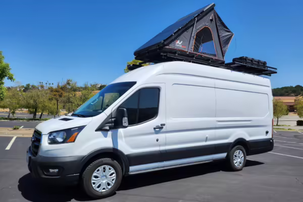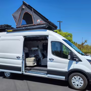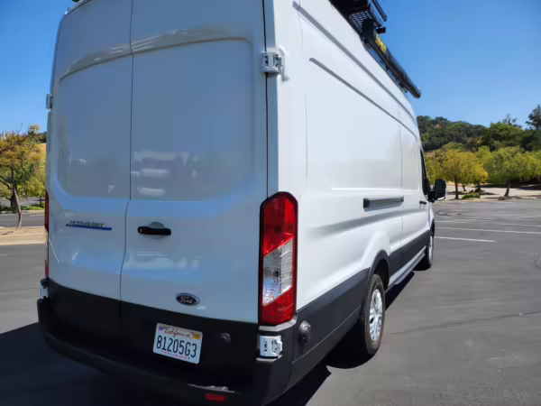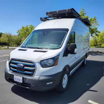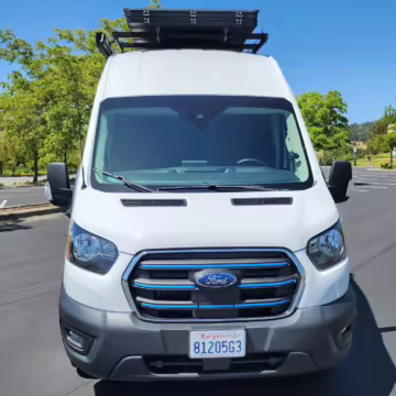 This E-Transit has been converted to a custom camper. Notable modifications reported by the seller include a 400-watt solar system, an EcoFlow Delta Pro battery-A/C inverter system, Mercedes-Benz Sprinter-sourced captain’s chairs, dual collapsible bunk beds, a roof tent, and more as detailed below.