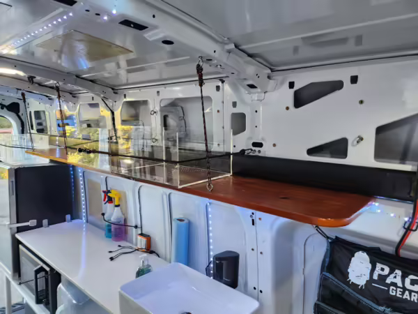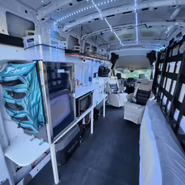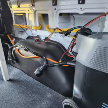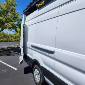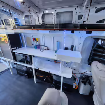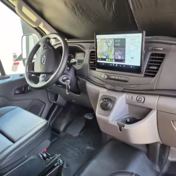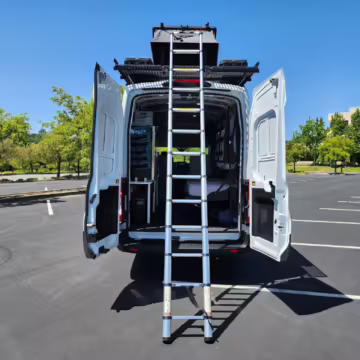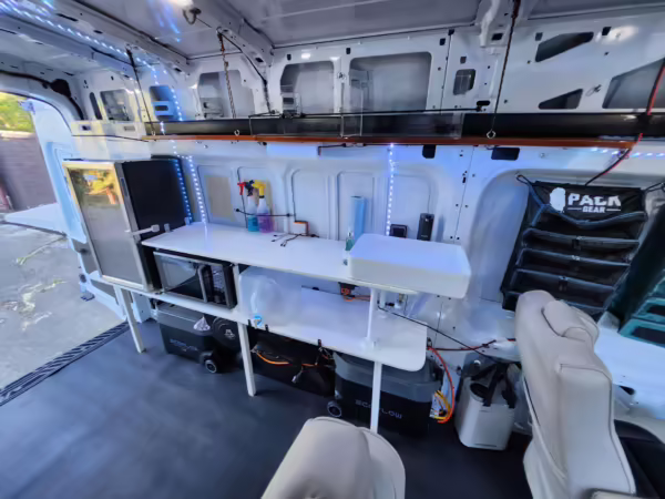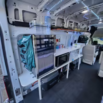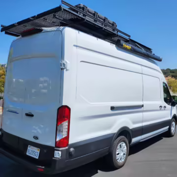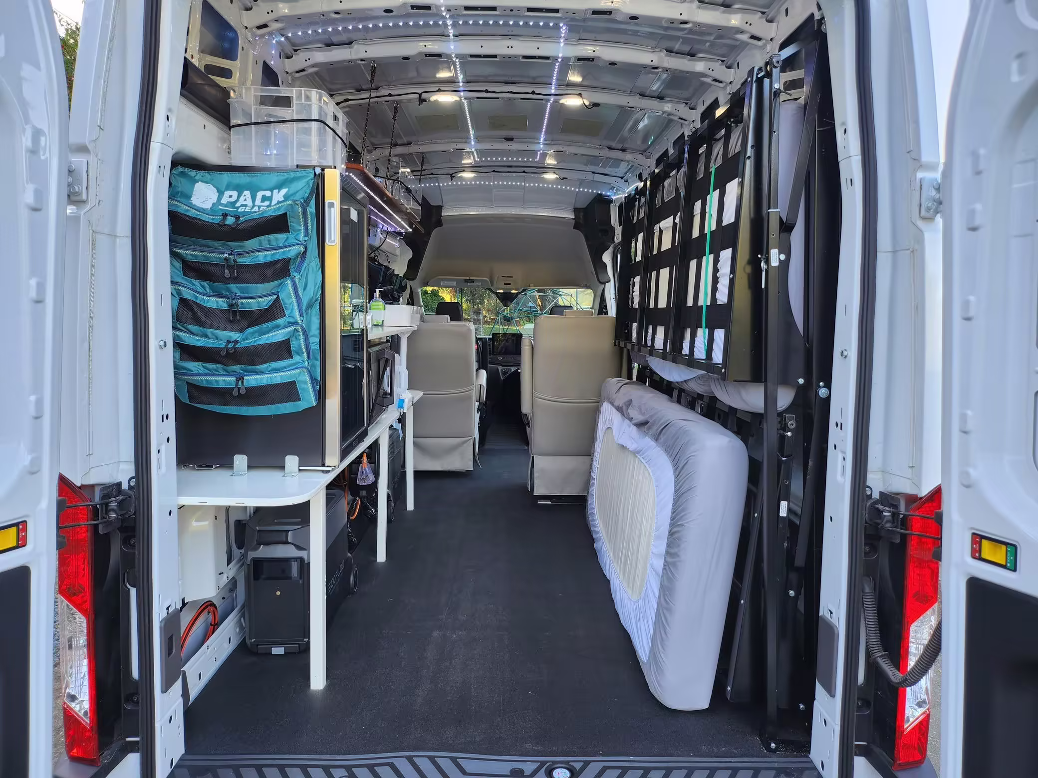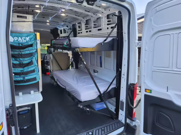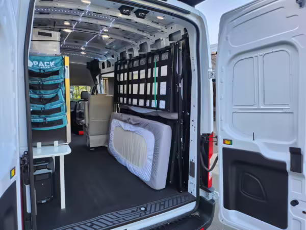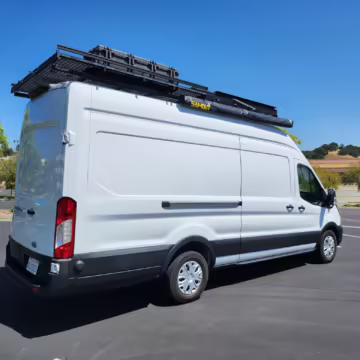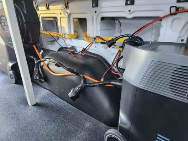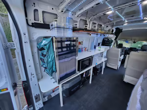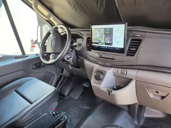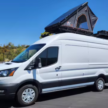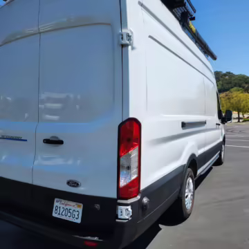 This E-Transit has been converted to a custom camper. Notable modifications reported by the seller include a 400-watt solar system, an EcoFlow Delta Pro battery-A/C inverter system, Mercedes-Benz Sprinter-sourced captain’s chairs, dual collapsible bunk beds, a roof tent, and more as detailed below.