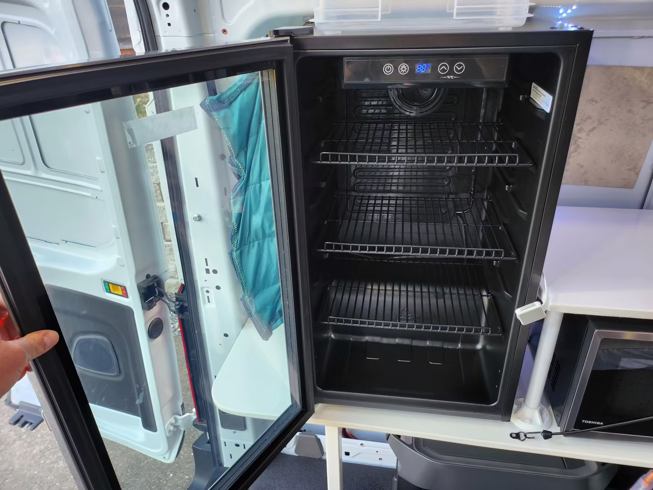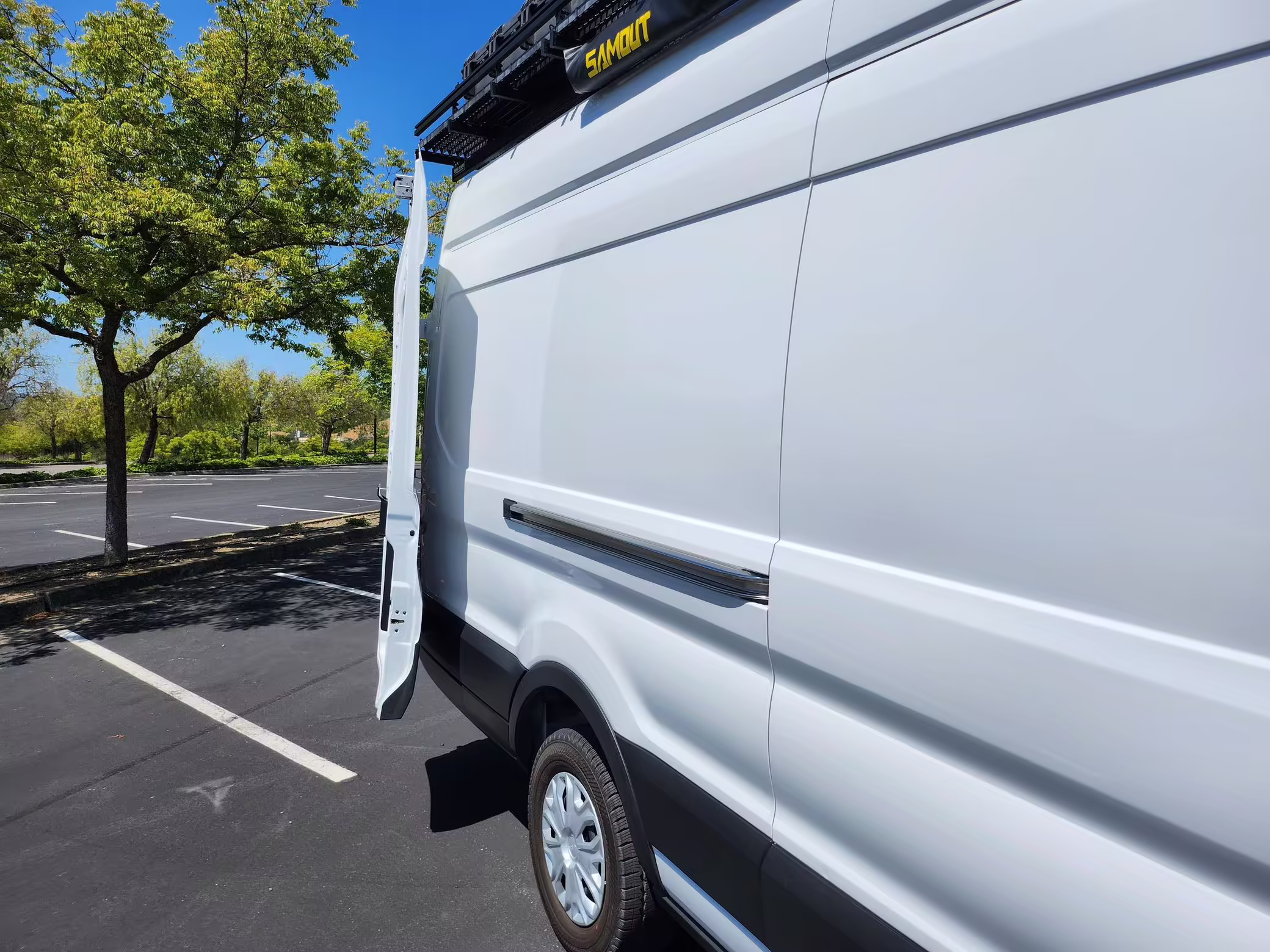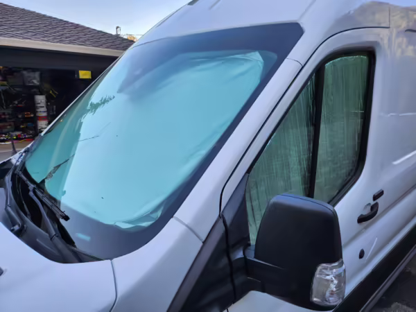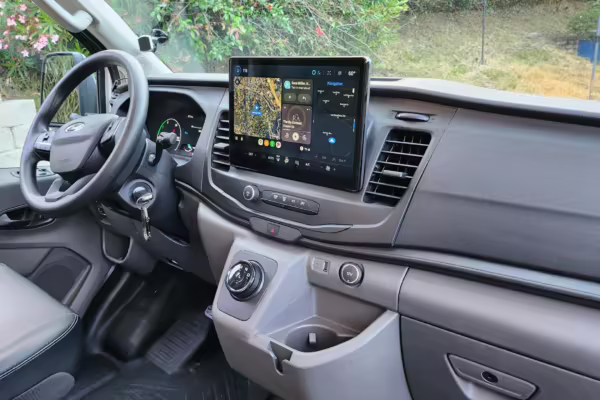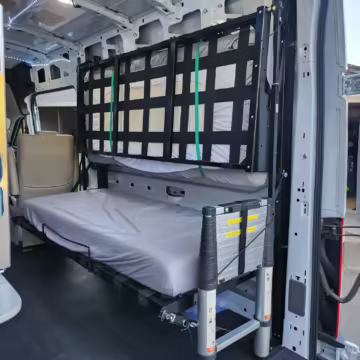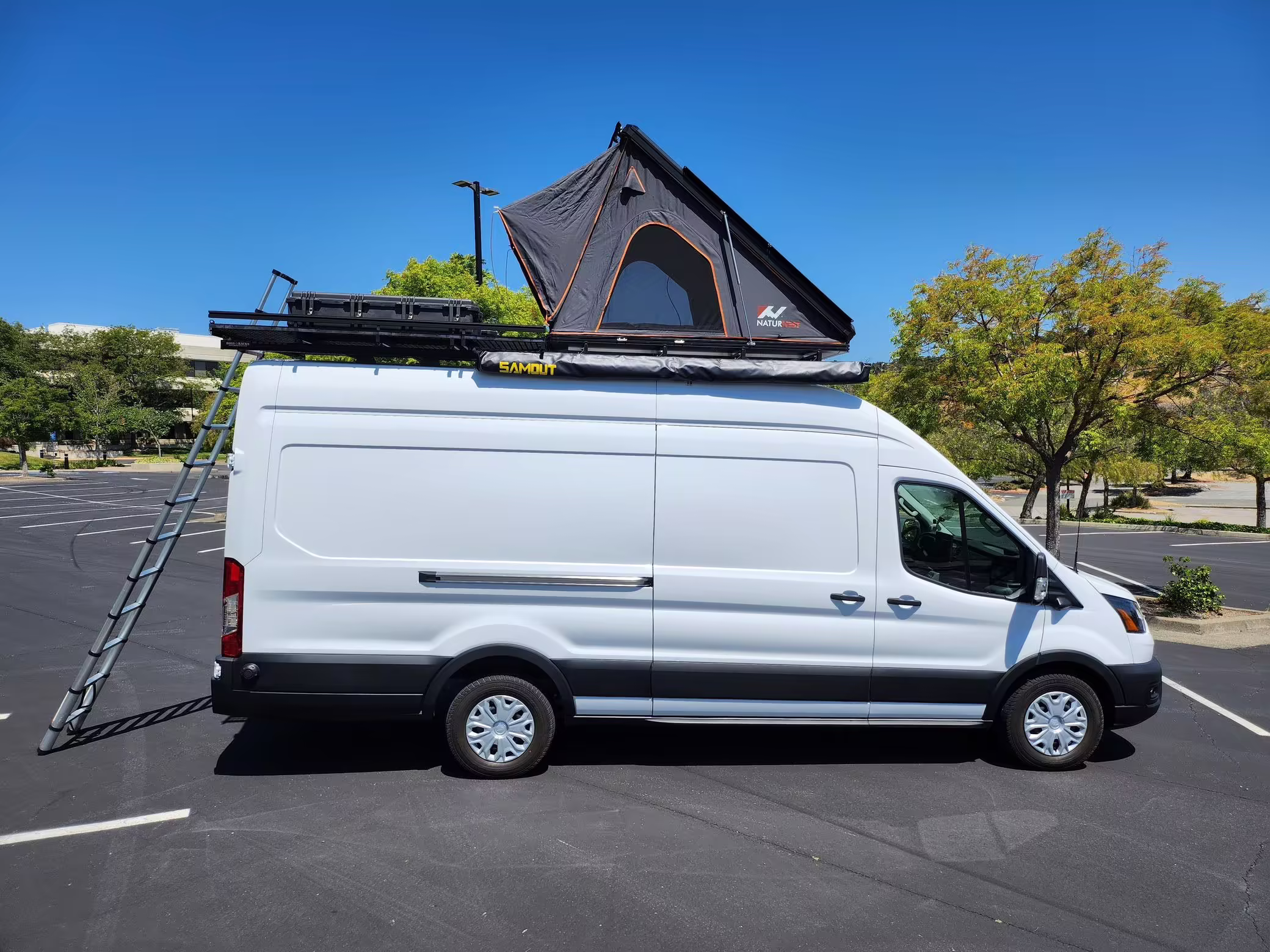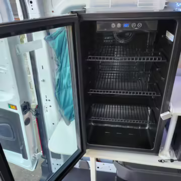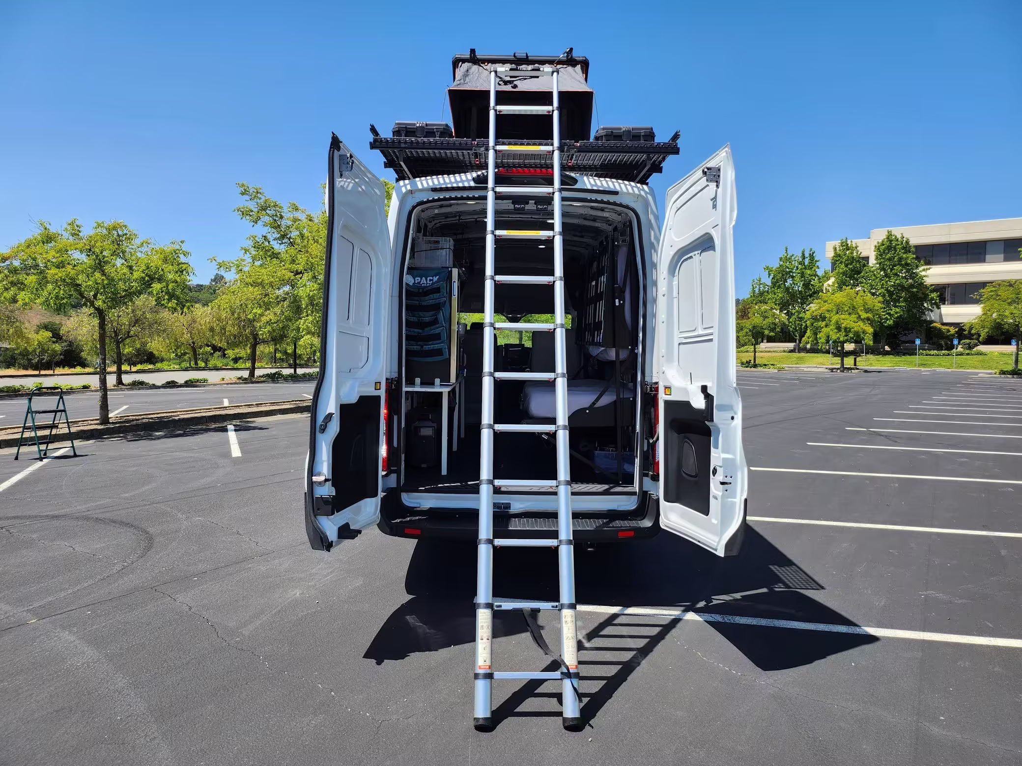 This E-Transit has been converted to a custom camper. Notable modifications reported by the seller include a 400-watt solar system, an EcoFlow Delta Pro battery-A/C inverter system, Mercedes-Benz Sprinter-sourced captain’s chairs, dual collapsible bunk beds, a roof tent, and more as detailed below.