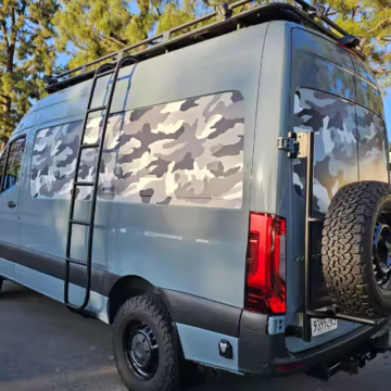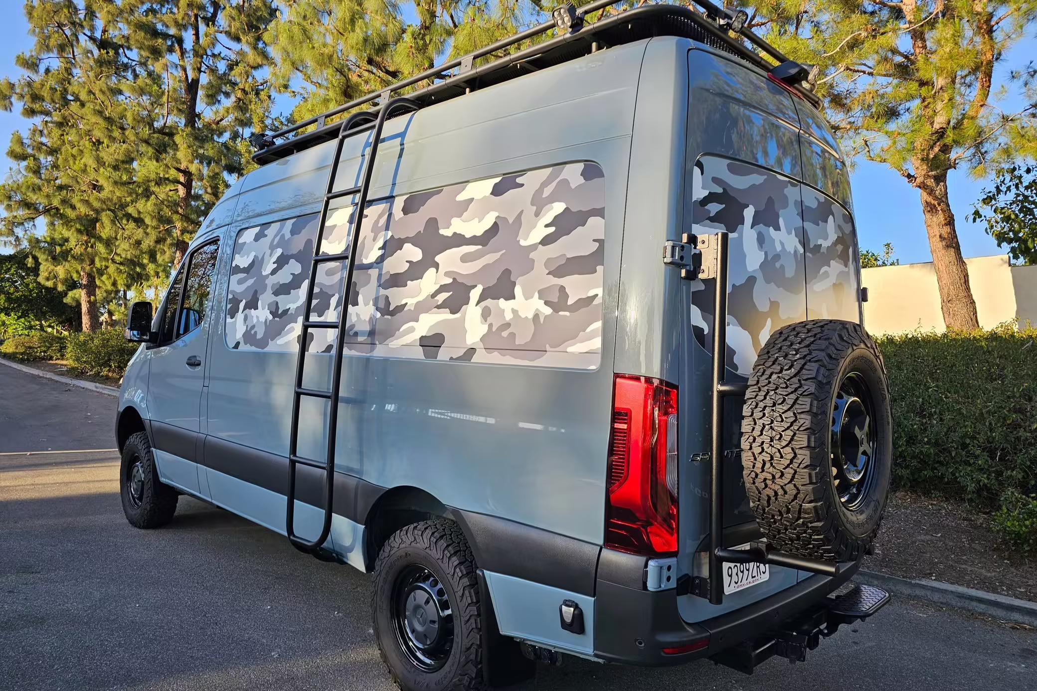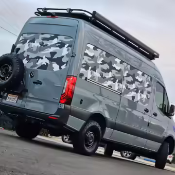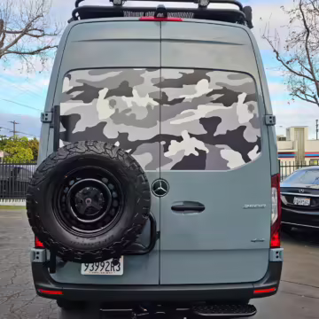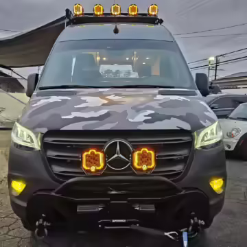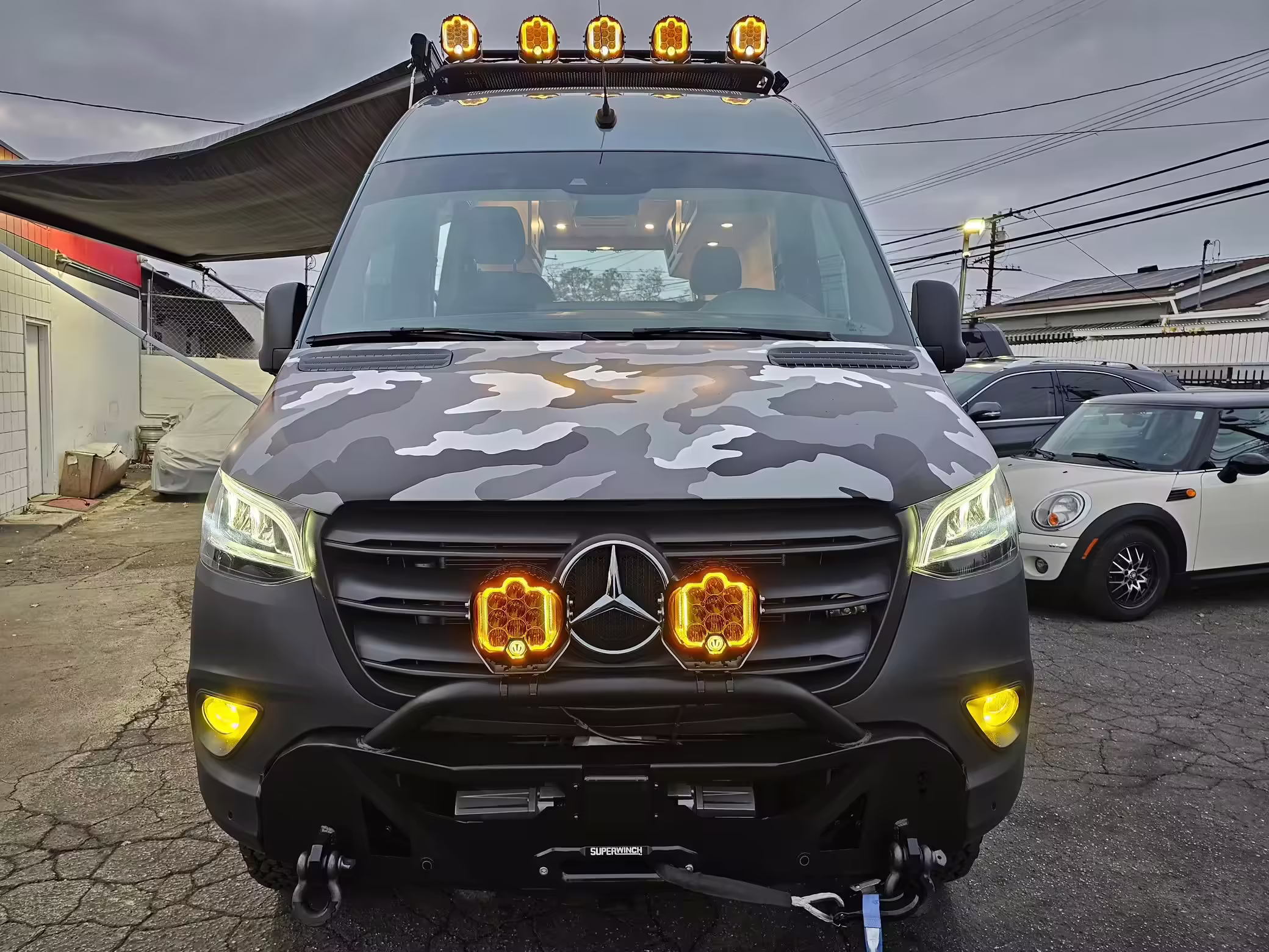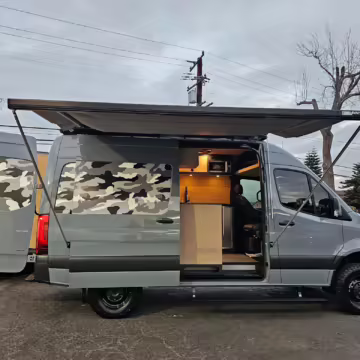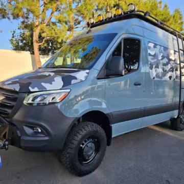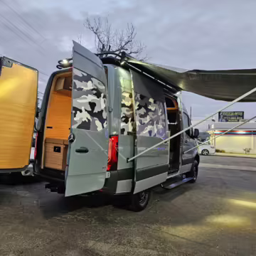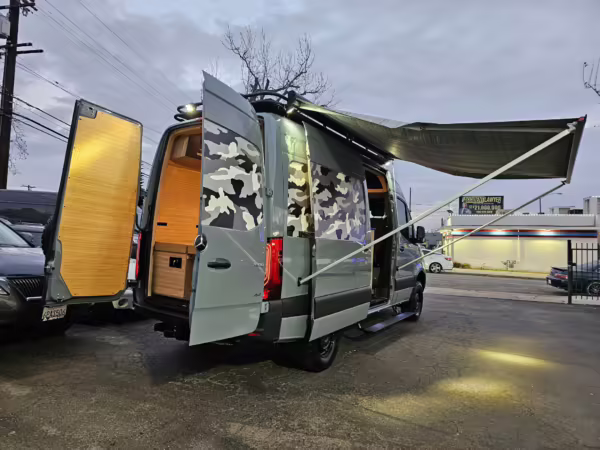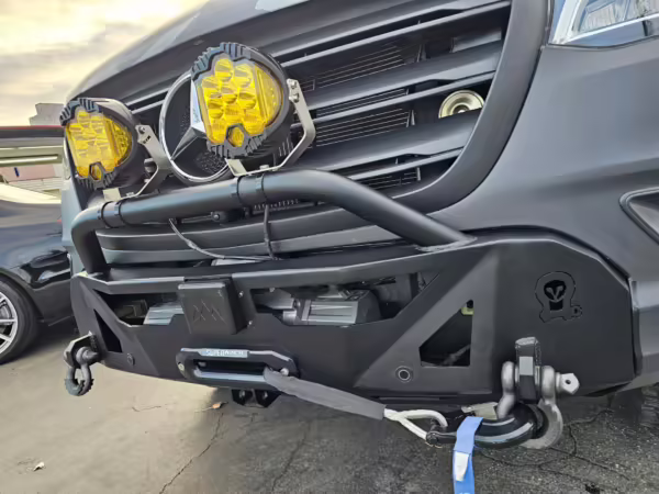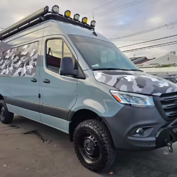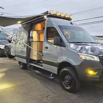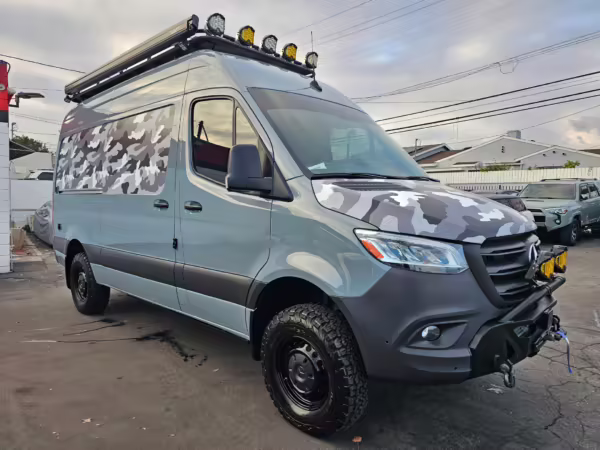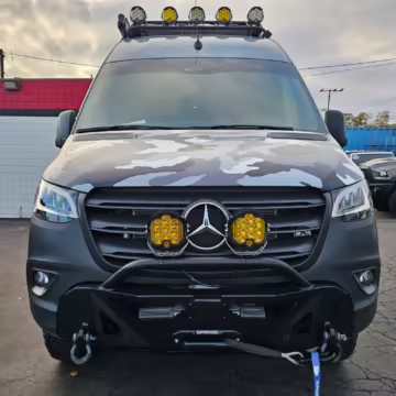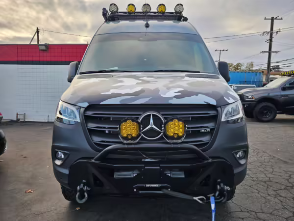 This Sprinter has been converted into a camper. Notable modifications reported by the selling dealer include an Owl Pismo front bumper, a Superwinch SX12SR front winch, a Fiamma awning, a Dometic A/C system, an Espar air heater, Zamp solar panels, a refrigerator, and more, as detailed below.