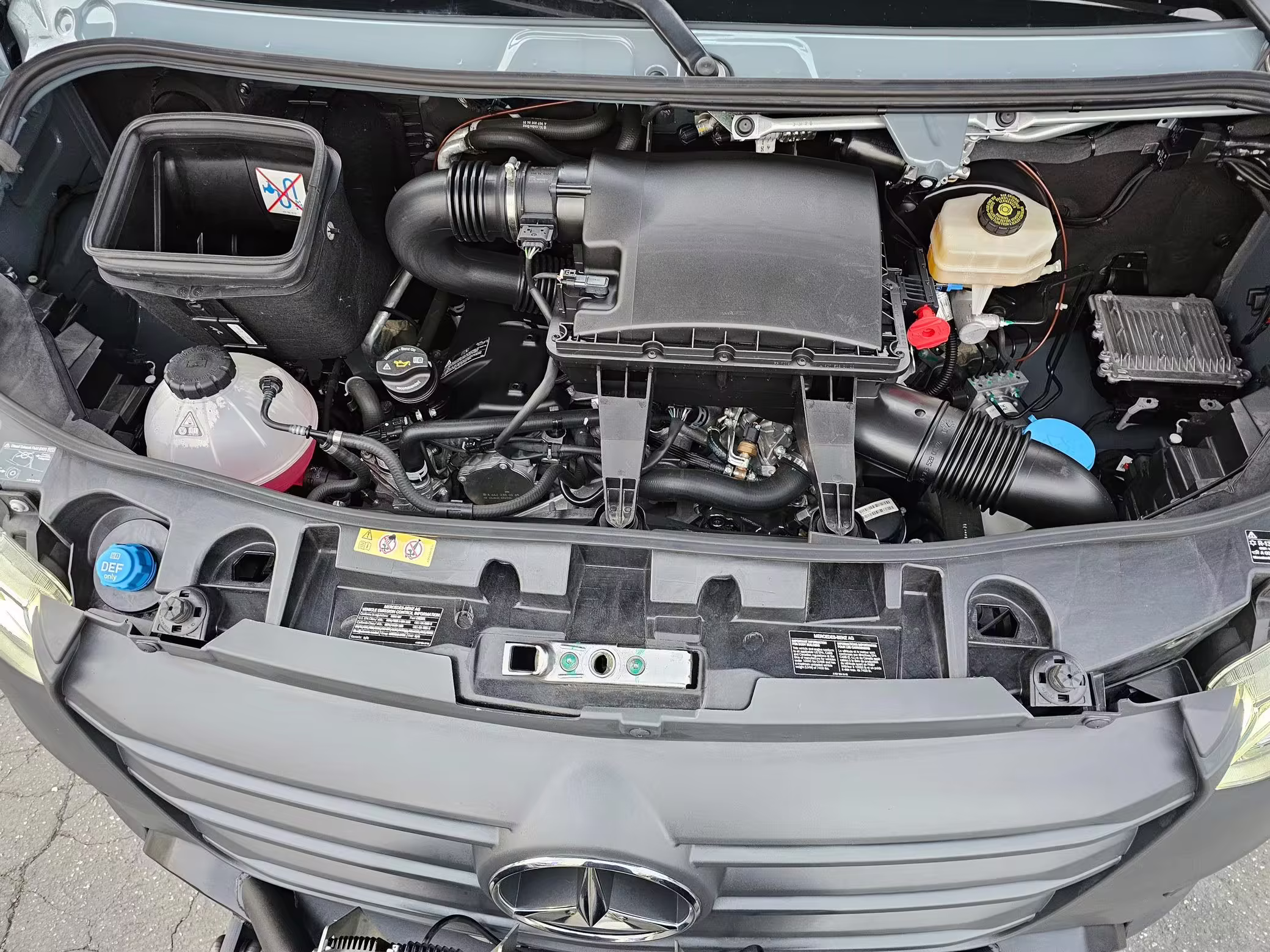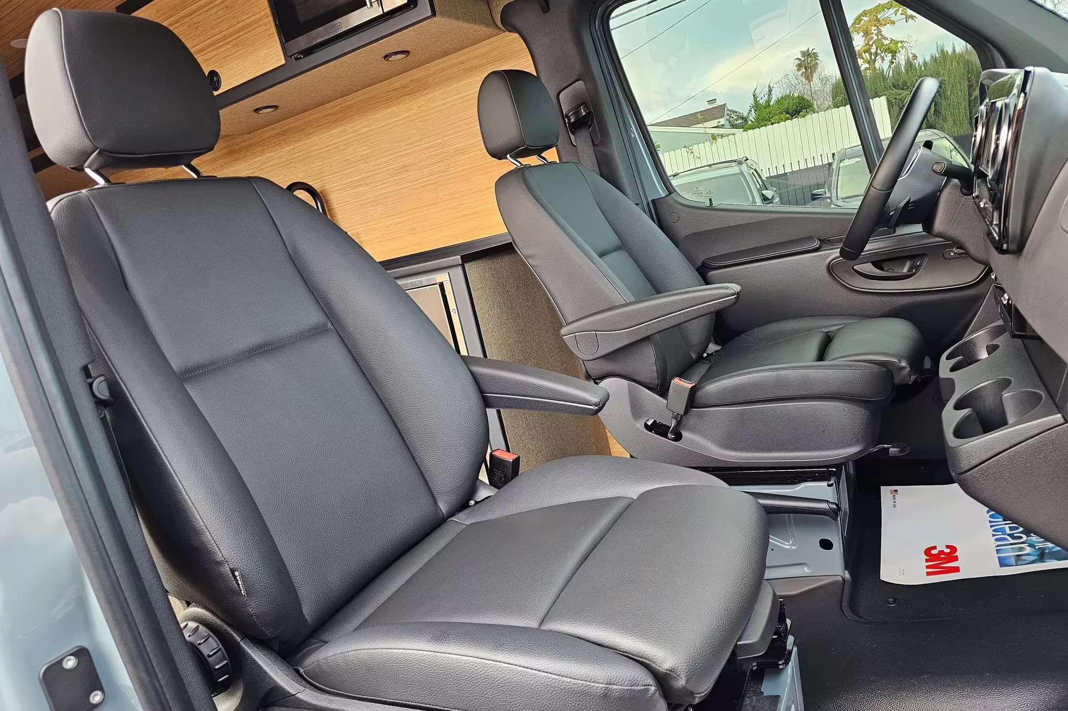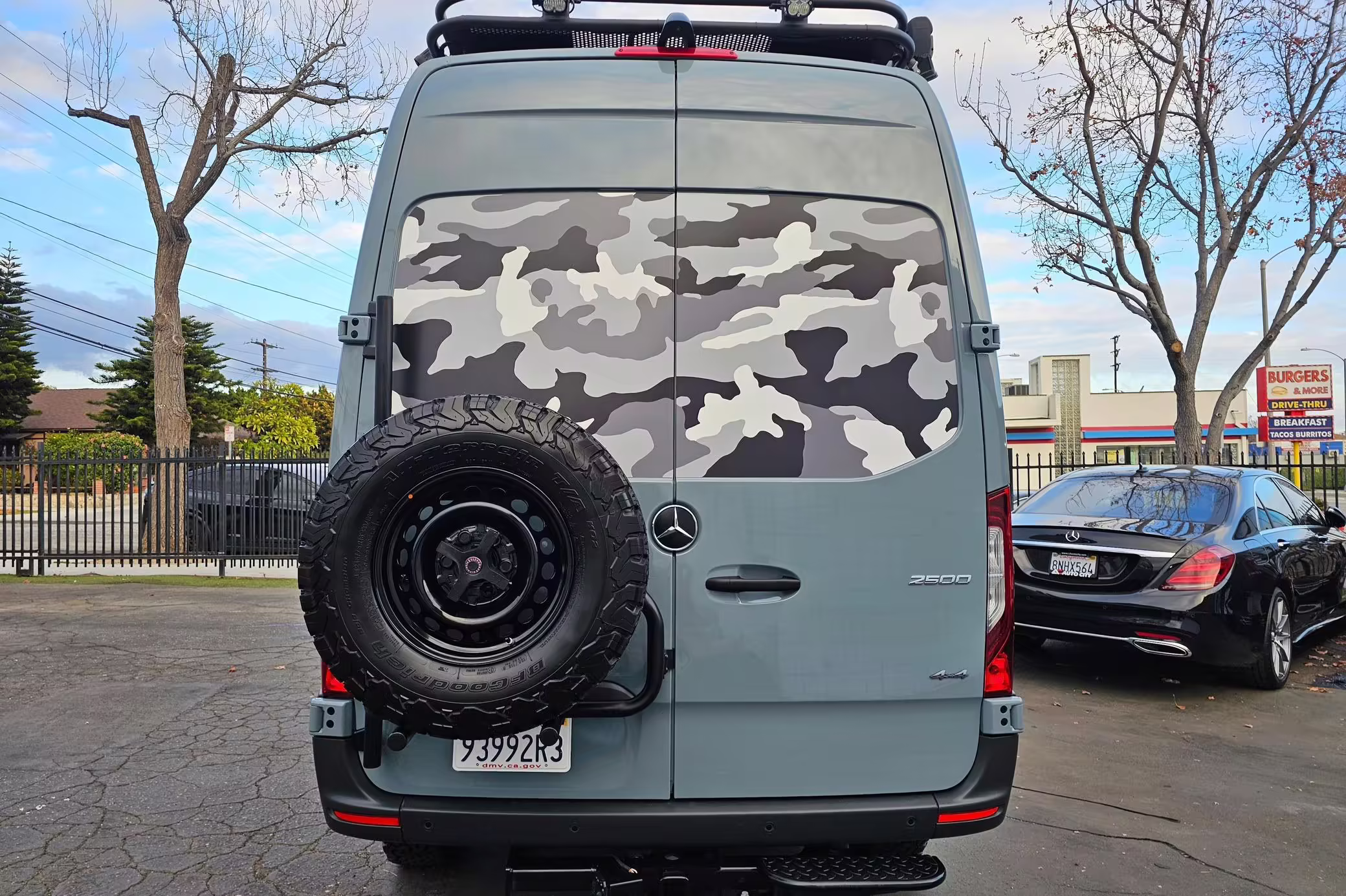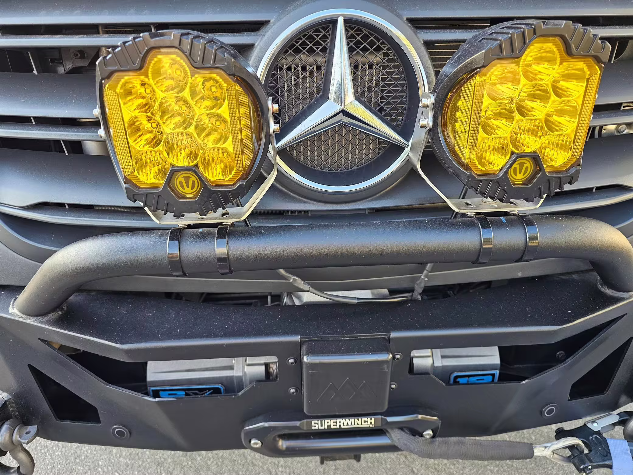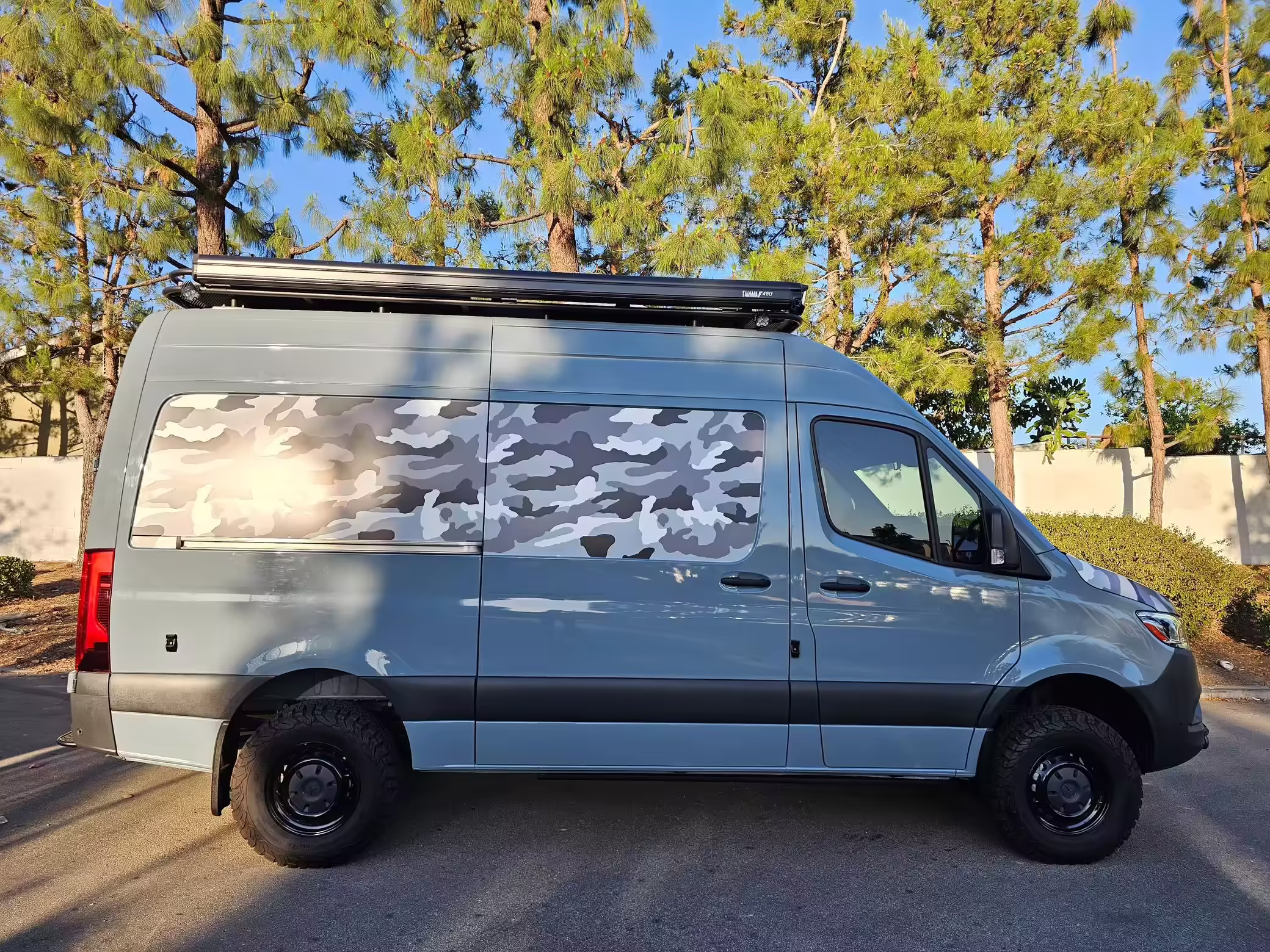 This Sprinter has been converted into a camper. Notable modifications reported by the selling dealer include an Owl Pismo front bumper, a Superwinch SX12SR front winch, a Fiamma awning, a Dometic A/C system, an Espar air heater, Zamp solar panels, a refrigerator, and more, as detailed below.