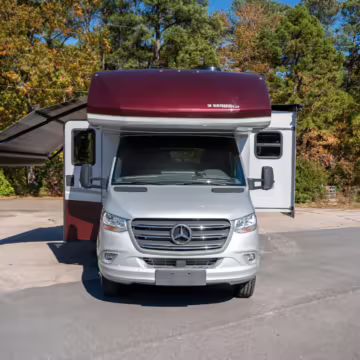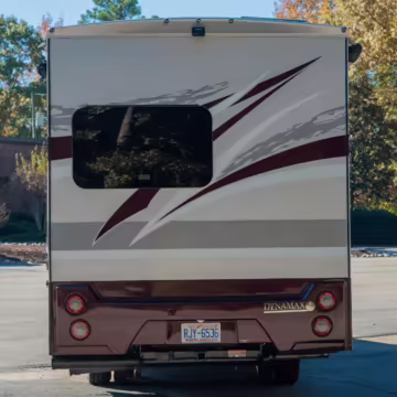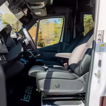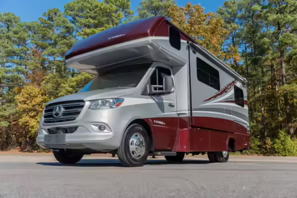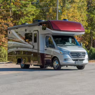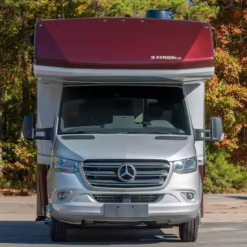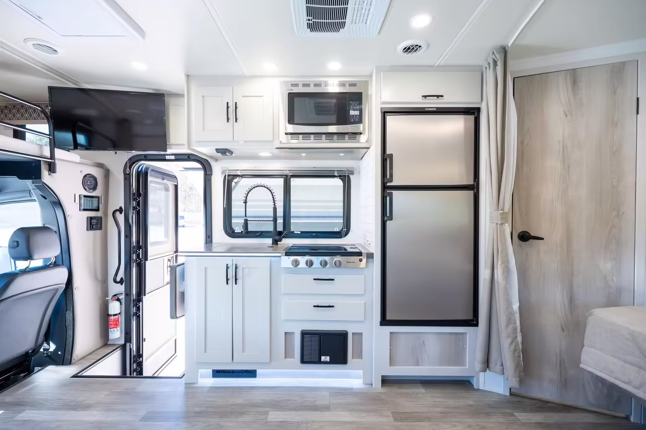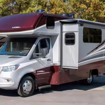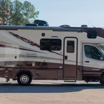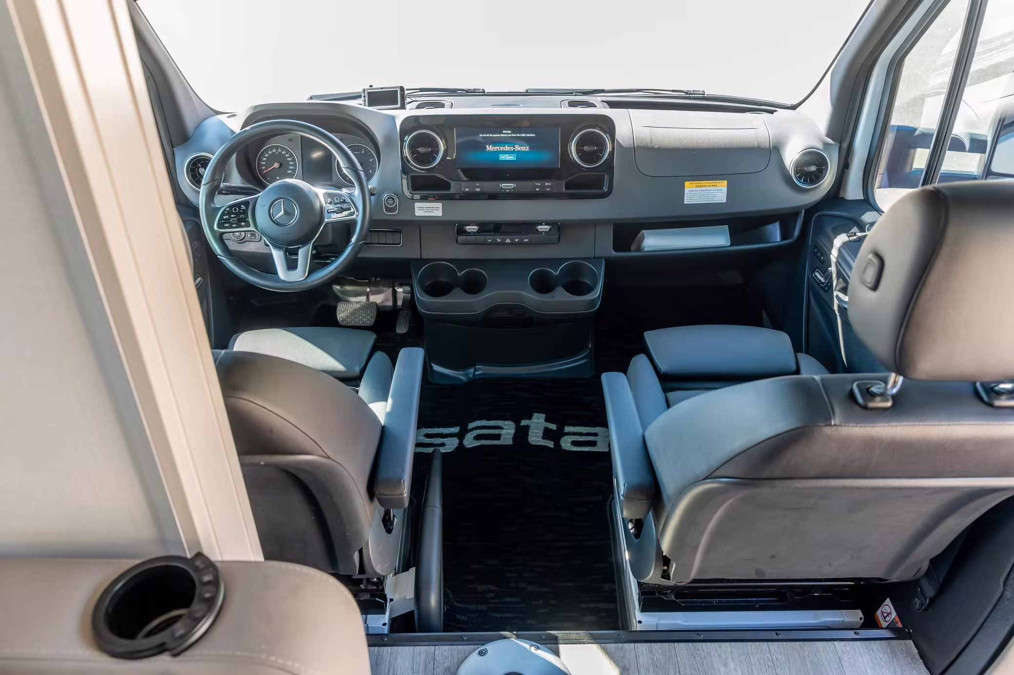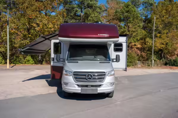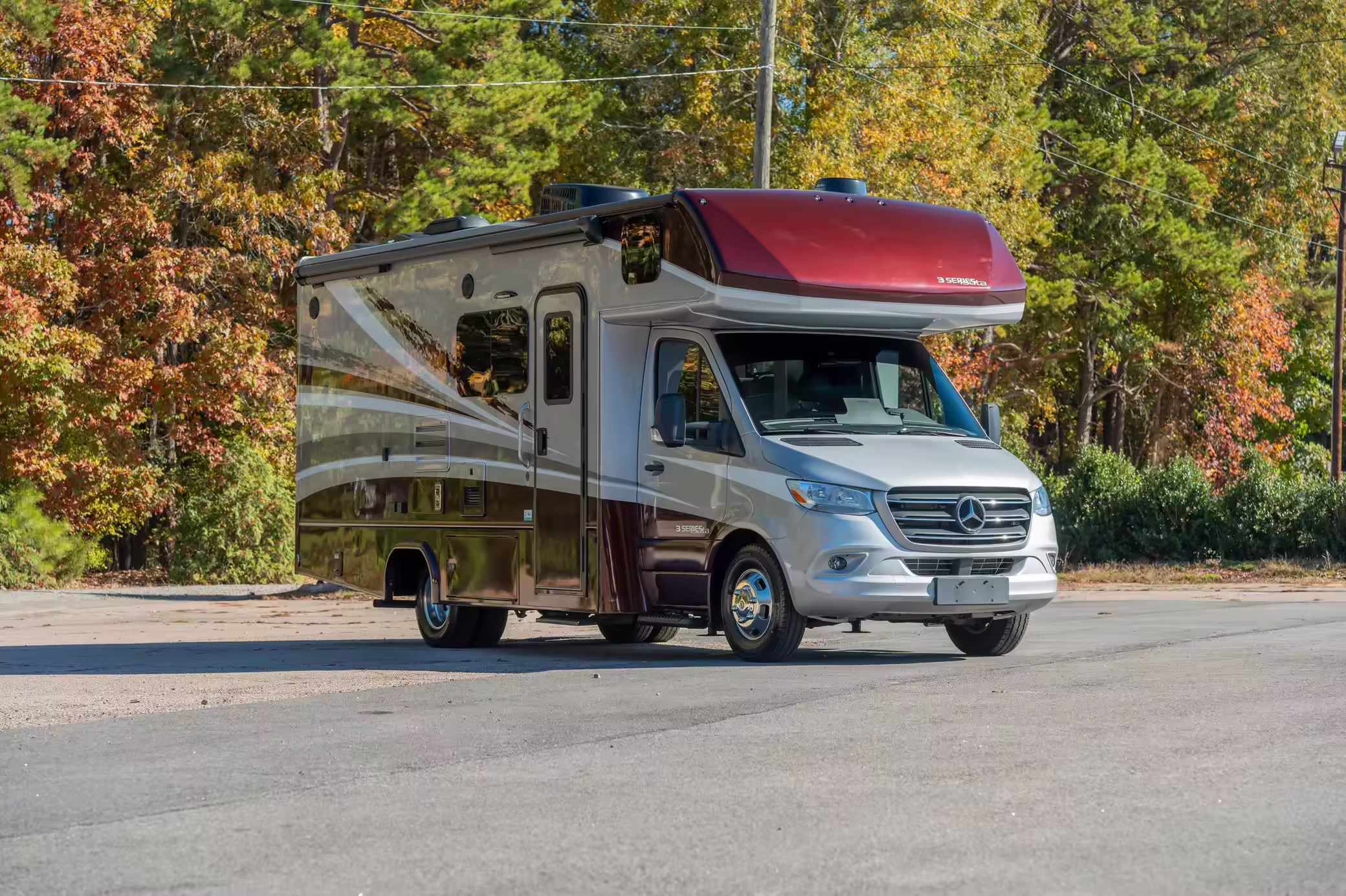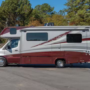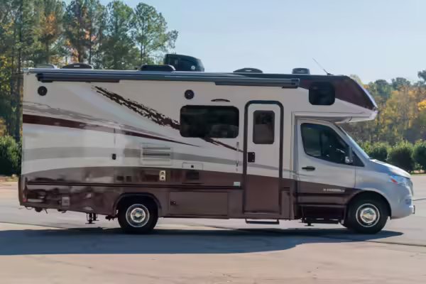 This Sprinter has been converted to a camper by Indiana-based Dynamax with their Class C Motorhome Isata 3 Series package. The list of modifications reported by the seller includes a two-tone exterior paint, a cab-over bunk, a driver-side wall slide, an awning, a kitchenette, a refrigerator, a queen bed, a 3-seat power-reclining sofa, and a toilet with a shower.