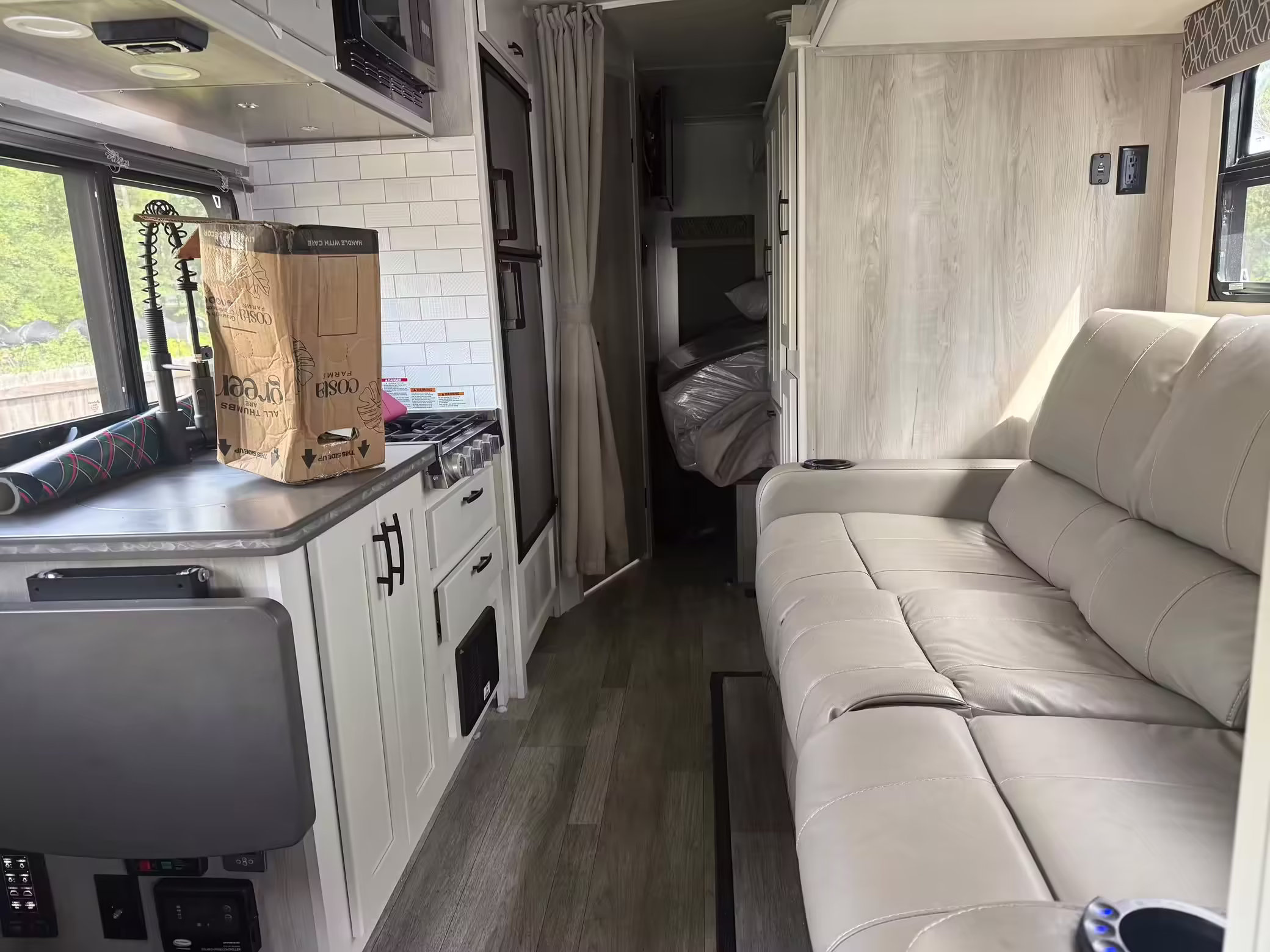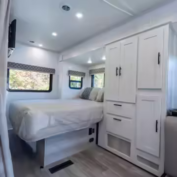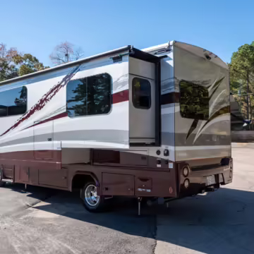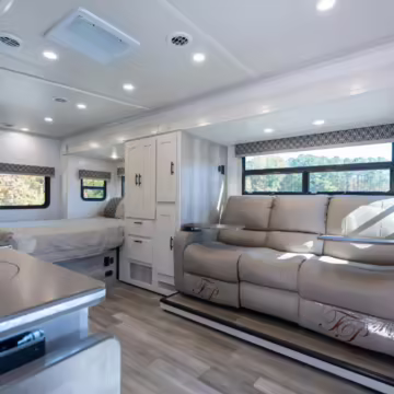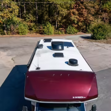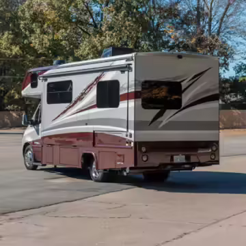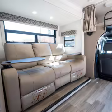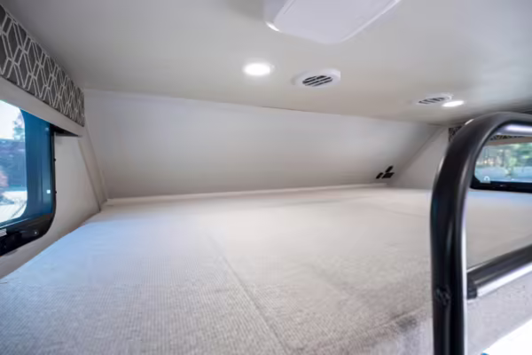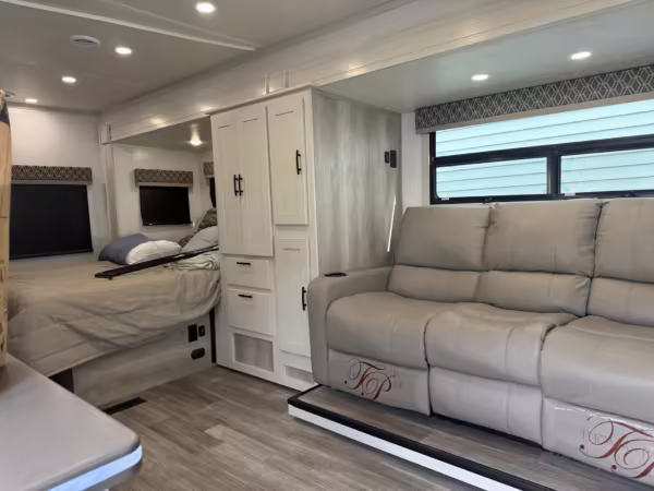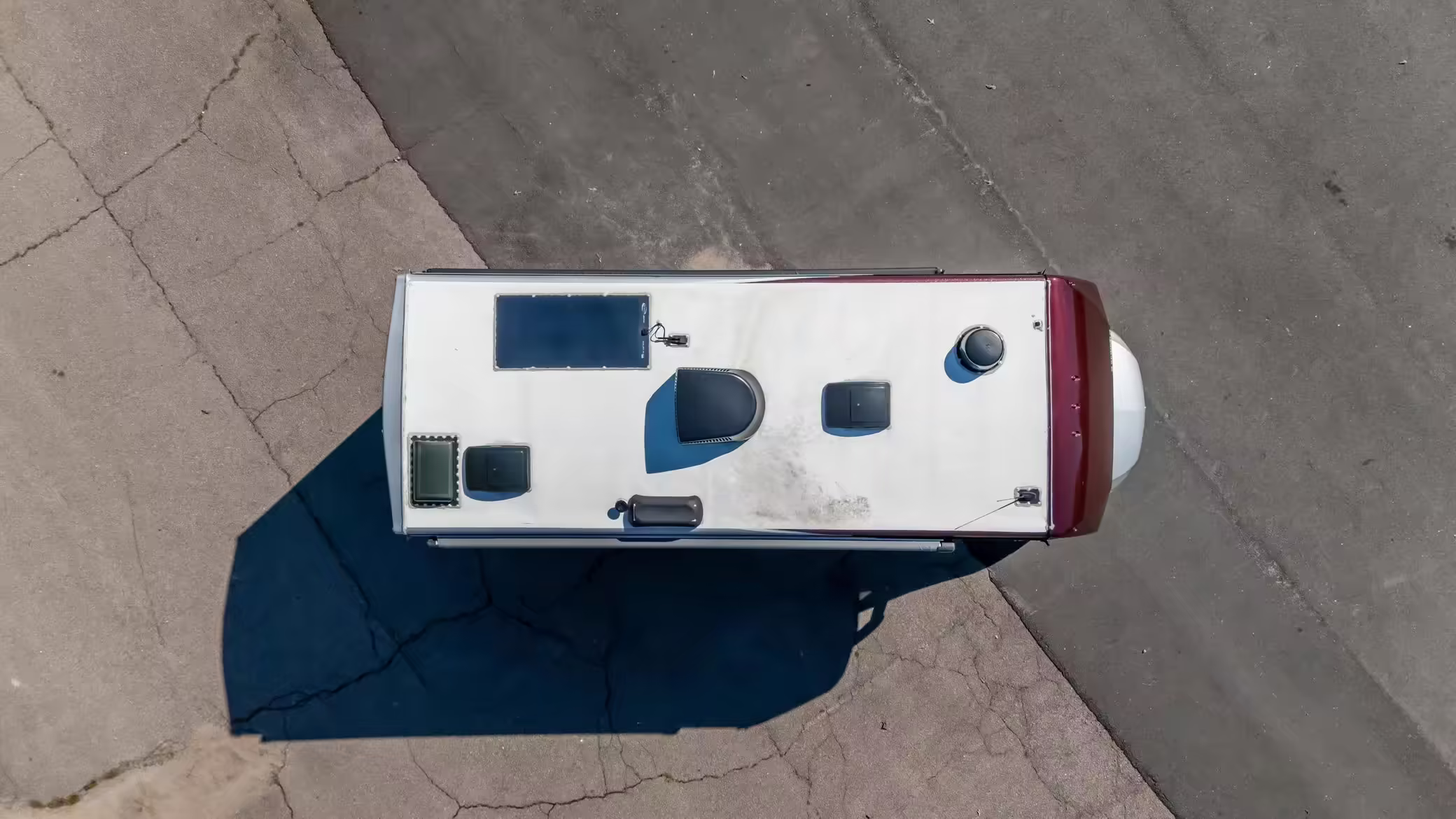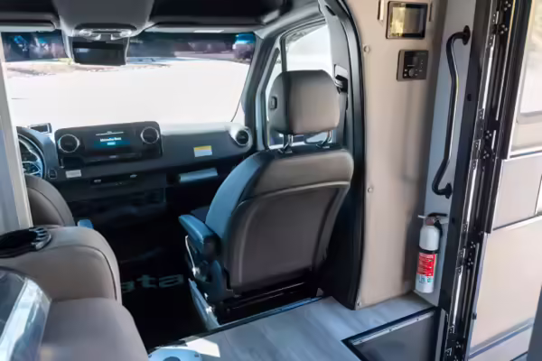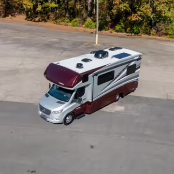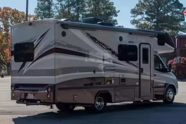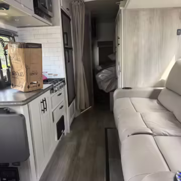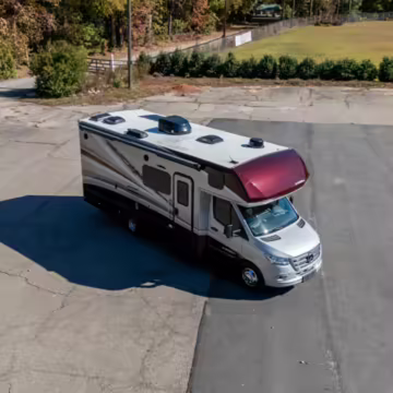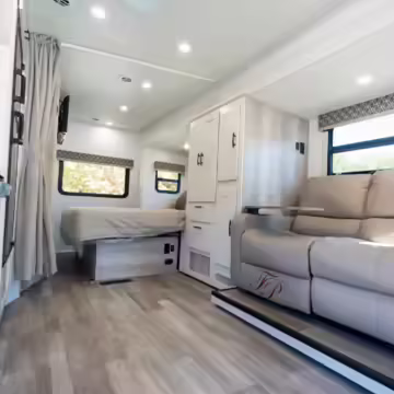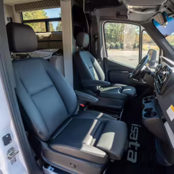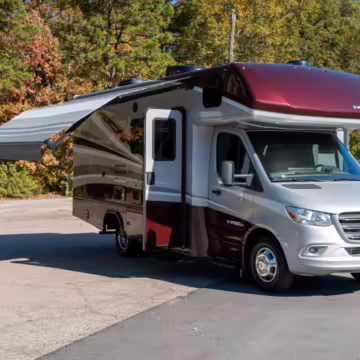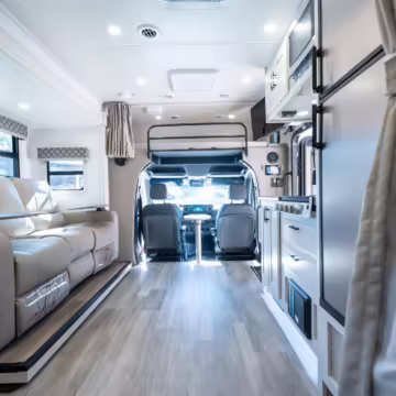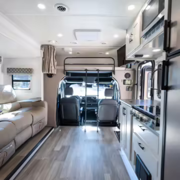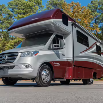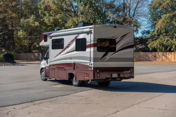 This Sprinter has been converted to a camper by Indiana-based Dynamax with their Class C Motorhome Isata 3 Series package. The list of modifications reported by the seller includes a two-tone exterior paint, a cab-over bunk, a driver-side wall slide, an awning, a kitchenette, a refrigerator, a queen bed, a 3-seat power-reclining sofa, and a toilet with a shower.