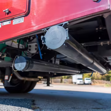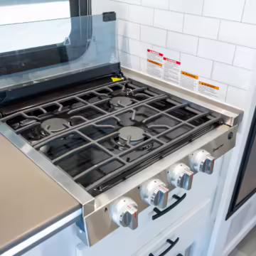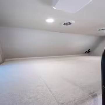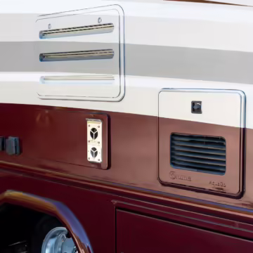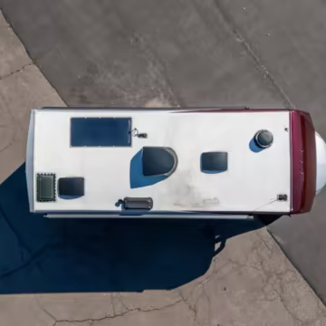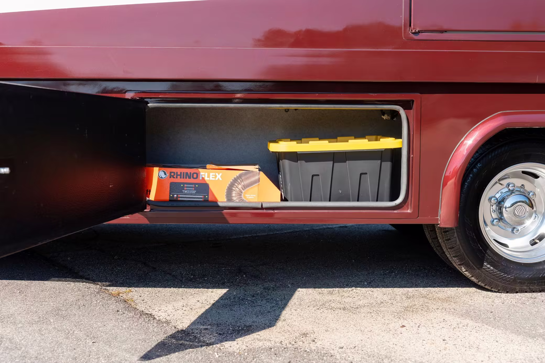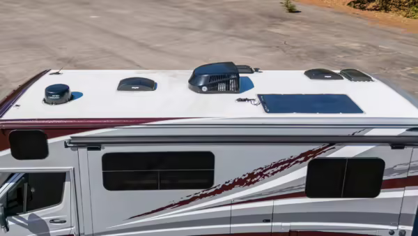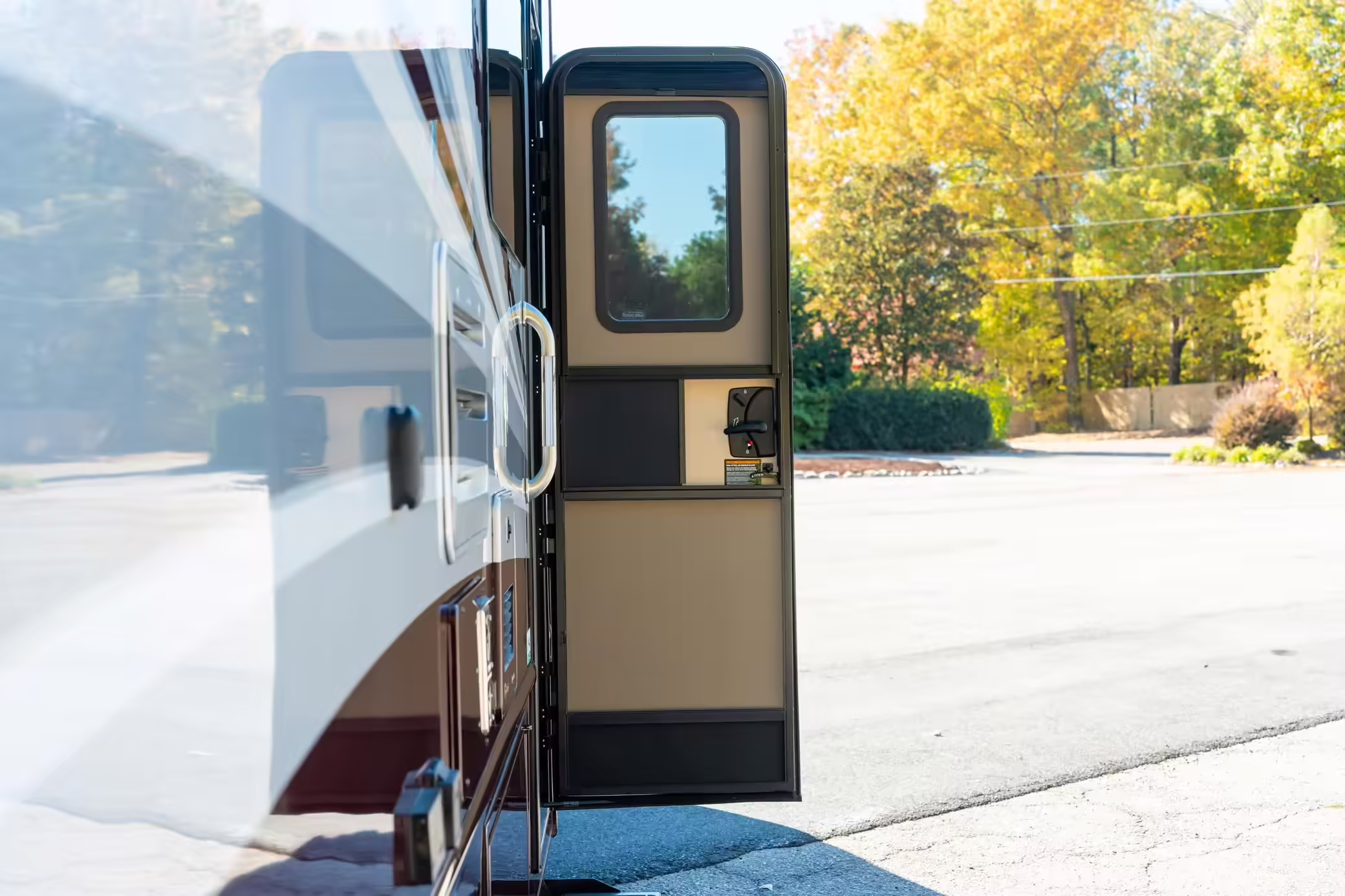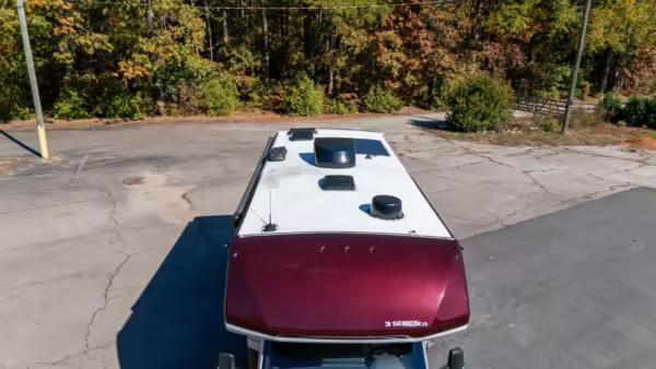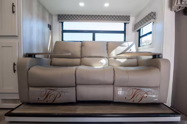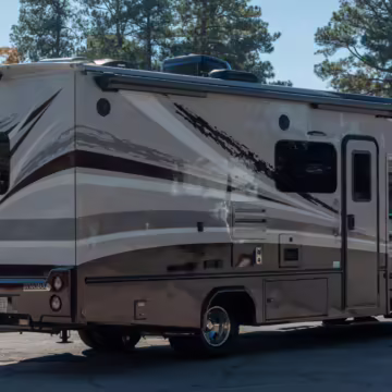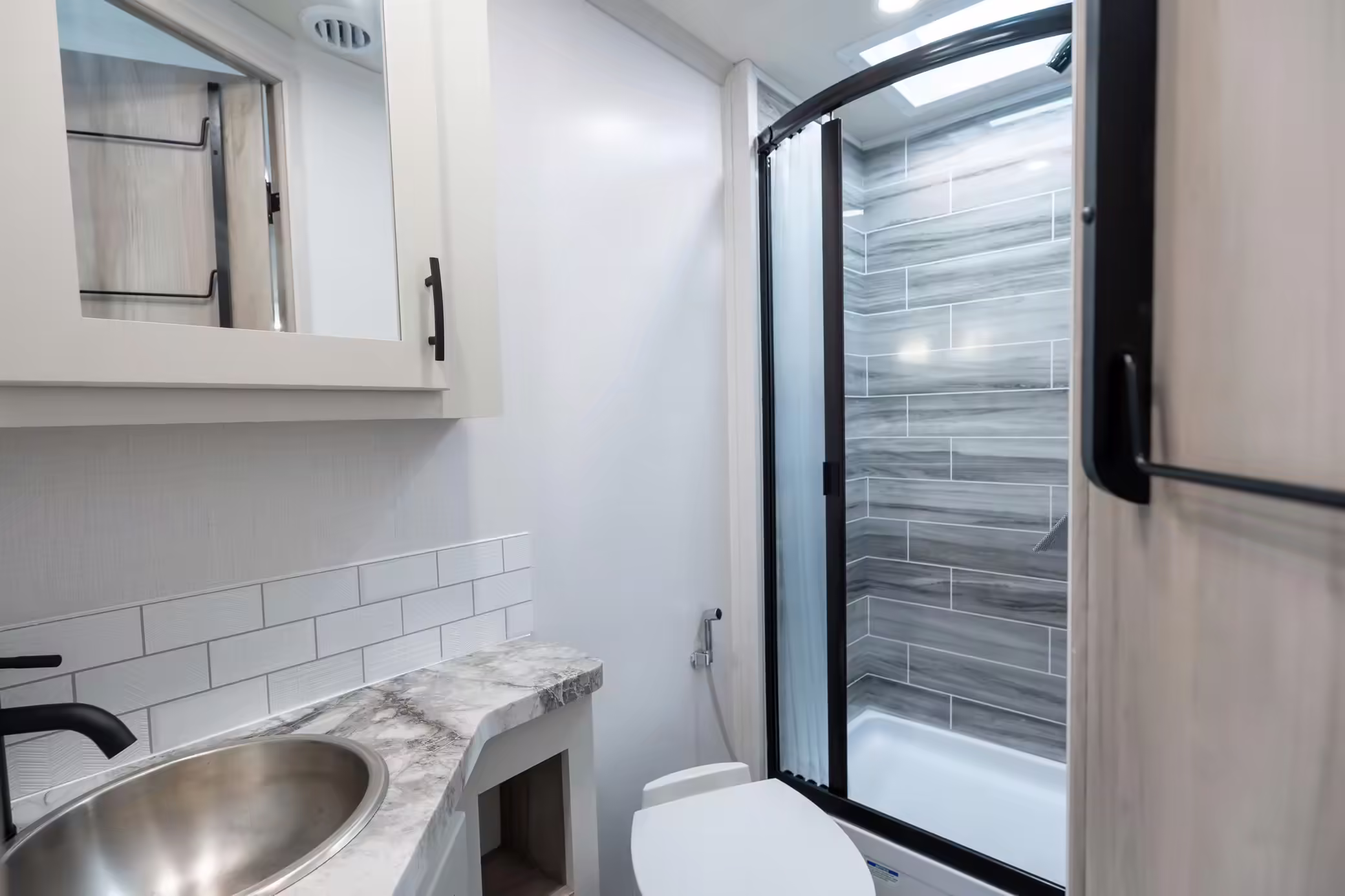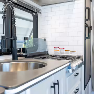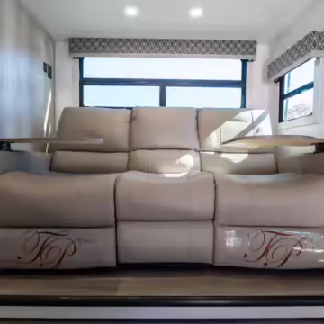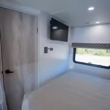 This Sprinter has been converted to a camper by Indiana-based Dynamax with their Class C Motorhome Isata 3 Series package. The list of modifications reported by the seller includes a two-tone exterior paint, a cab-over bunk, a driver-side wall slide, an awning, a kitchenette, a refrigerator, a queen bed, a 3-seat power-reclining sofa, and a toilet with a shower.
